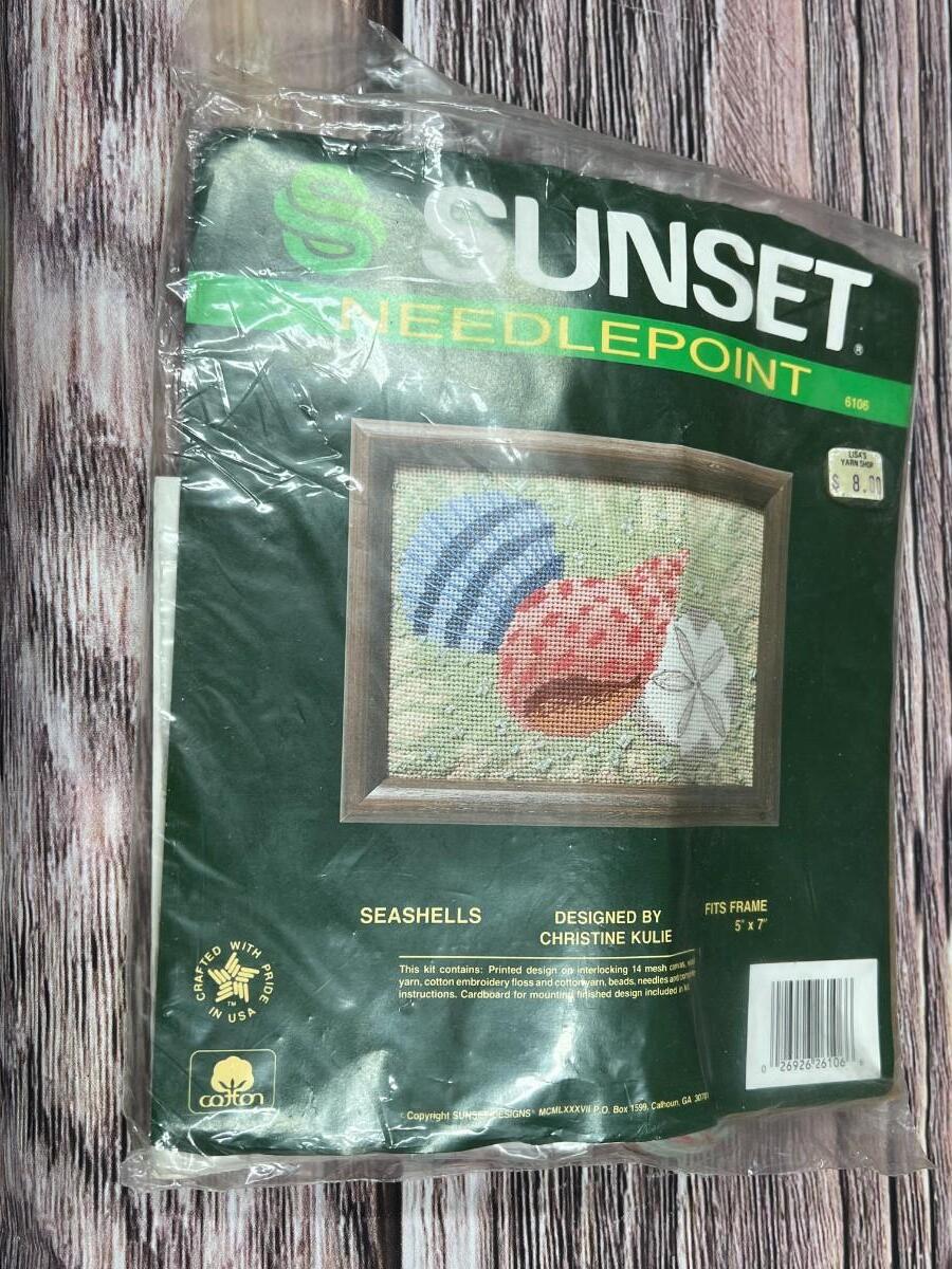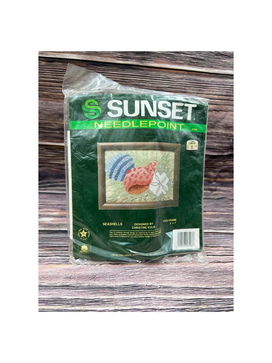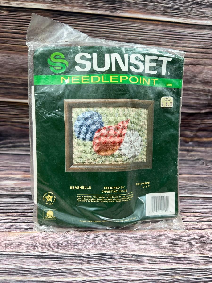 Vintage Unused Sunset Needlepoint Kit Seashells Design by Christine Kulie, the kit is unopened and is in good useable condition. Check pictures for more details and for sizing.
