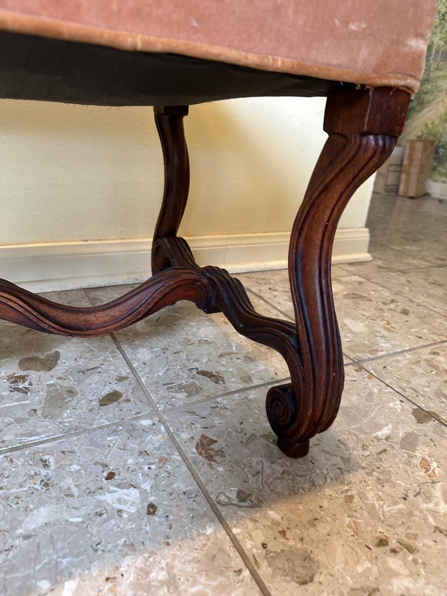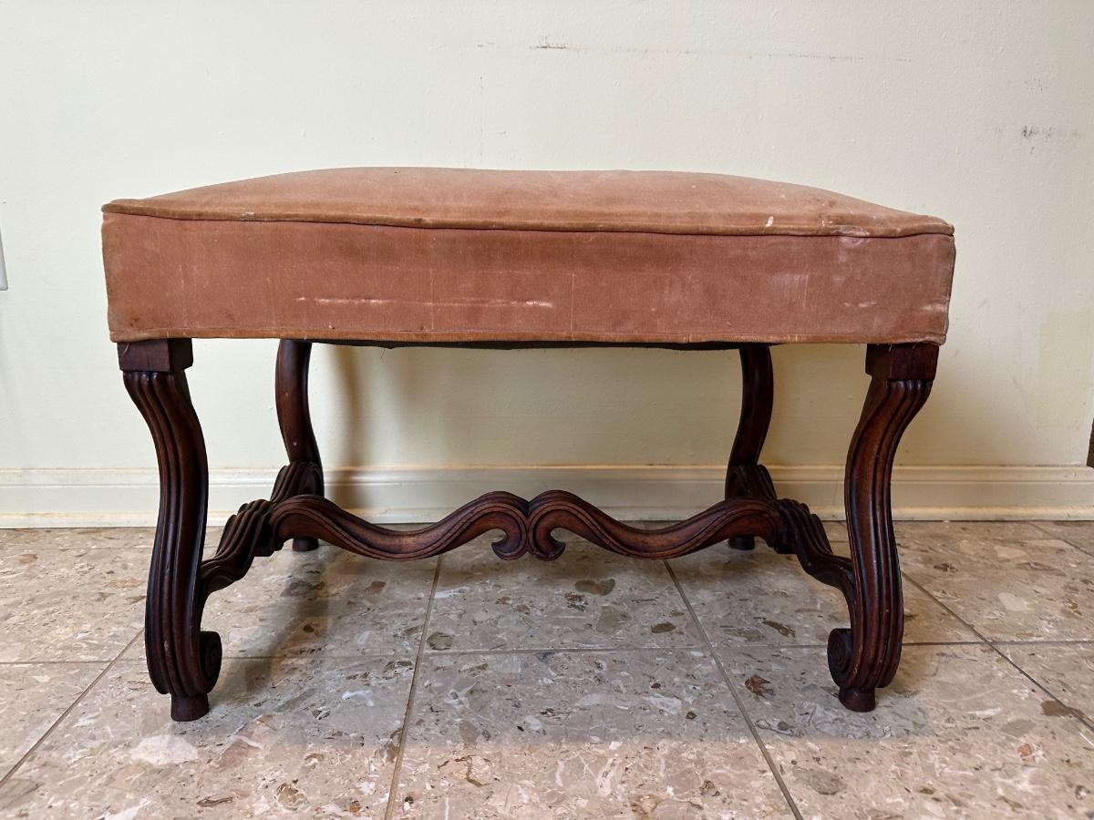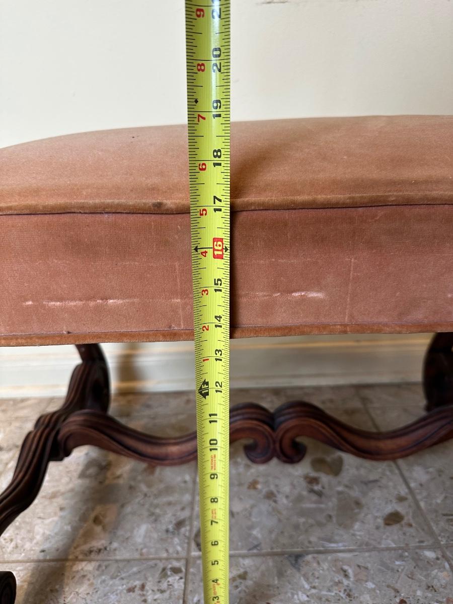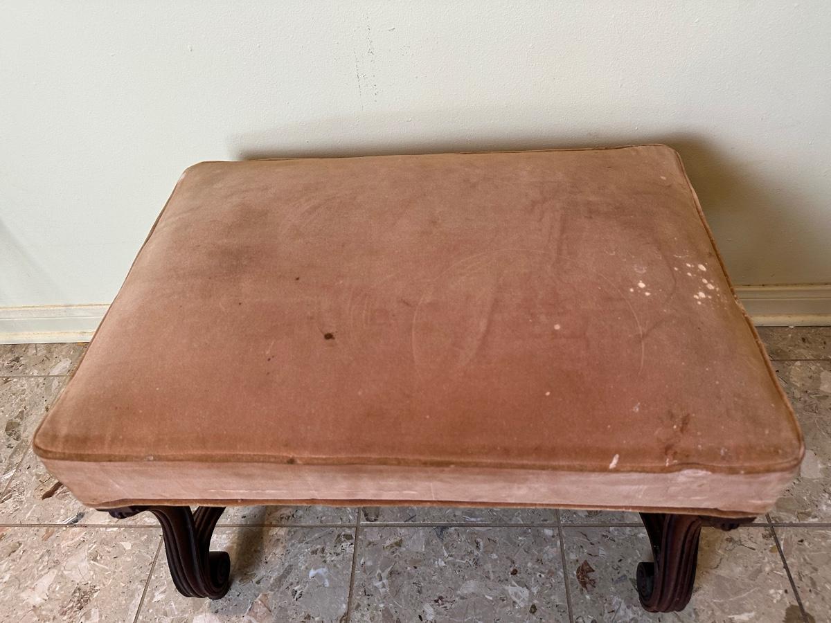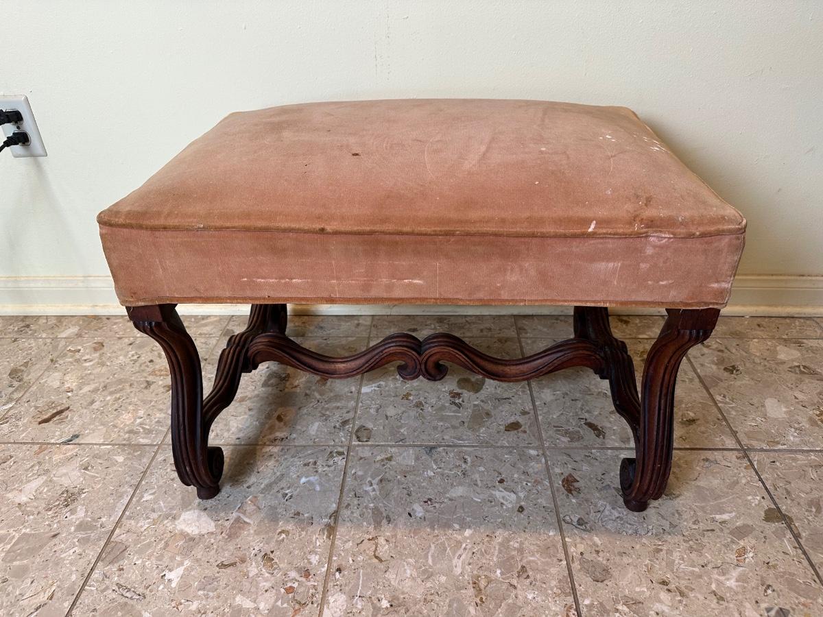 Solid frame with decorative carved details. Upholstered seat in worn velvet fabric with visible wear and spotting, ideal candidate for reupholstery.