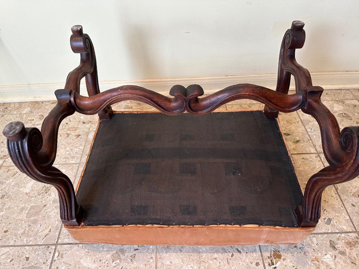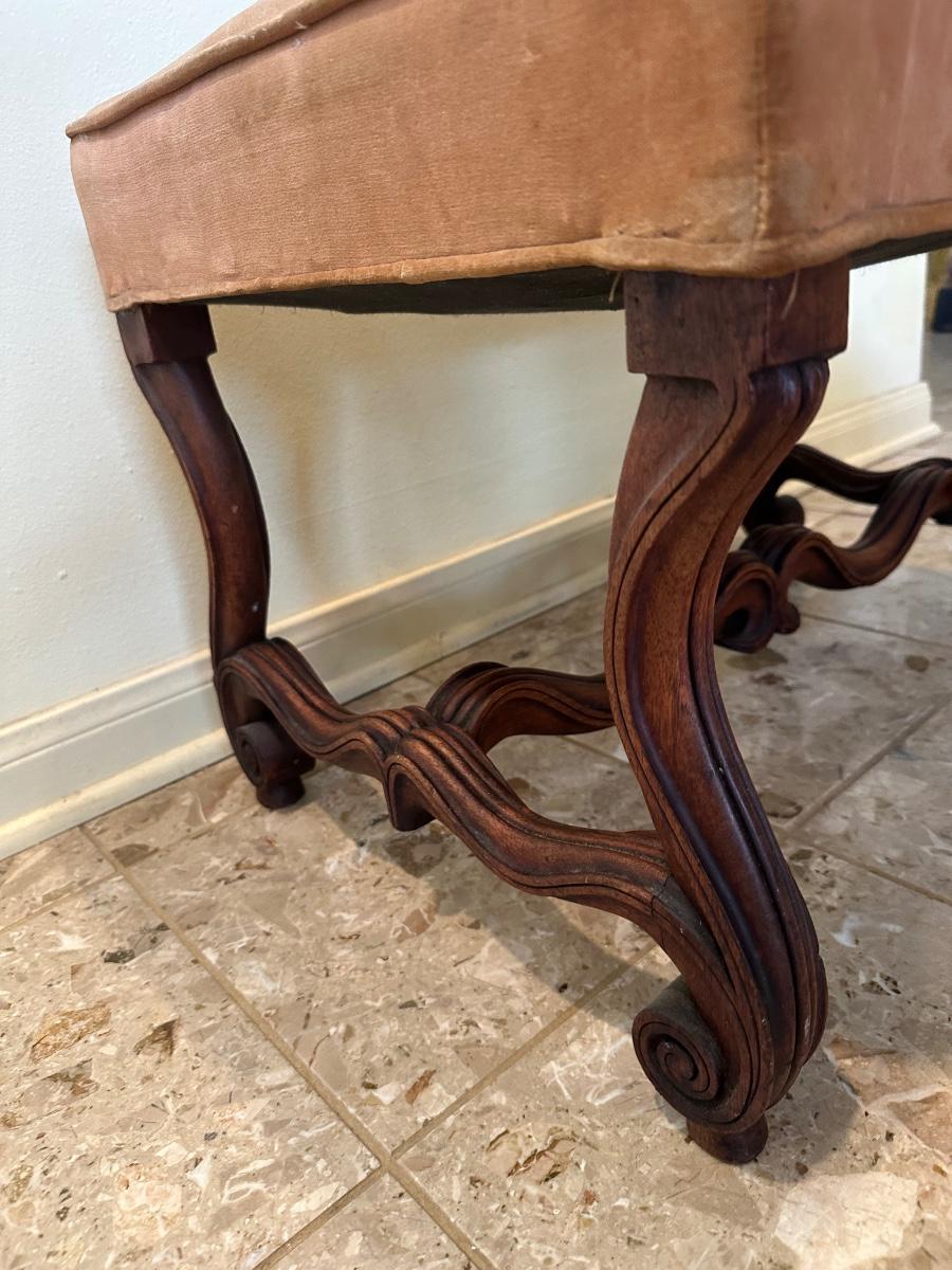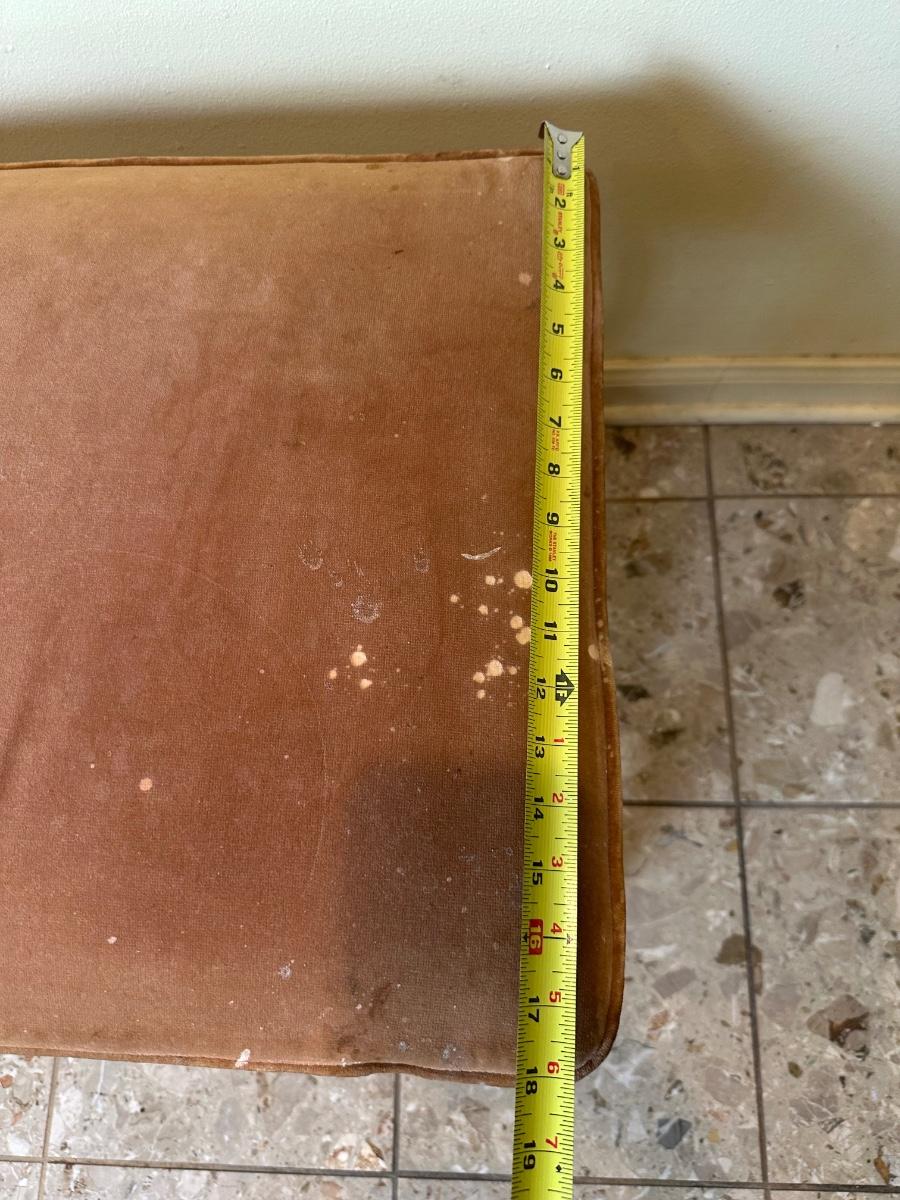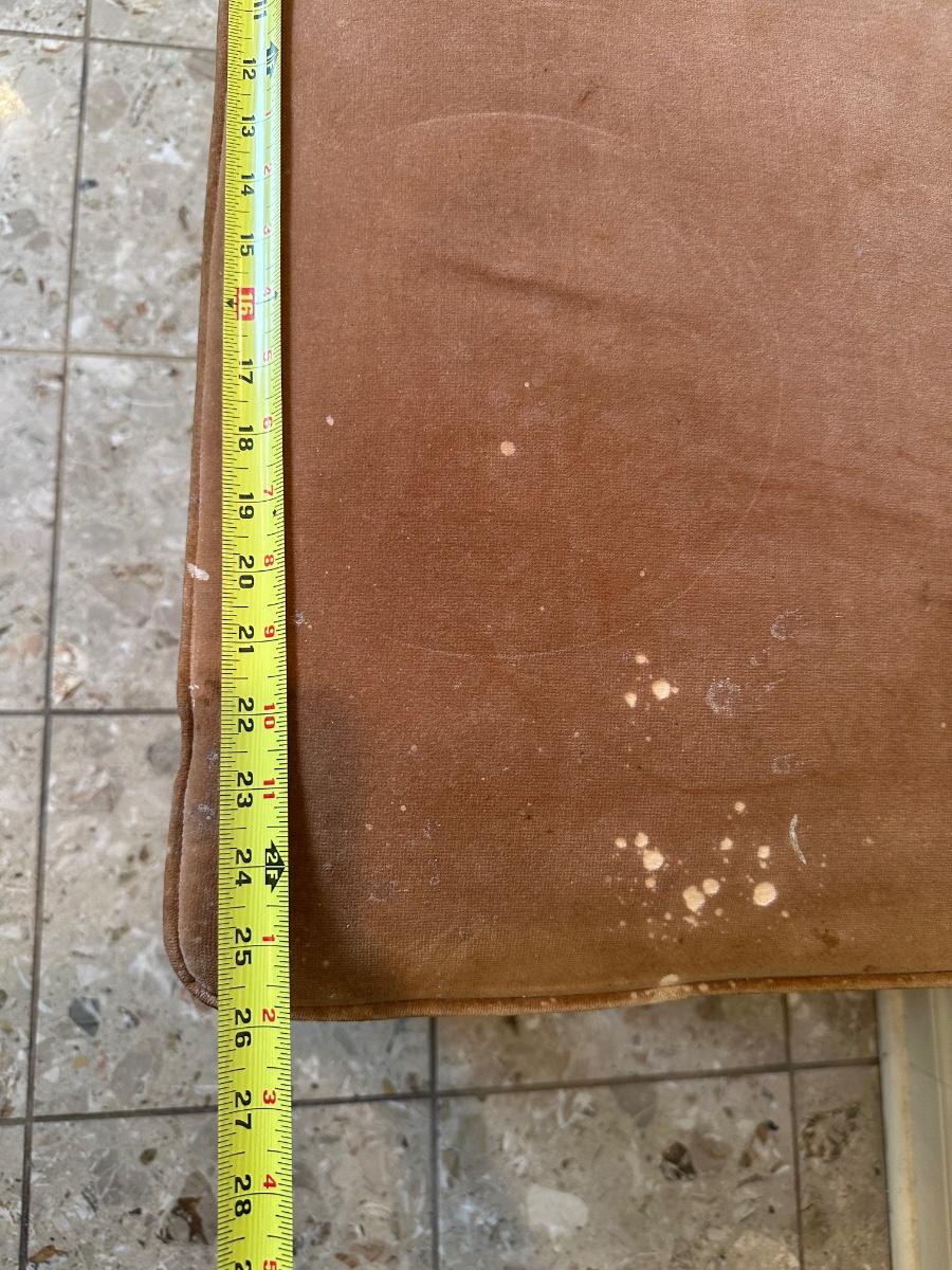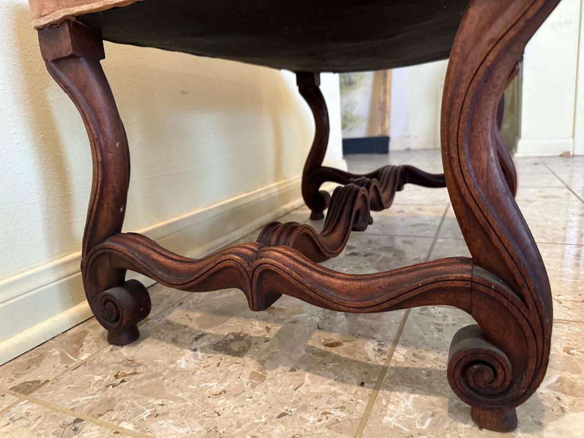 Solid frame with decorative carved details. Upholstered seat in worn velvet fabric with visible wear and spotting, ideal candidate for reupholstery.