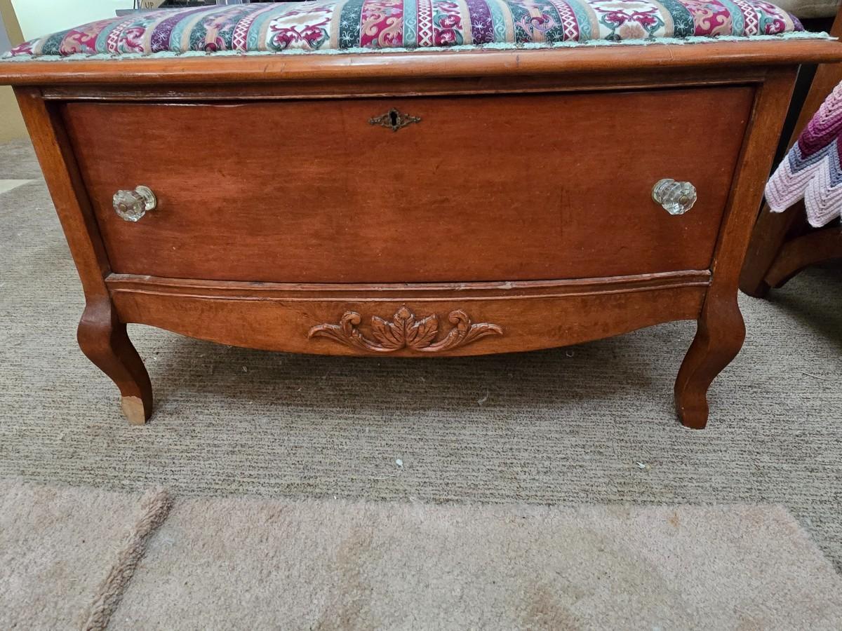 Add vintage charm and practical storage to your space with this unique upholstered trunk, Possibly, repurposed from an antique dresser base. Featuring carved wood details, curved legs, and glass drawer pulls, it offers both visual appeal and function. The cushioned top is upholstered in a richly patterned fabric with floral and stripe motifs in jewel tones.