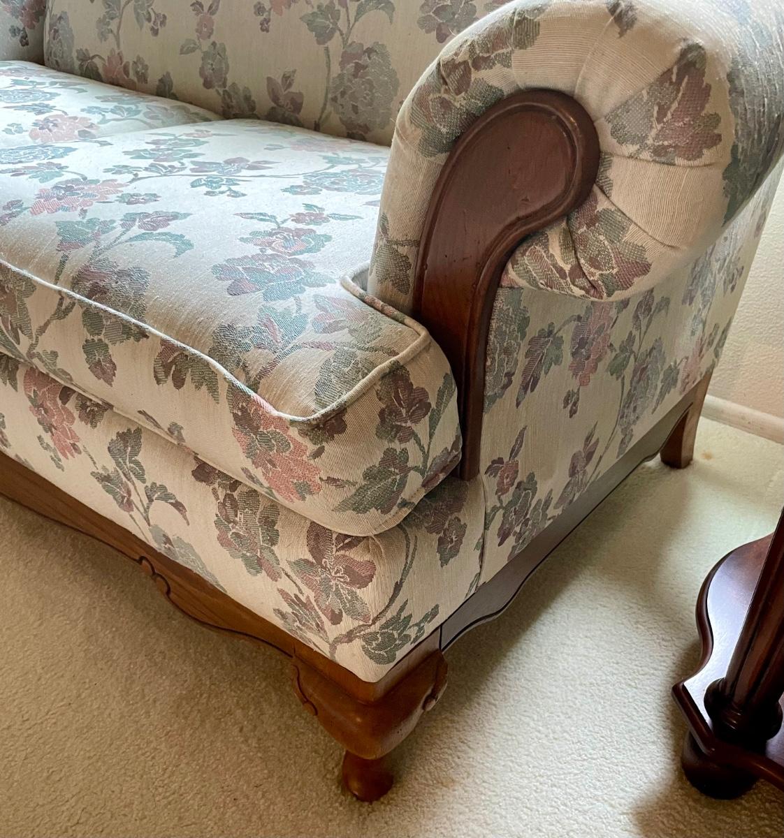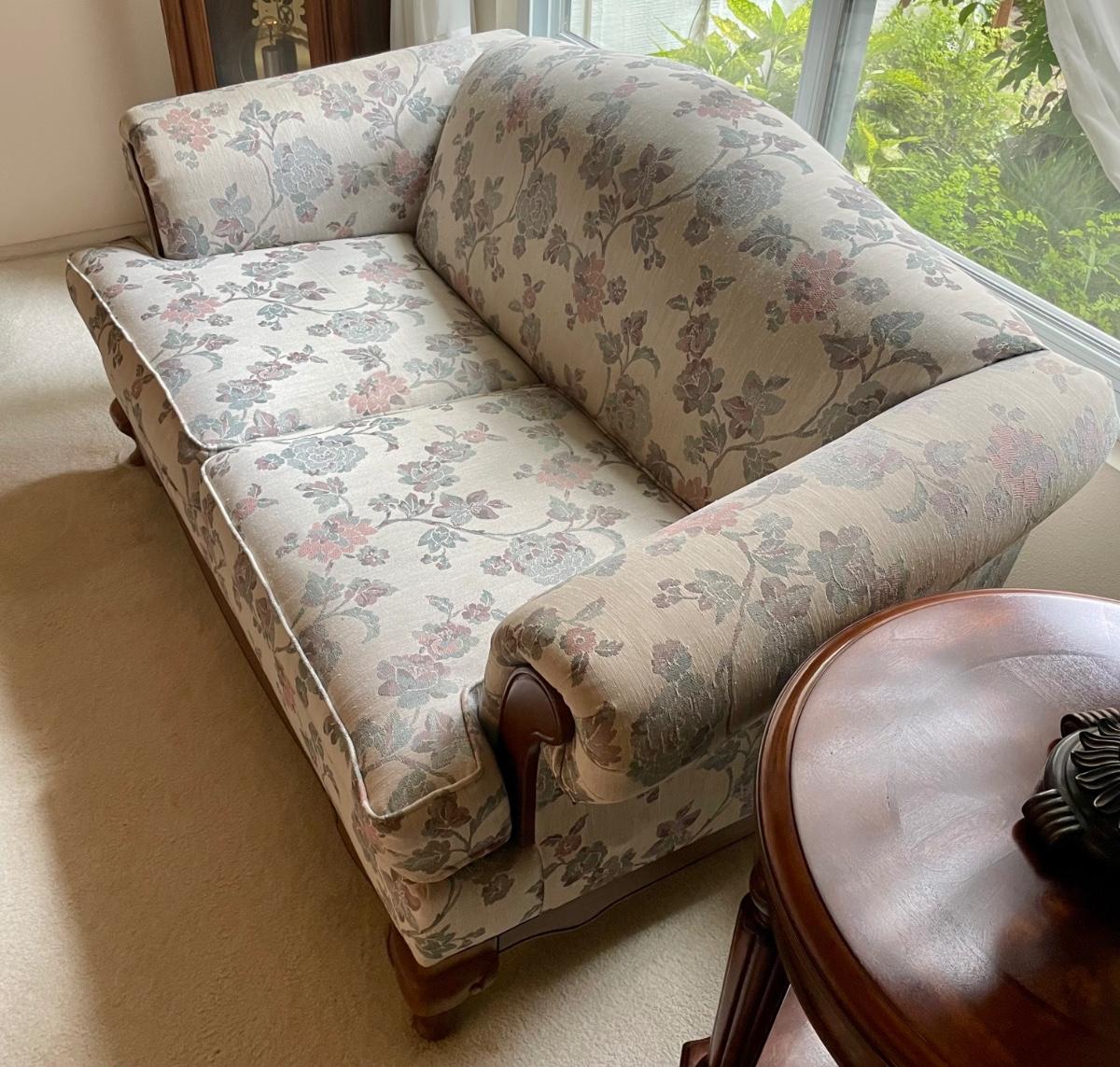 approx. 60” wide x 36” deep. Approx. 33” tall. Loveseat is in good condition, no holes, tears or stains. Another auction has the matching couch.