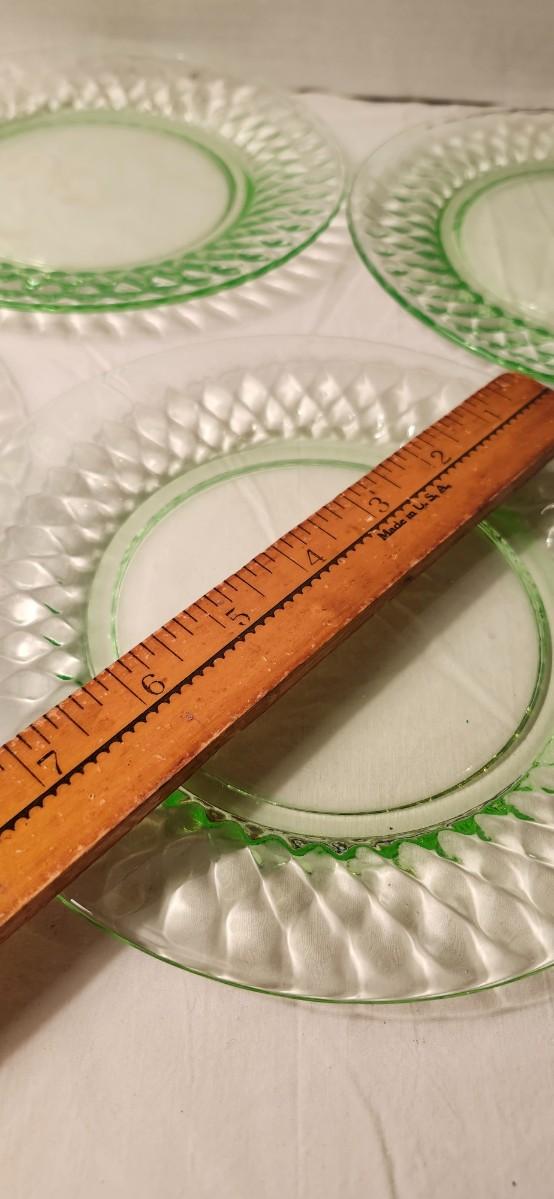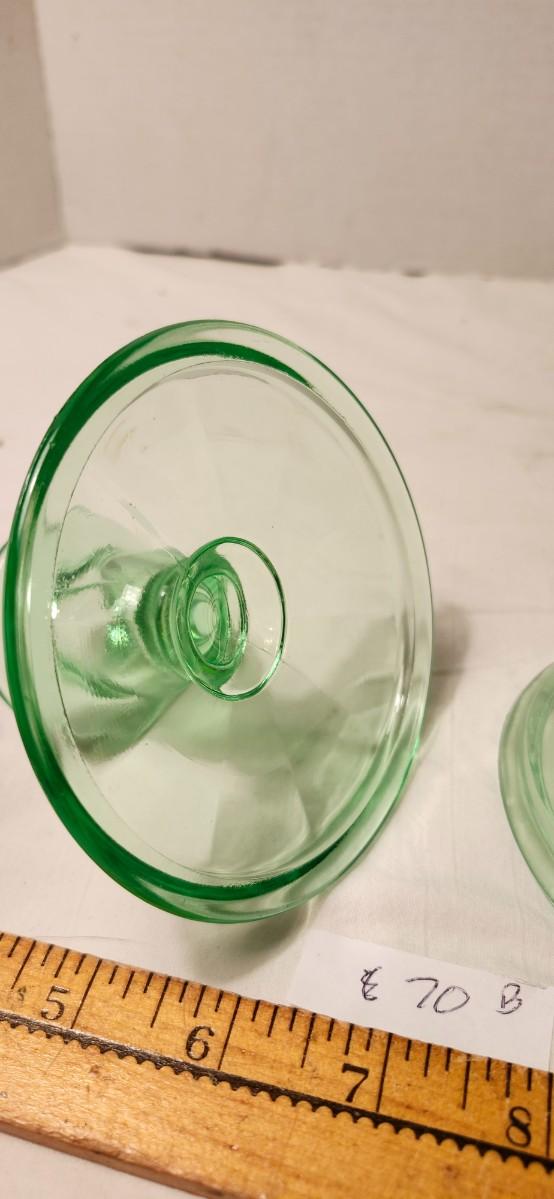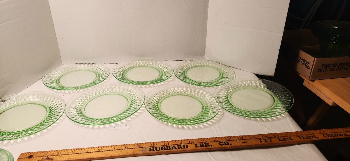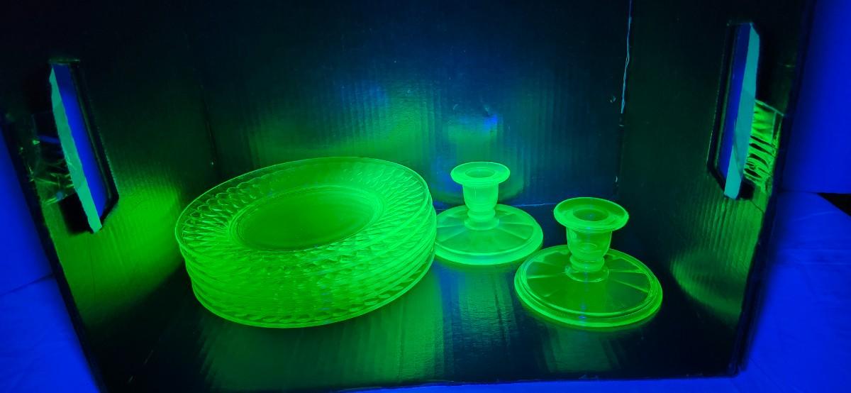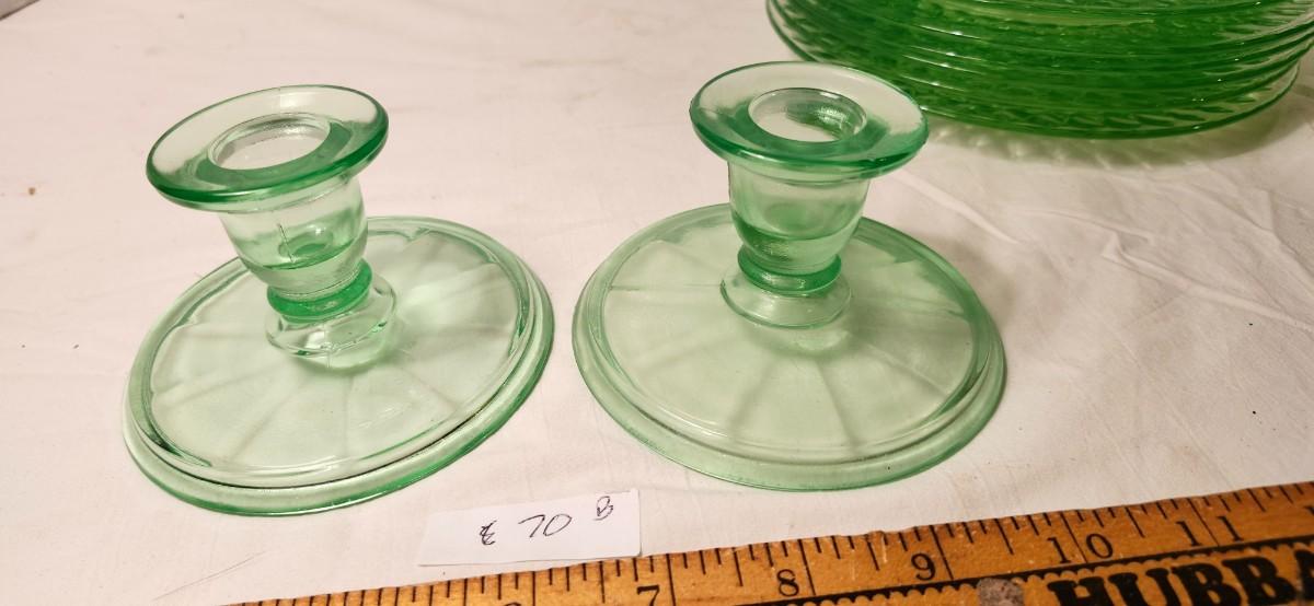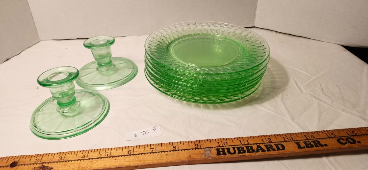Vintage Uranium Glass lot, with candlestick holders and lunch plates