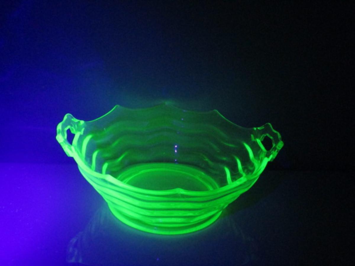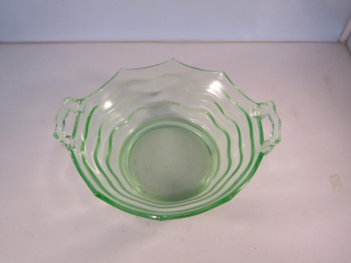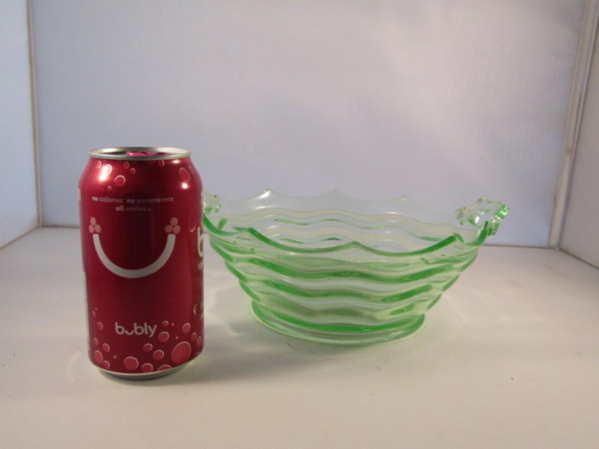 Vintage Uranium Glass Rippled Bowl with Handles- Approx 3 1/4" Tall, 8" in Diameter. Please see all pictures- small chip on rim.