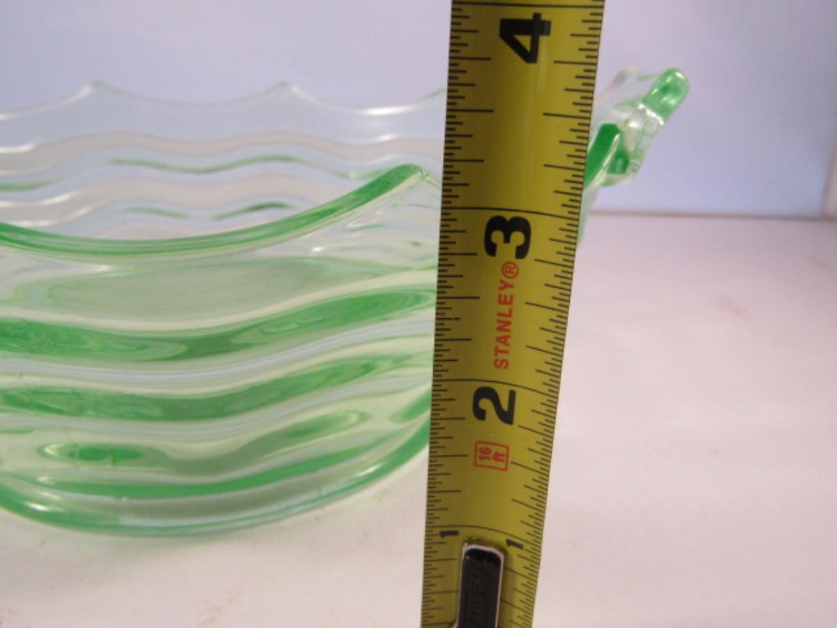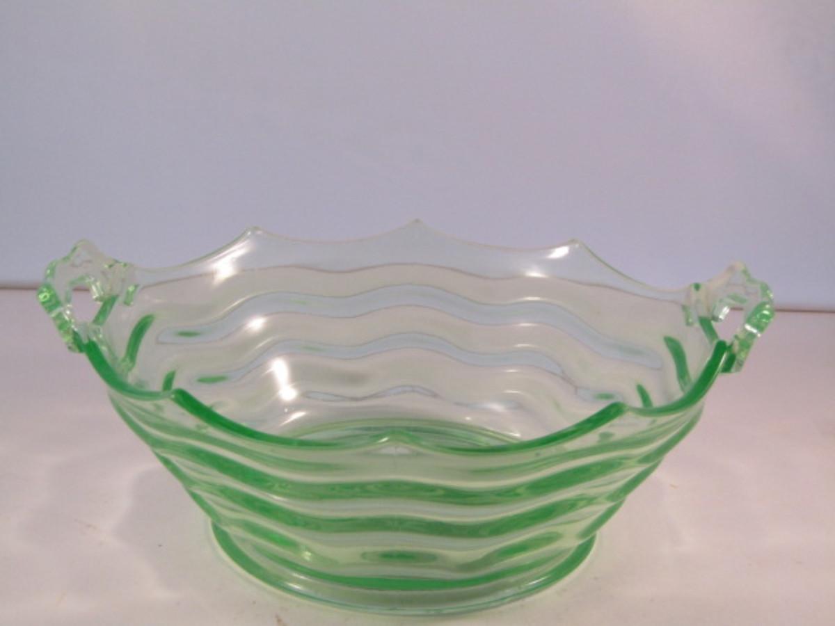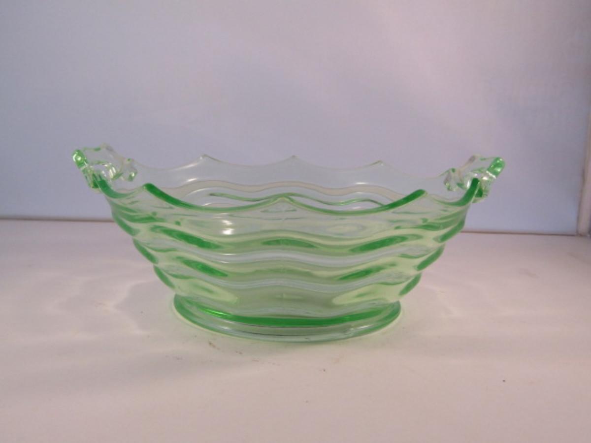 Vintage Uranium Glass Rippled Bowl with Handles- Approx 3 1/4" Tall, 8" in Diameter