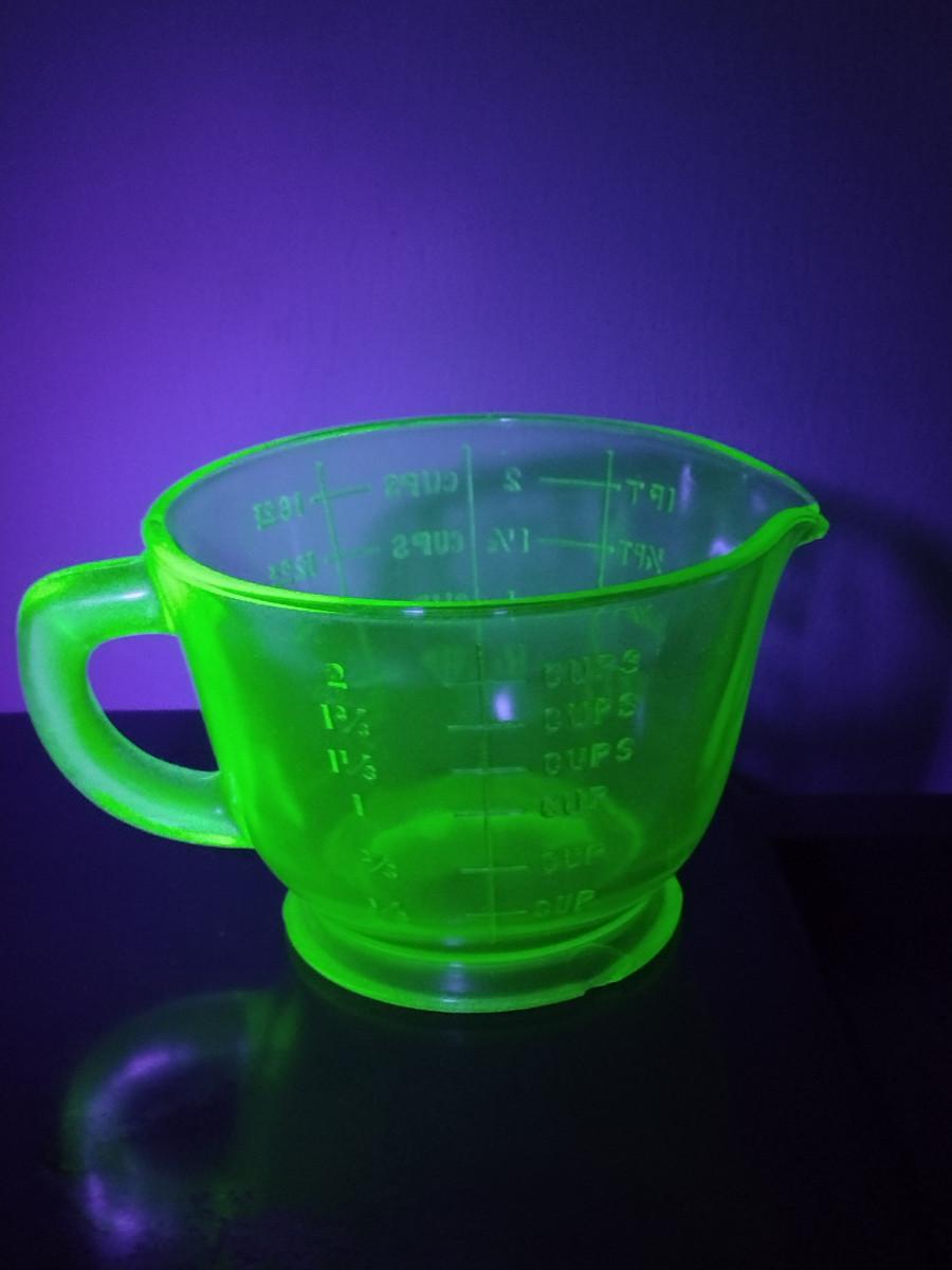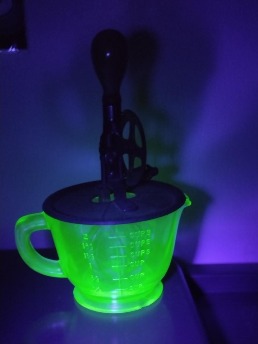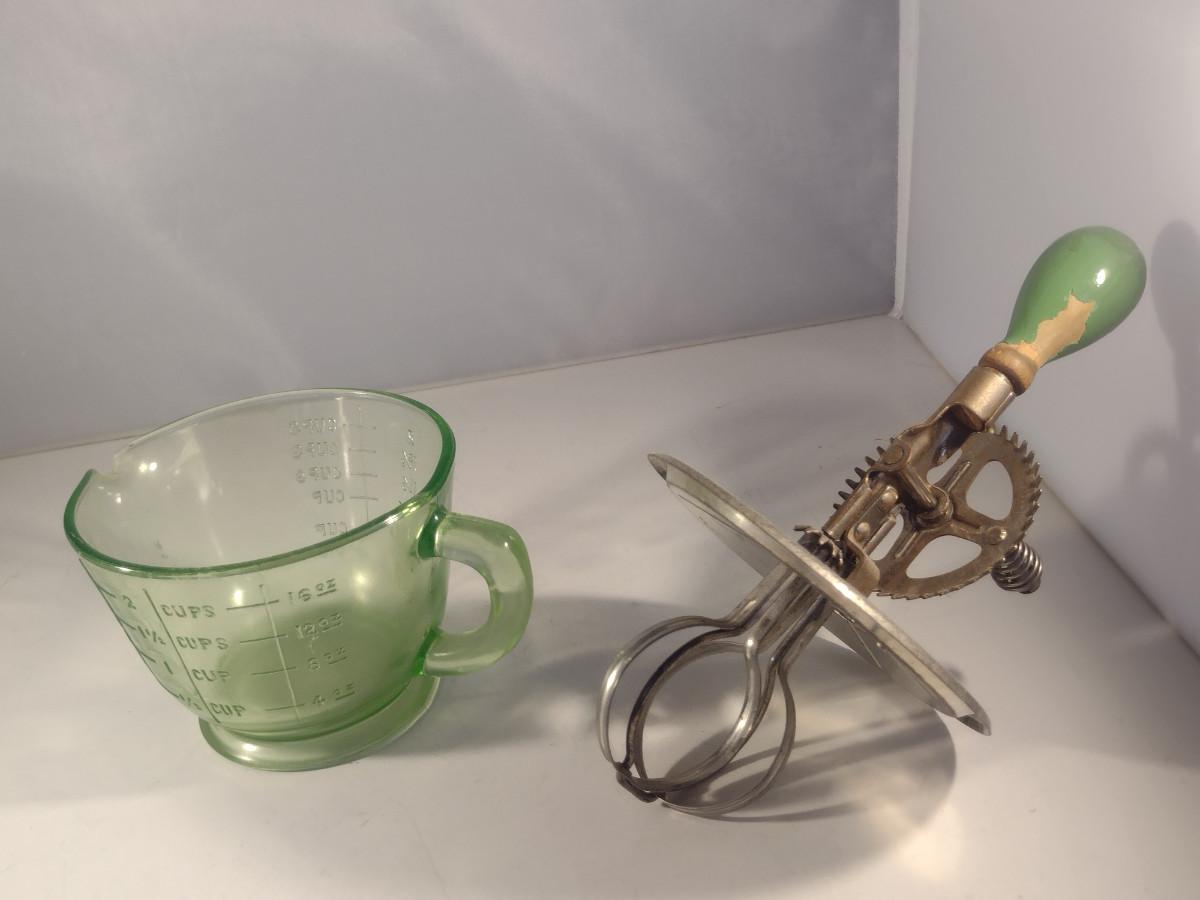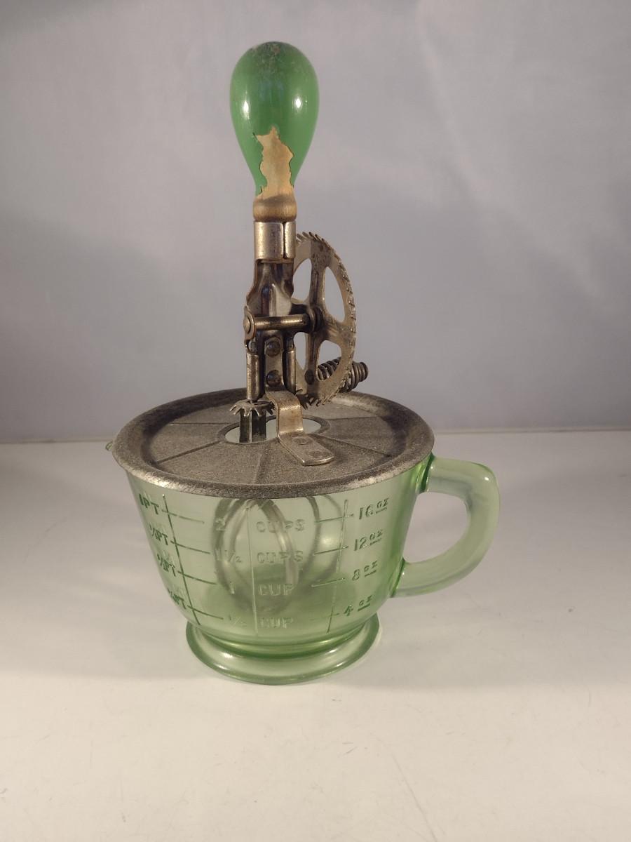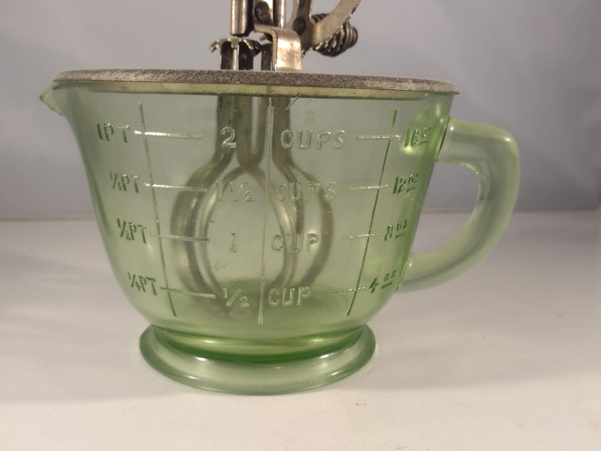 Vintage Uranium Glass Two Cup Measuring Cup with Egg Beater/Hand Mixer