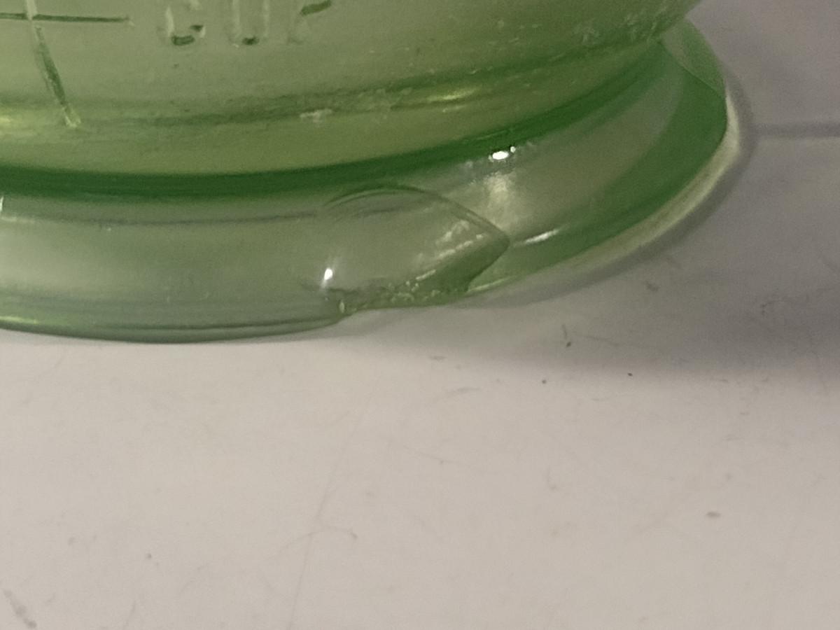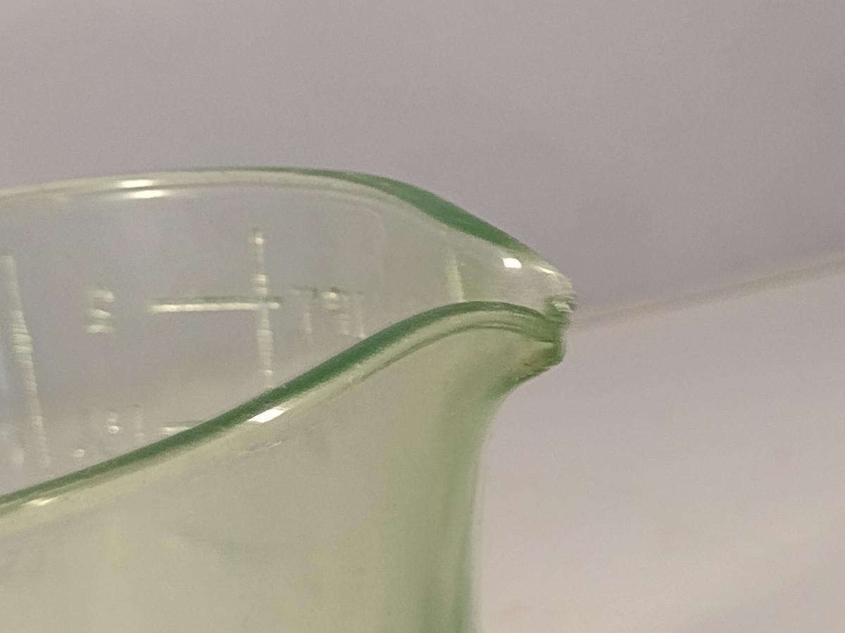 Vintage Uranium Glass Two Cup Measuring Cup with Egg Beater/Hand Mixer. Item has chipping- please see all pictures for condition.