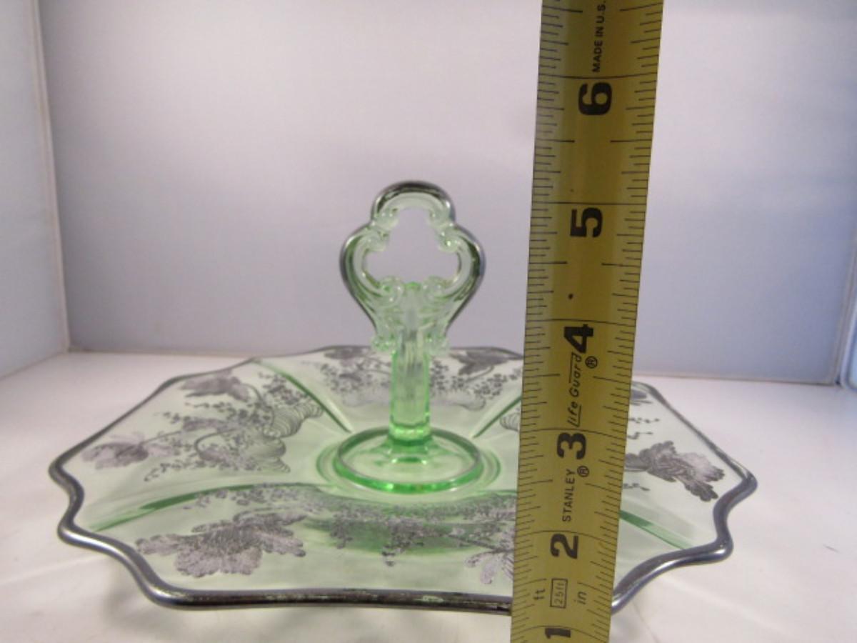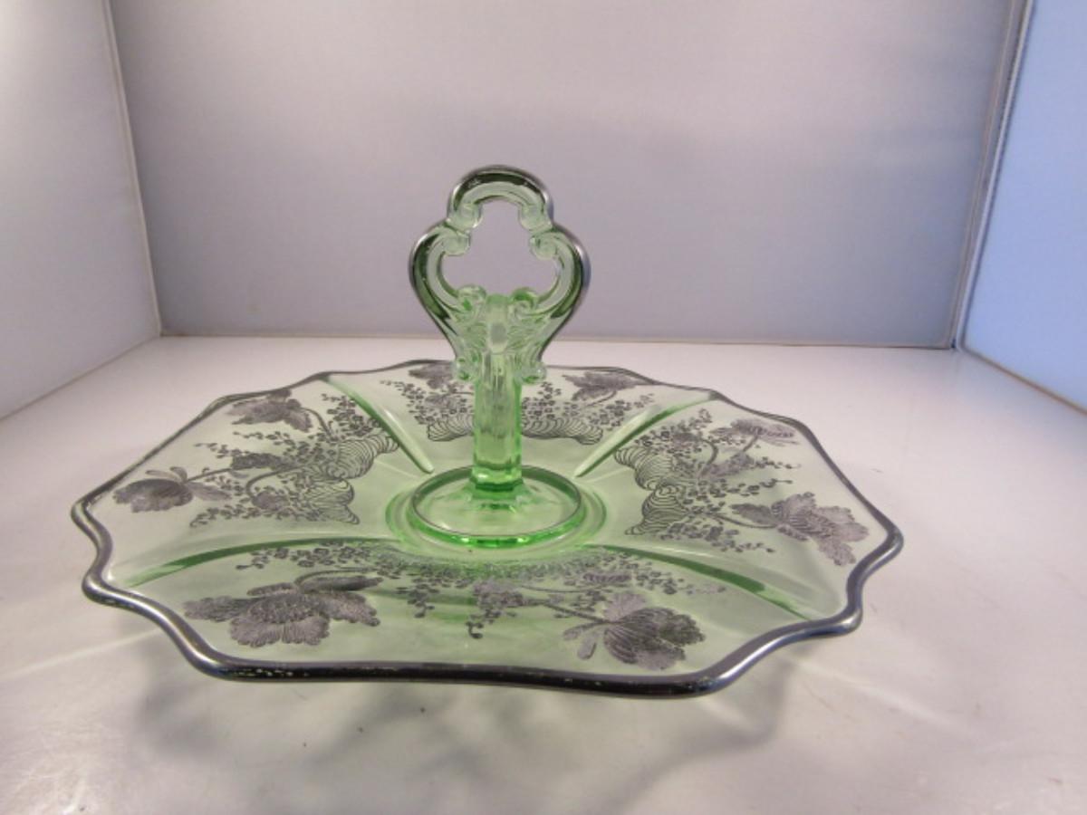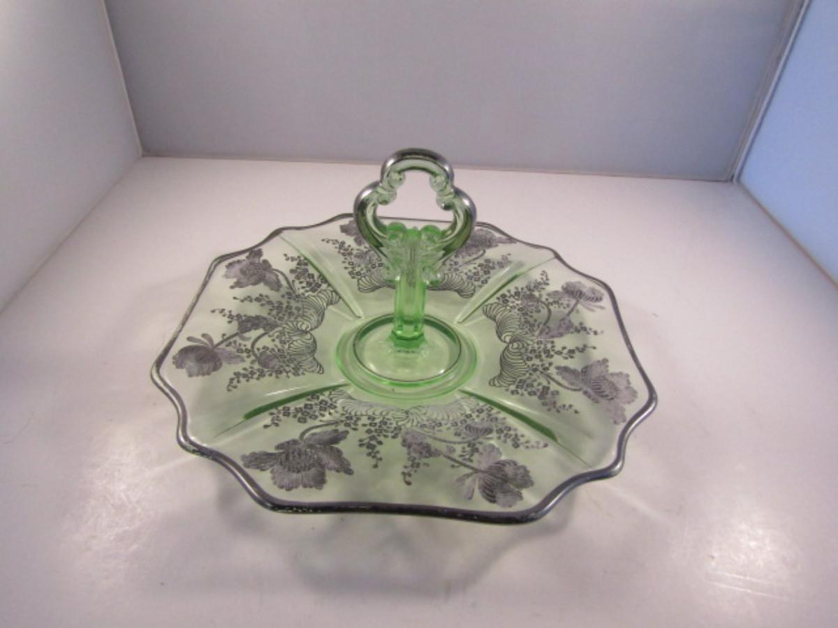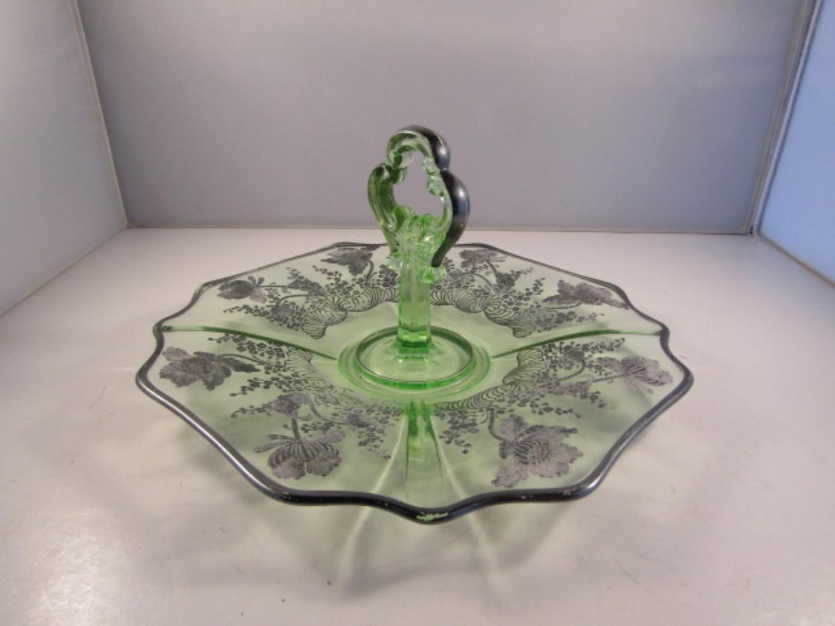 Vintage Uranium Glass with Silver Overlay Center Handle Serving Plate- Approx 10 1/2" in Diameter