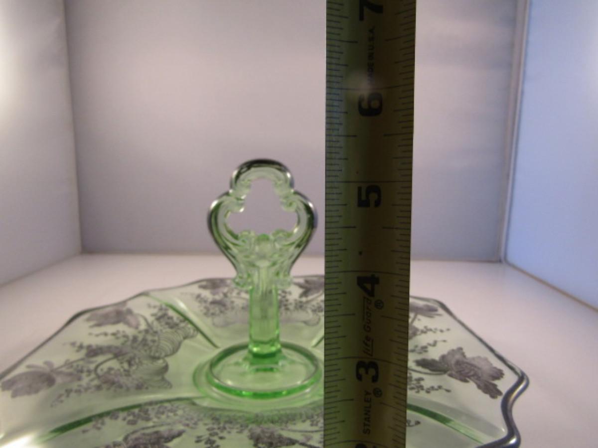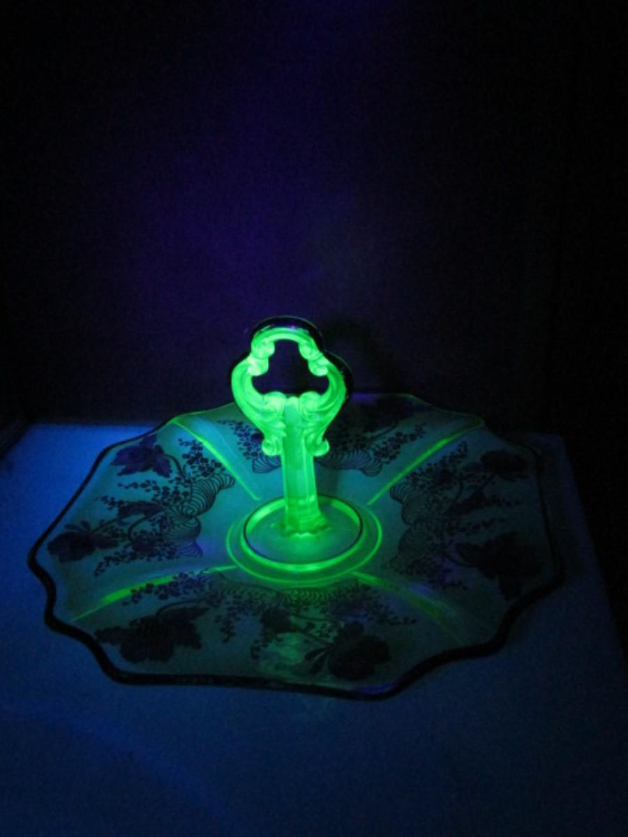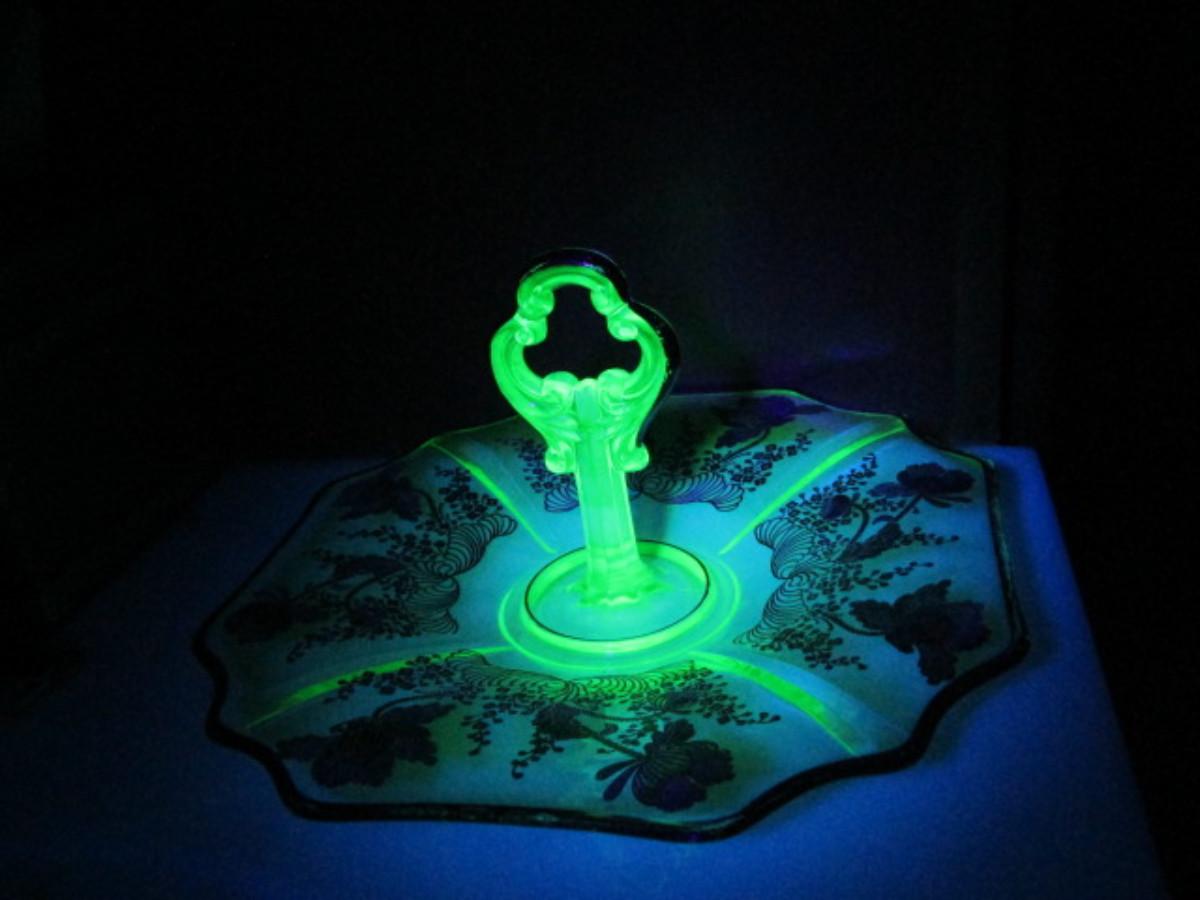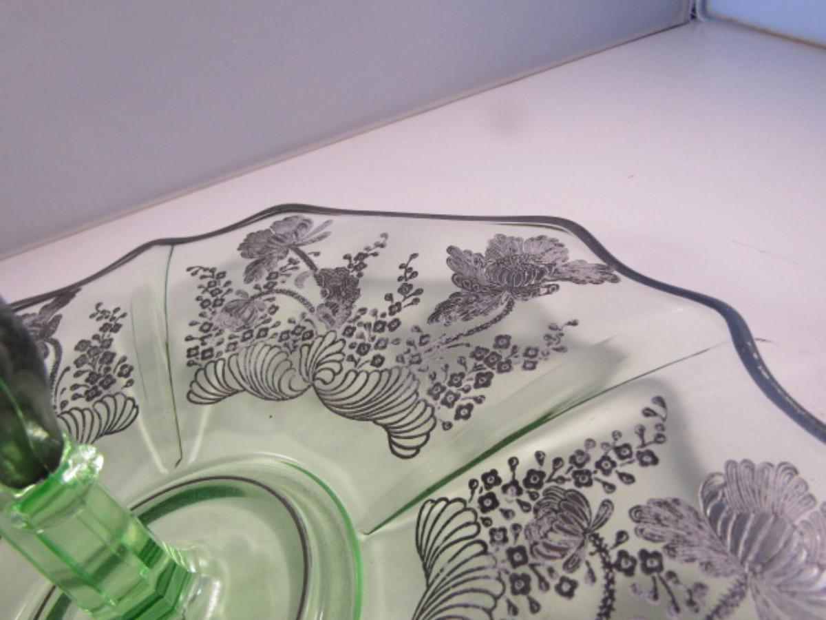 Vintage Uranium Glass with Silver Overlay Center Handle Serving Plate- Approx 10 1/2" in Diameter