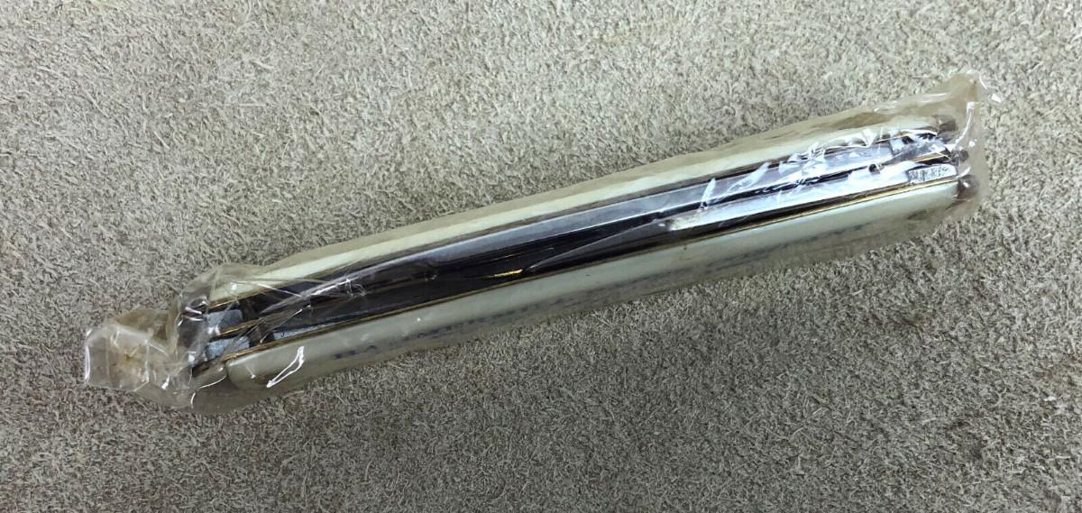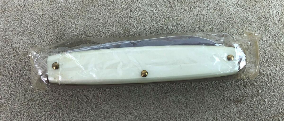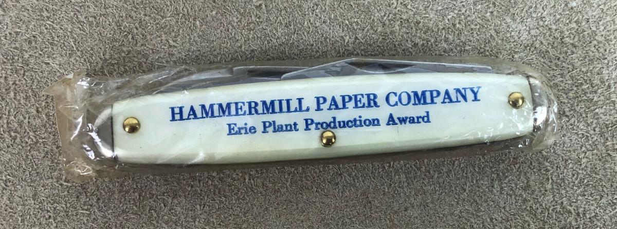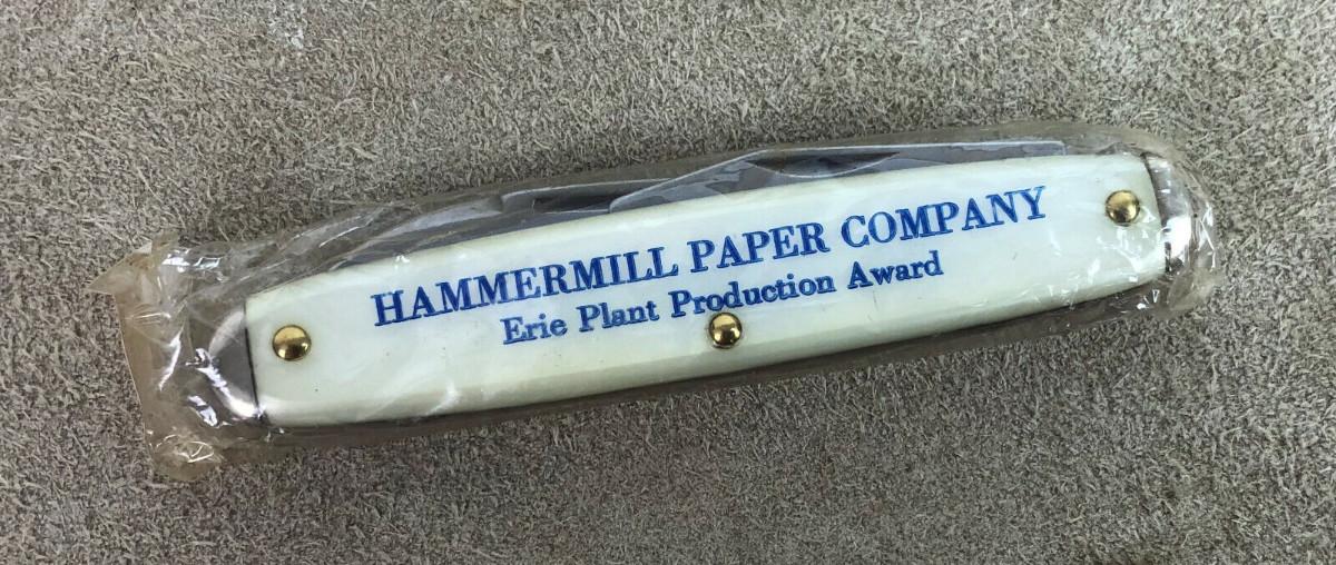 USA made two blade folding knife in new condition...Sealed in cellophane..Bears an imprint for the HAMMERMILL PAPER COMPANY..ERIE PLANT PRODUCTION AWARD..Unknown maker? Can't read tang stamp...3 3/8" closed...Appears to be a clip point blade and a screwdriver tool...As shown.
