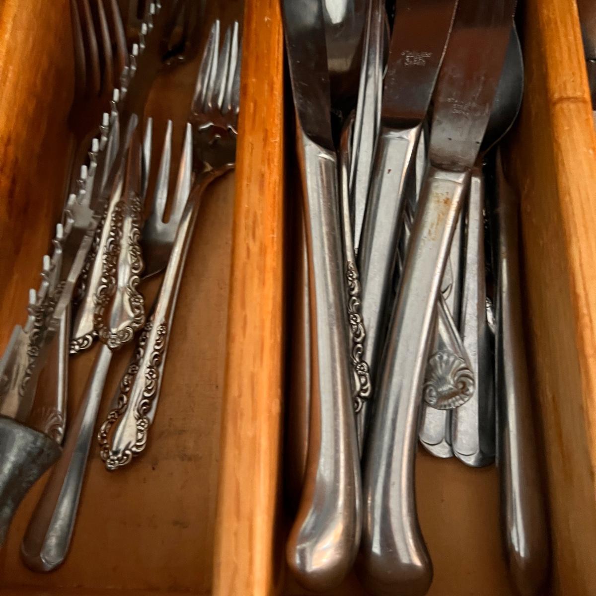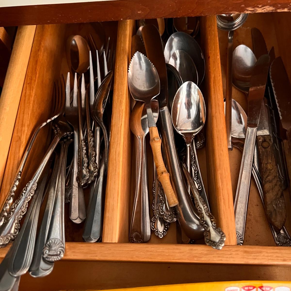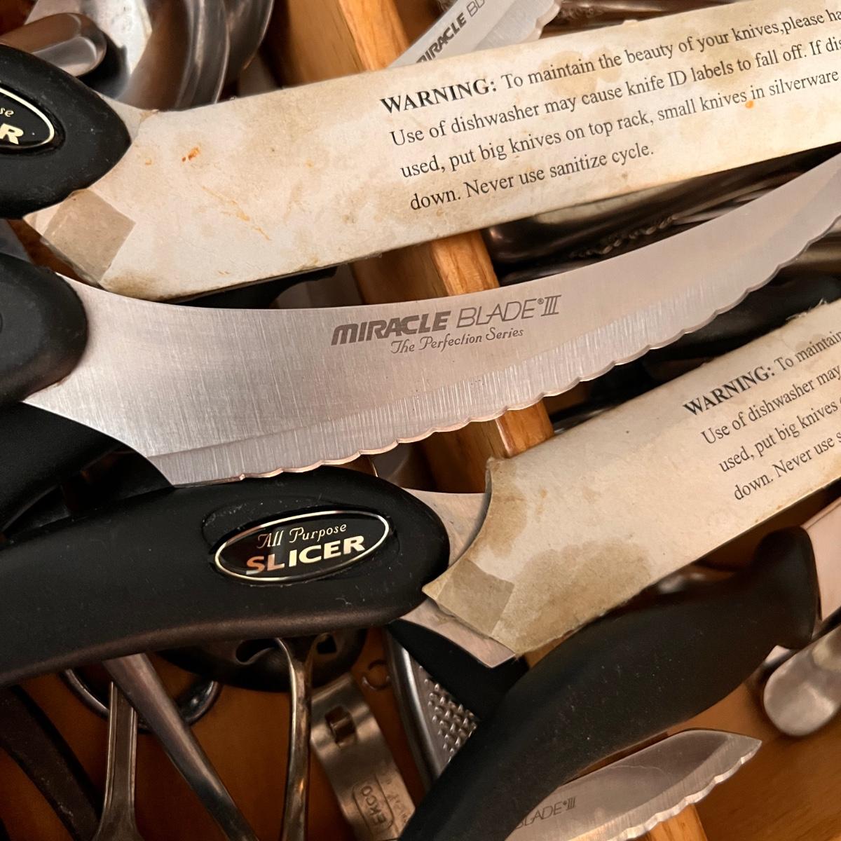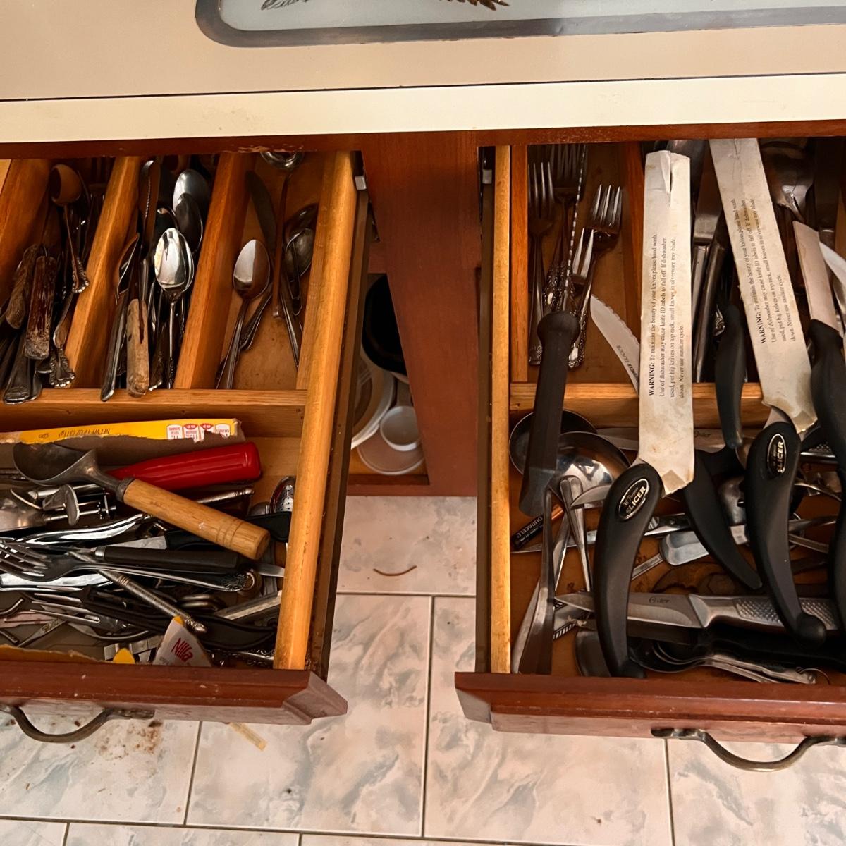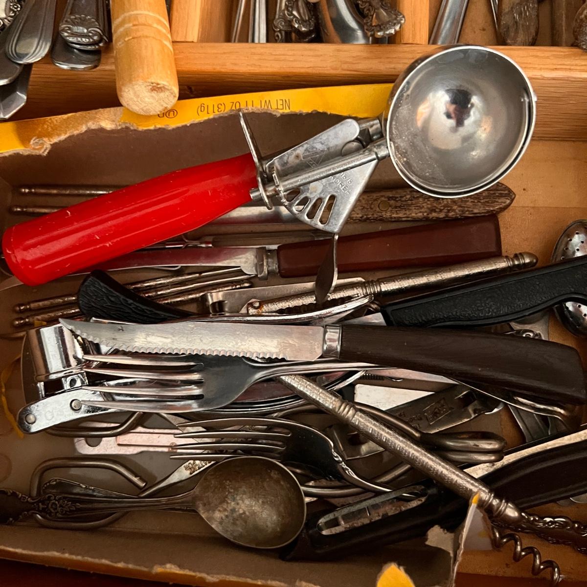 2 drawers of utensils vintage and contemporary. Miracle blade knives, silver plate, stainless steel. Large mixed lot.