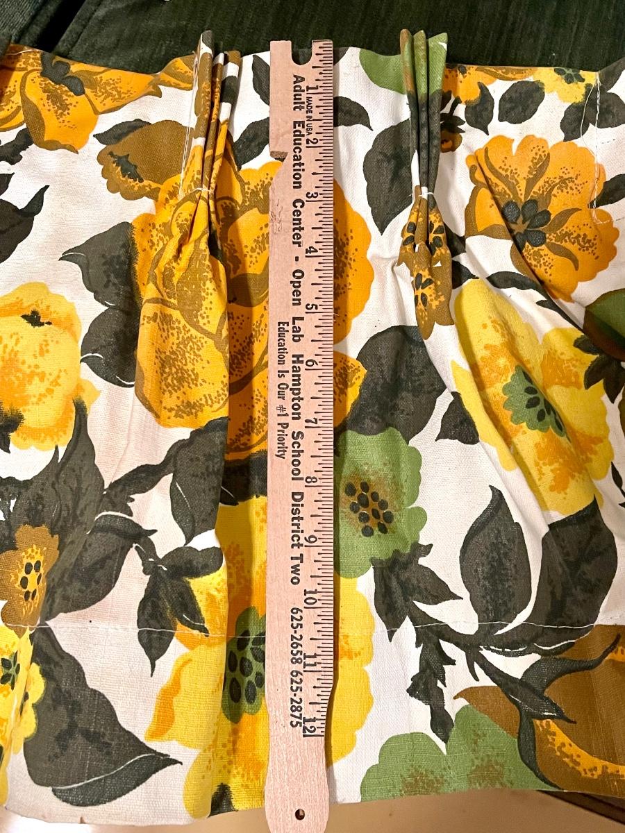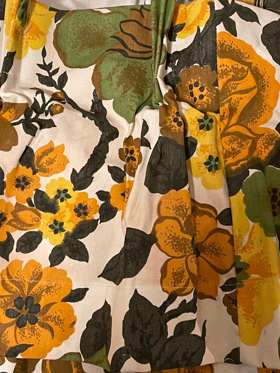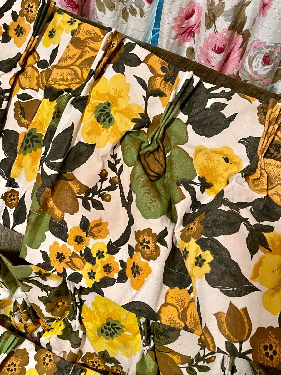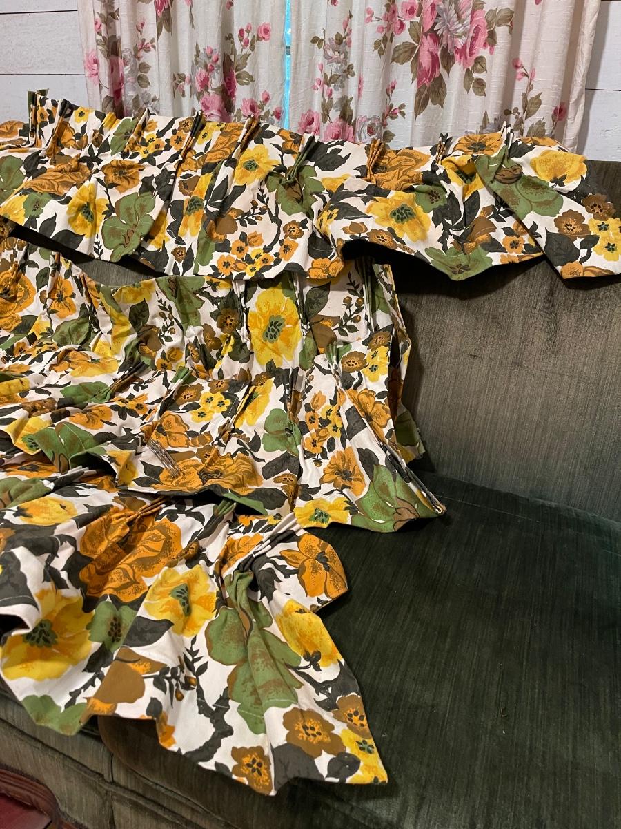 Great colors in these sunflower valences! They have been hanging in a kitchen for years and years. I will leave the laundering to the buyer. They need it. 47” long 13” hanging length. A heavy type of material.
