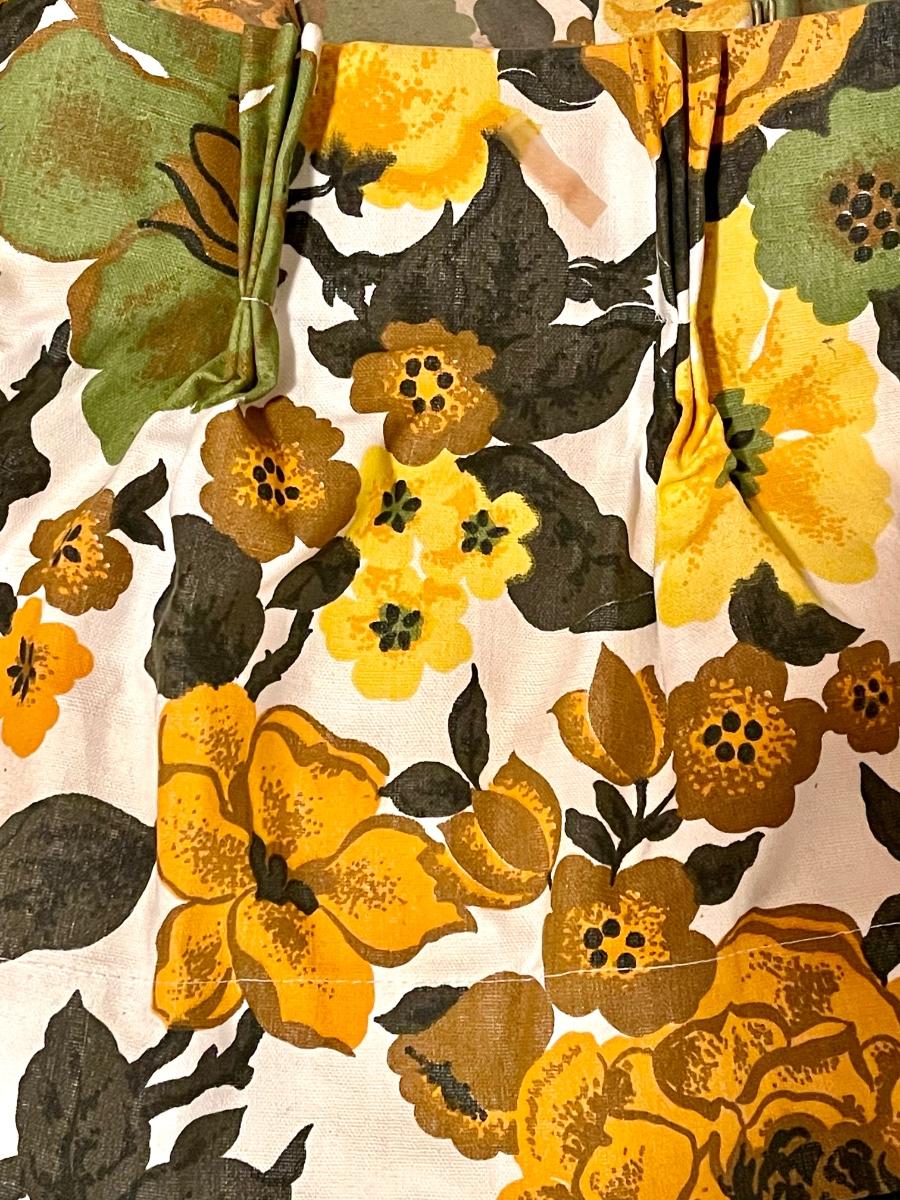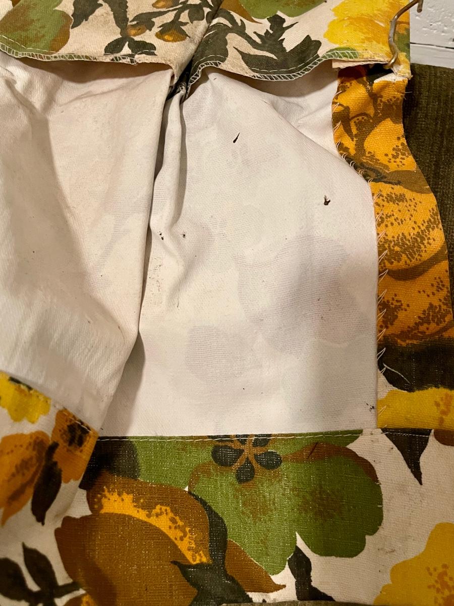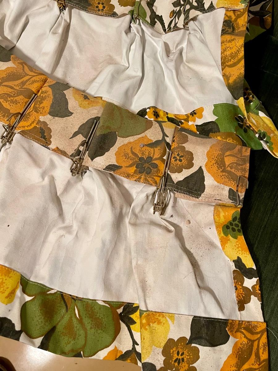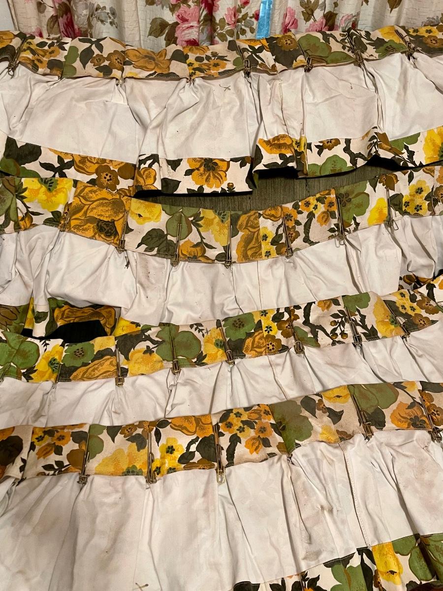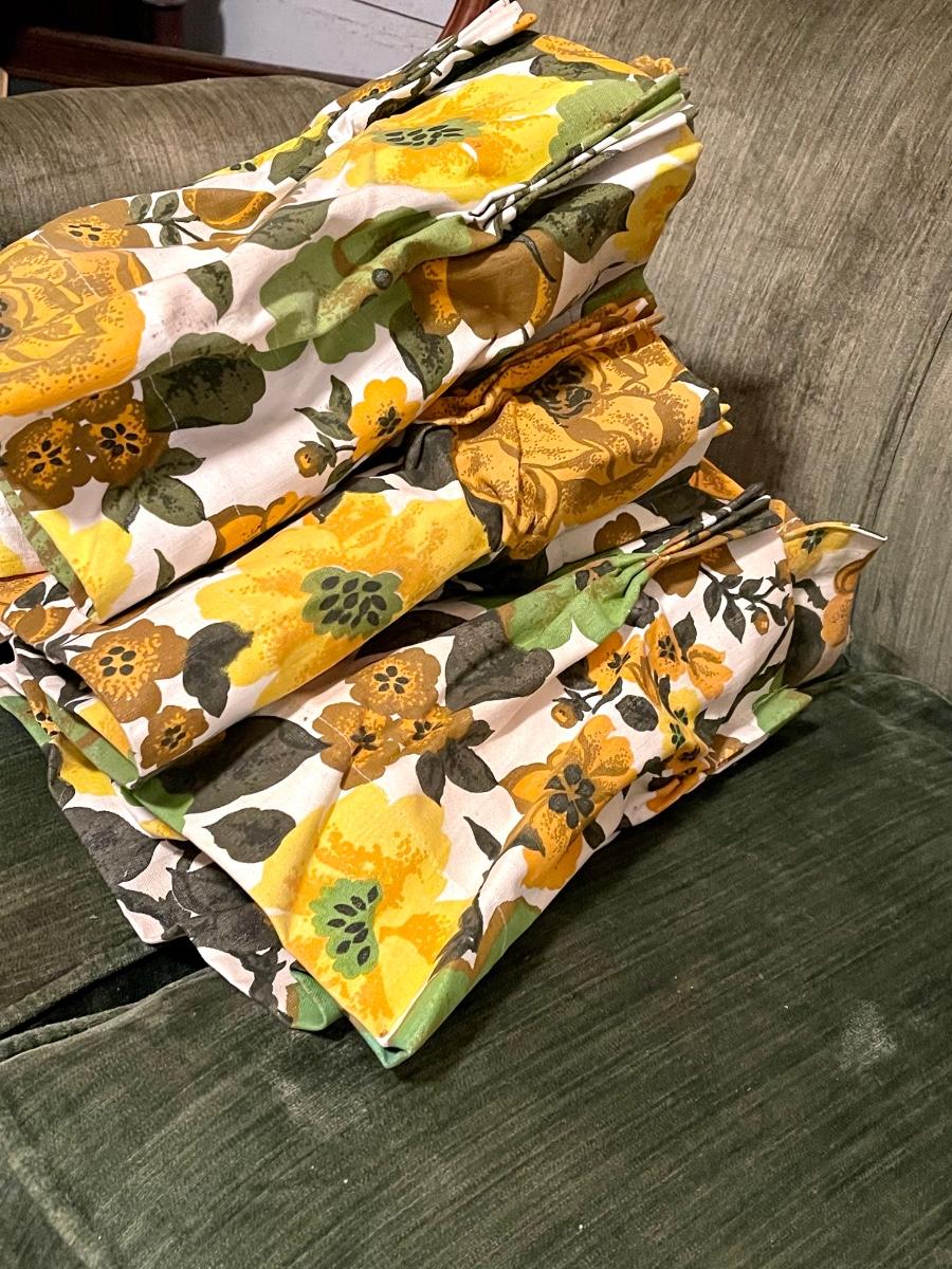 Great colors in these sunflower valences! They have been hanging in a kitchen for years and years. I will leave the laundering to the buyer. They need it. 47” long 13” hanging length. A heavy type of material.