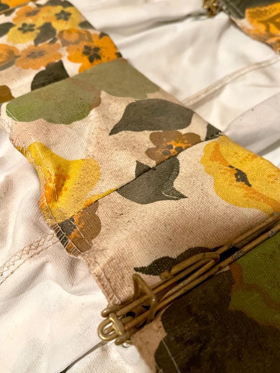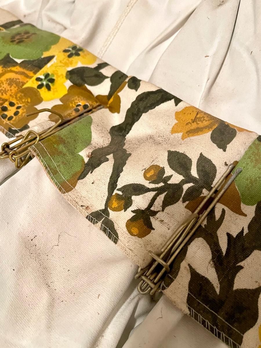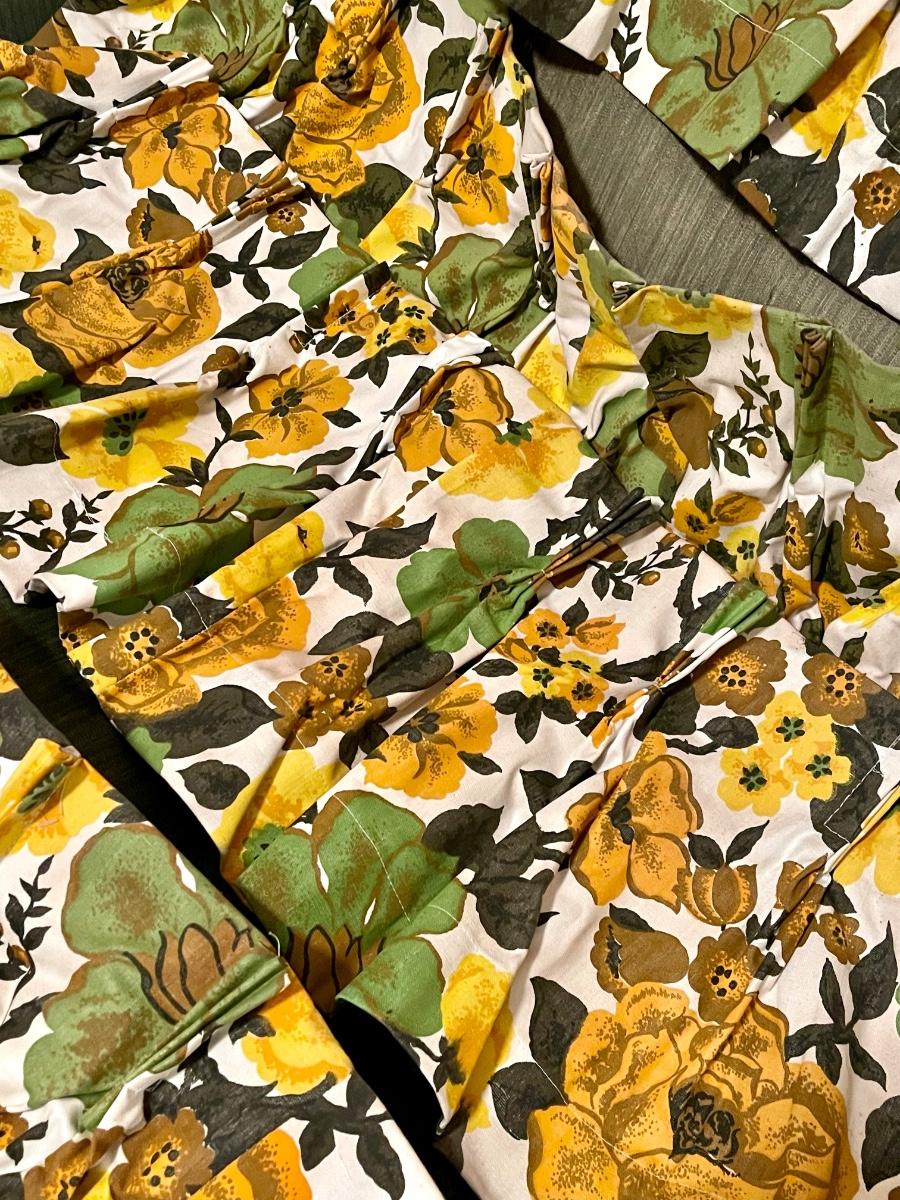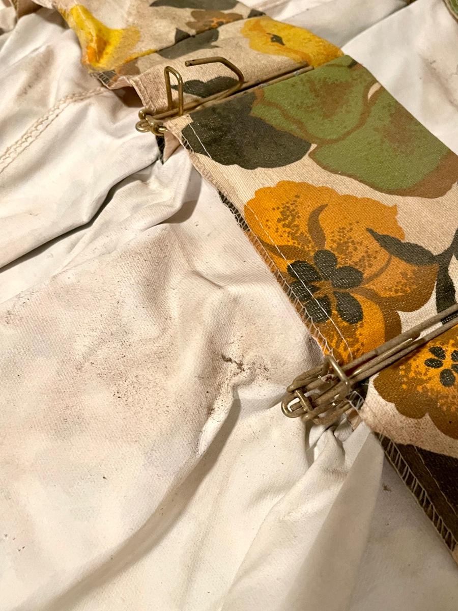 Great colors in these sunflower valences! They have been hanging in a kitchen for years and years. I will leave the laundering to the buyer. They need it. 47” long 13” hanging length. A heavy type of material.