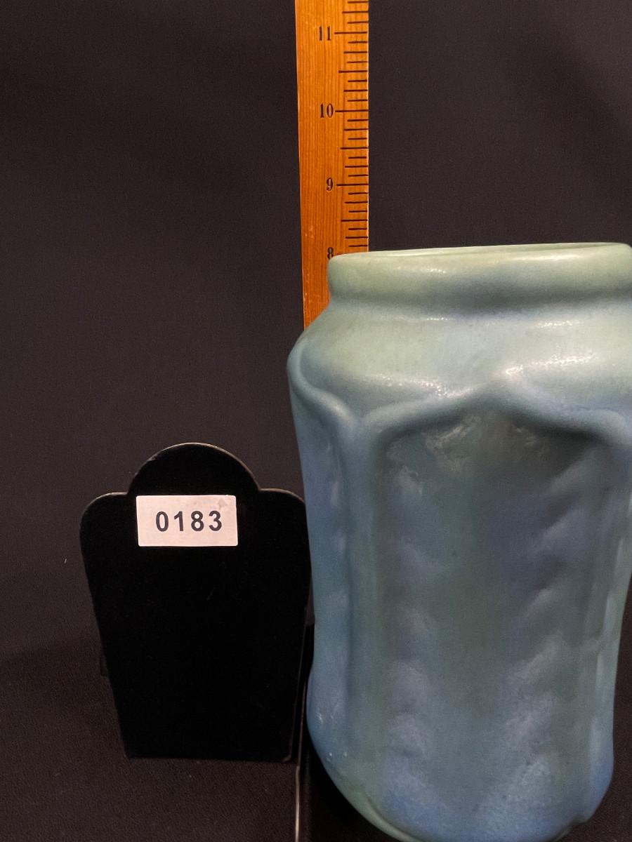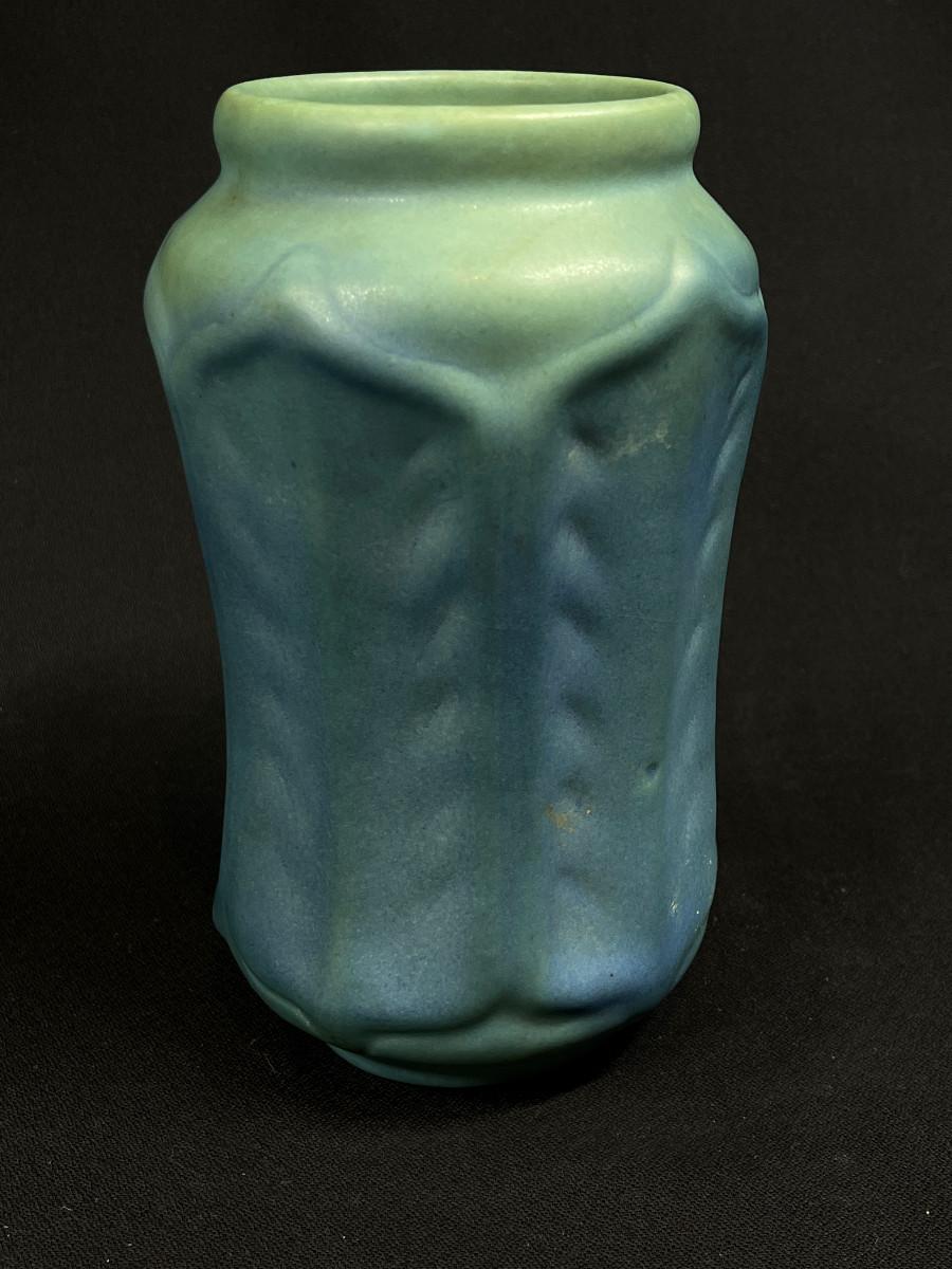 The subject item is a vintage, standing, molded Ming Blue flower vase by Van Briggle. Designed c. 1920, the body of the large vase is of a shouldered and waisted shape with incised geometric vertical leaves under a Ming blue matte glaze, incised marks, Not often seen or offered for sale. A nice estate find!