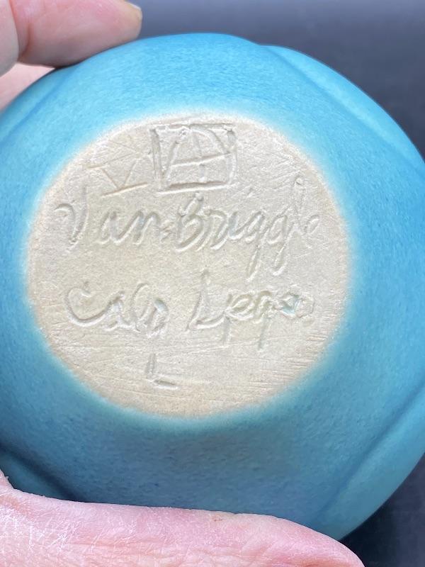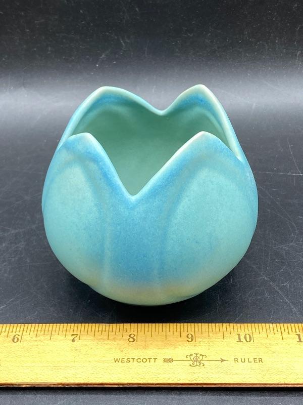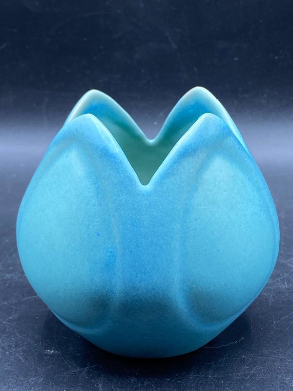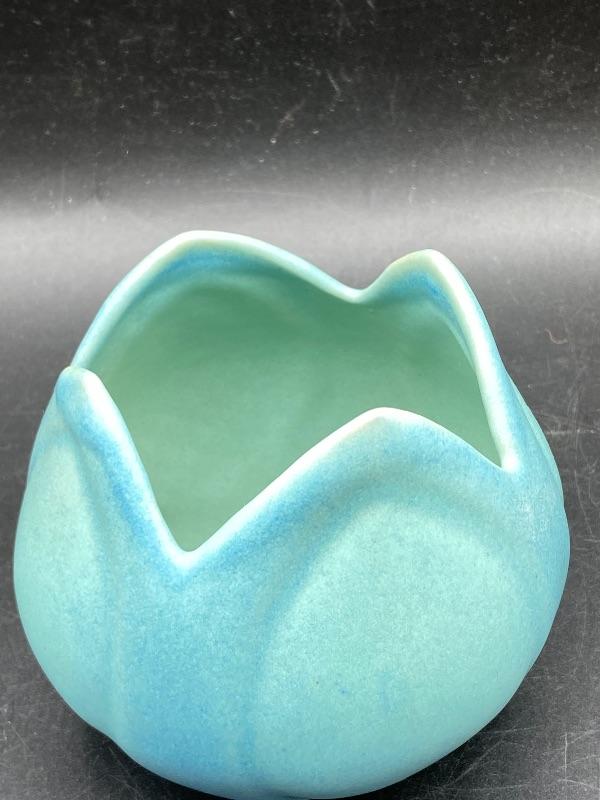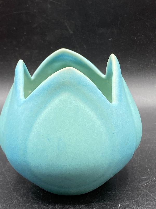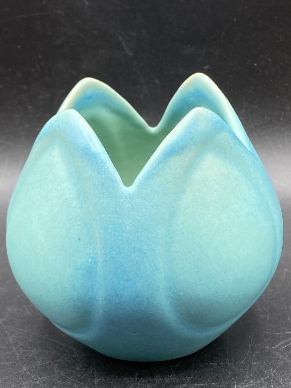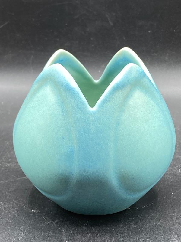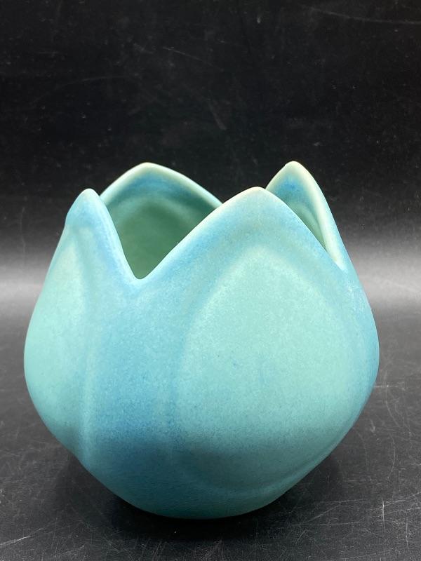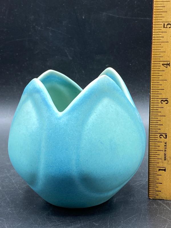 Beautiful ming blue Van Briggle tulip vase. Smooth pottery flower done in a turquoise green blue finish. Excellent condition. 4" size. Signed on the bottom.