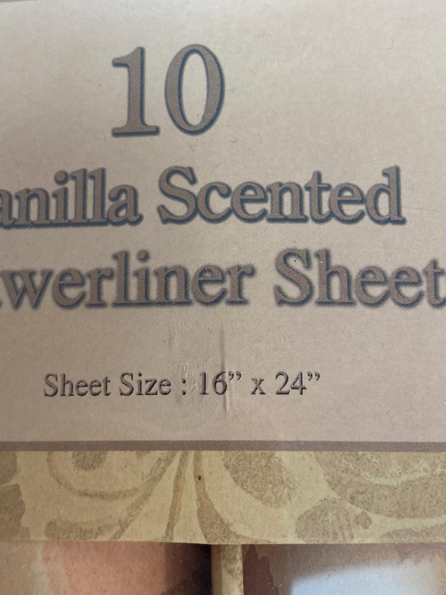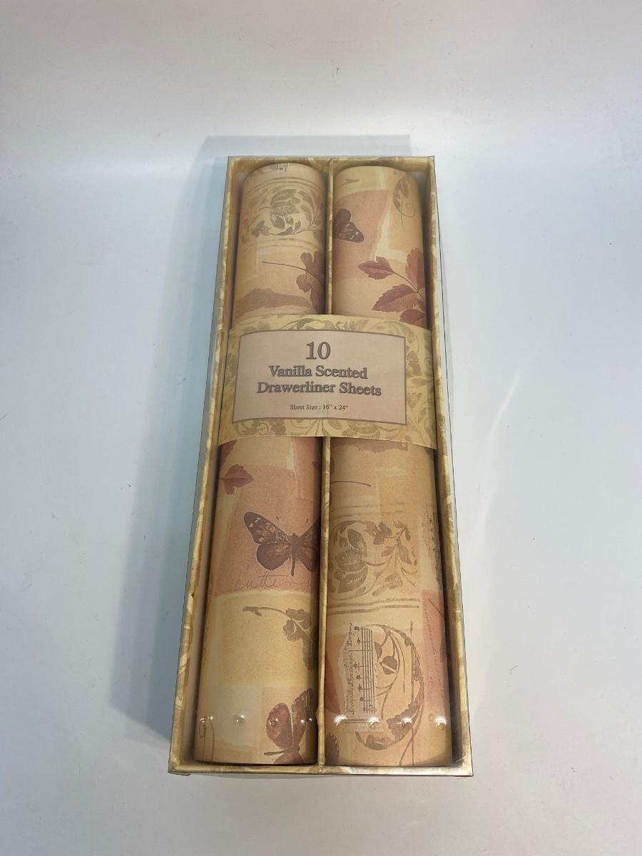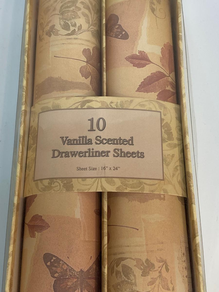 Vintage Vanilla Scented Drawer Liner Paper. There are not 10 sheets in the package, only two or three. Still have a slight vanilla scent.