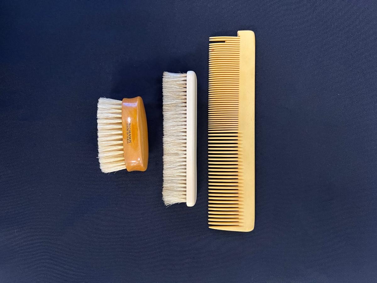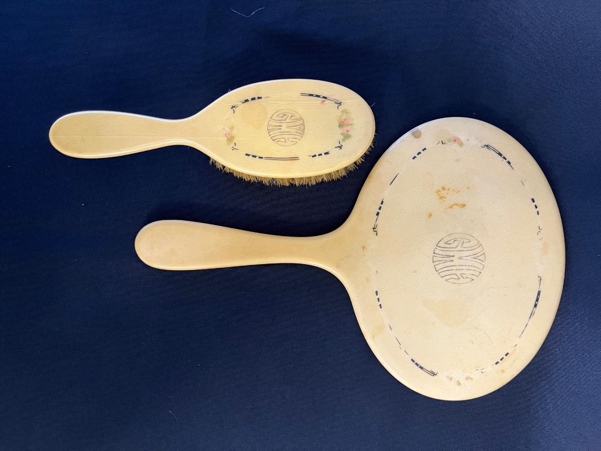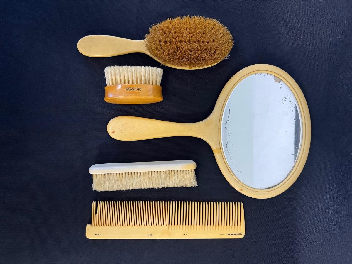 Includes a mirror, brushes, and a comb. Total of 5 pieces. The comb is missing teeth. Measurement of largest: 11" x 8". [SG]