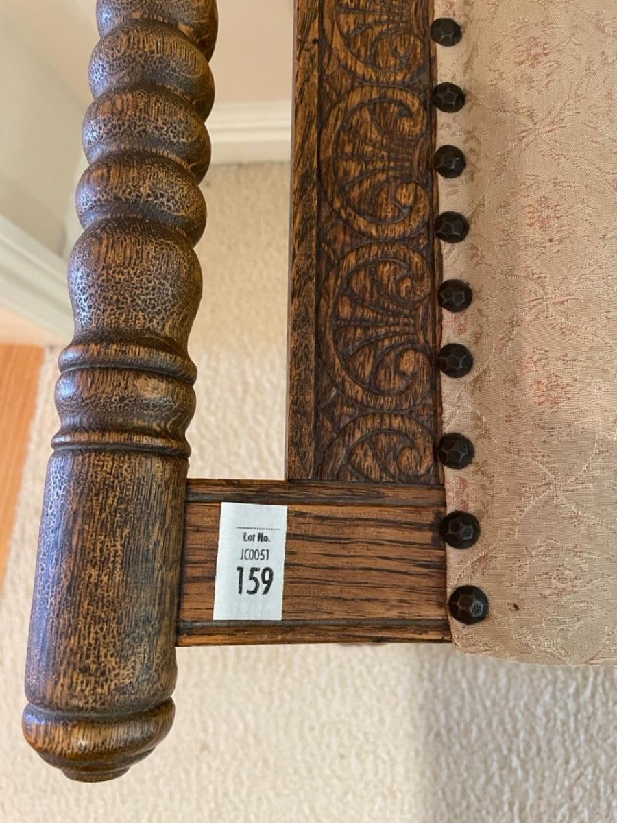 Beautiful carved details. Rivets and ivory fabric. Possibly oak