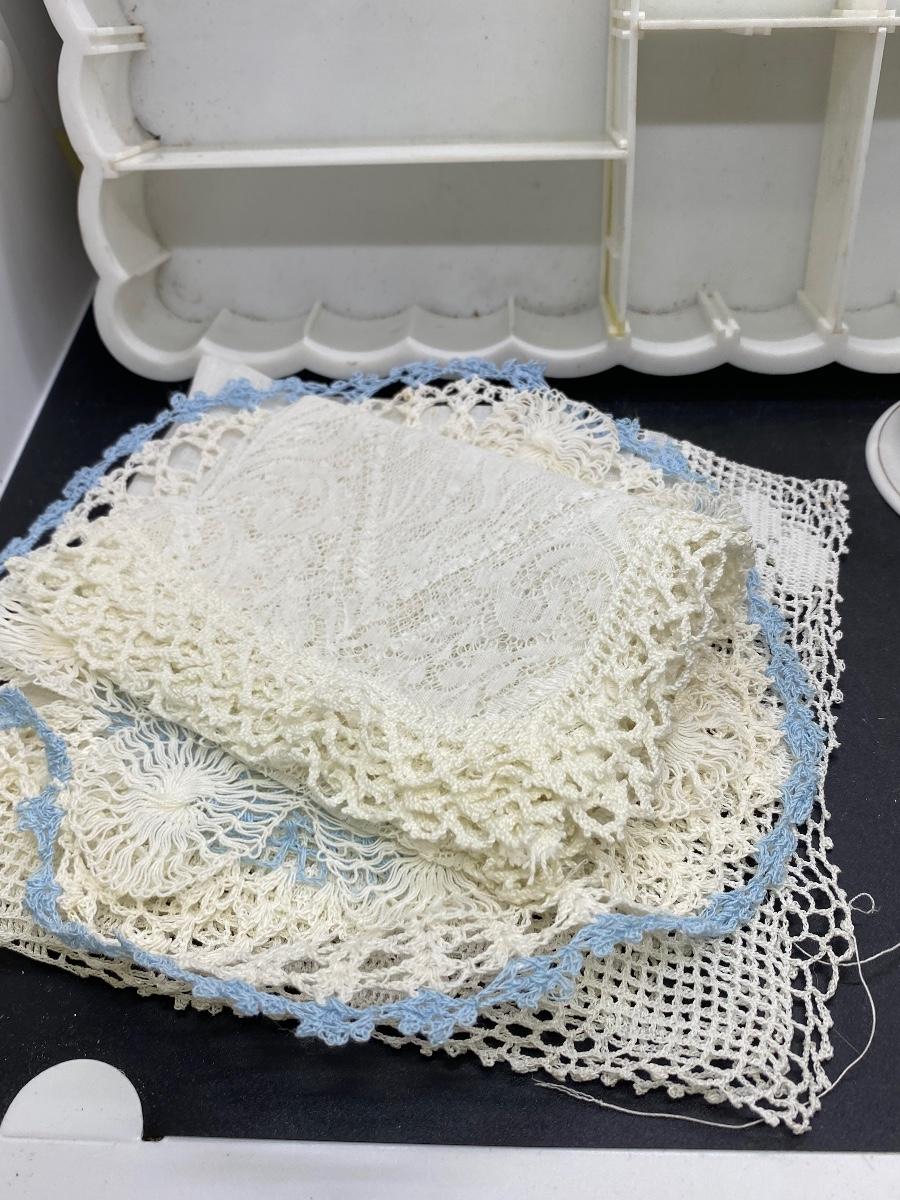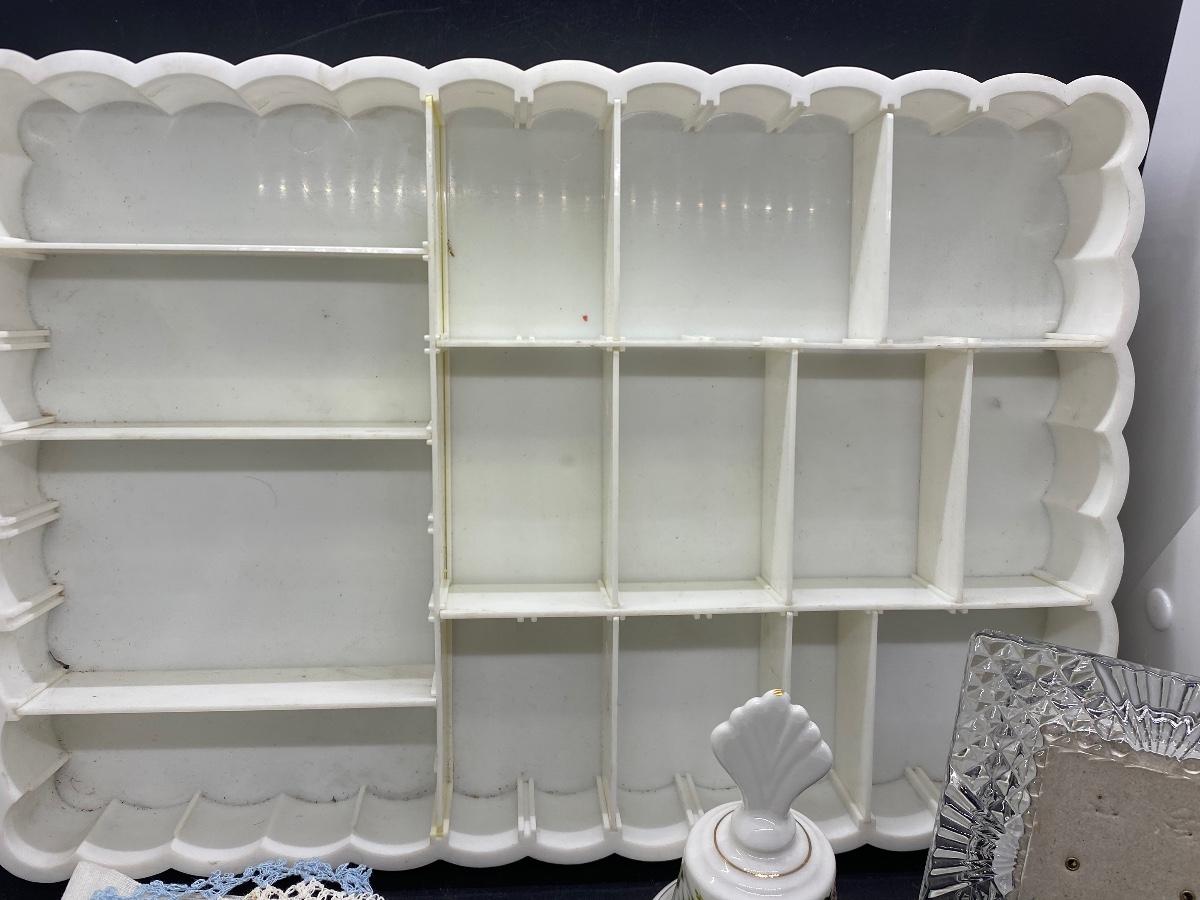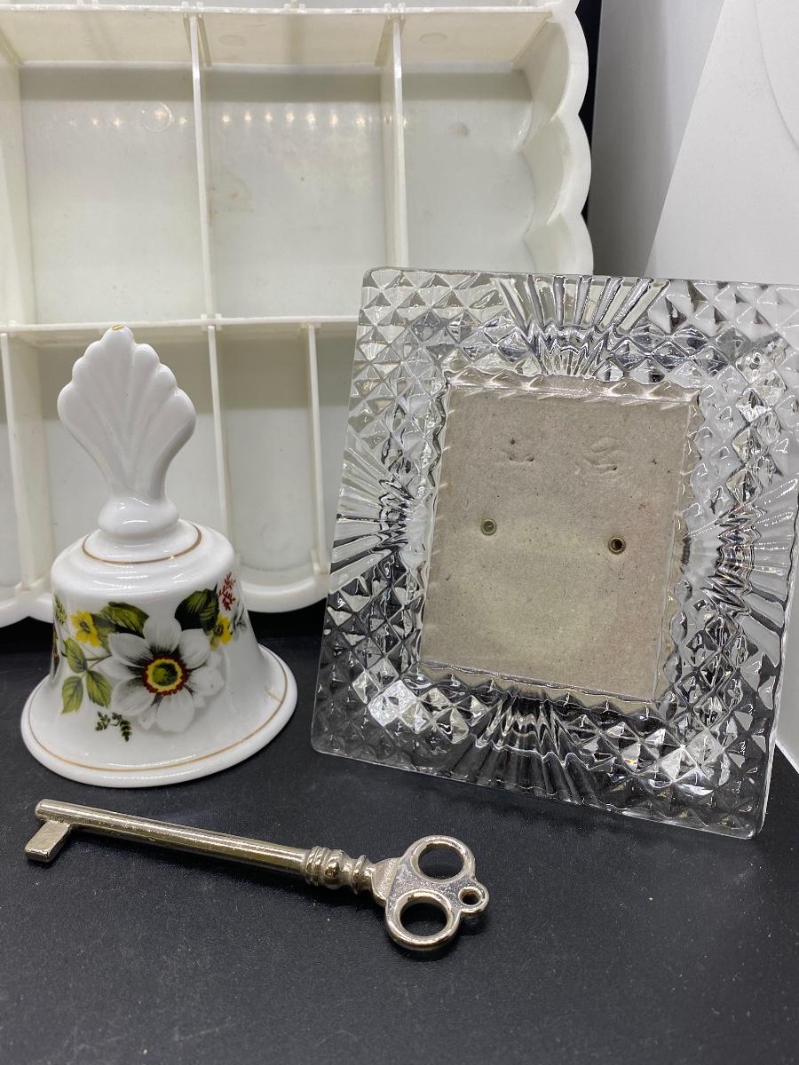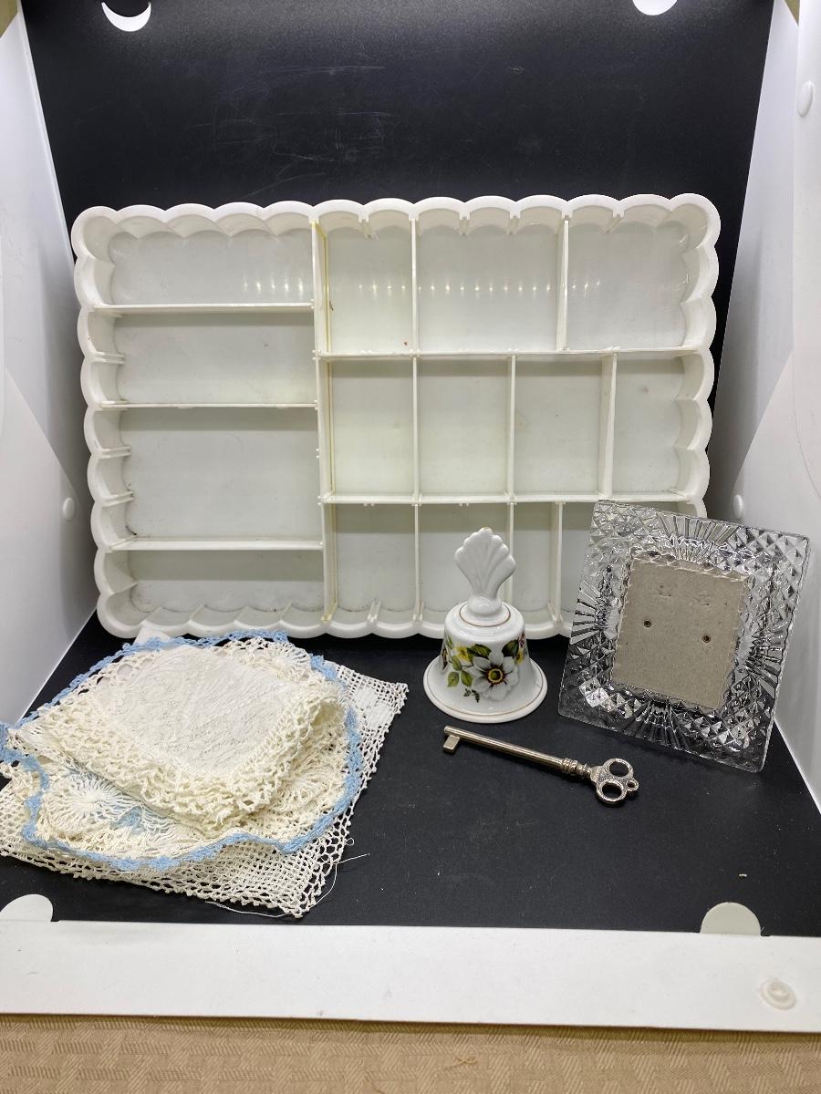 Vintage decor lot. Includes a plastic divided organizer, doilies, a ceramic bell, crystal picture frame and a skeleton key. Bell has a small flaw in the side. Plastic tray dividers can be removed and rearranged.