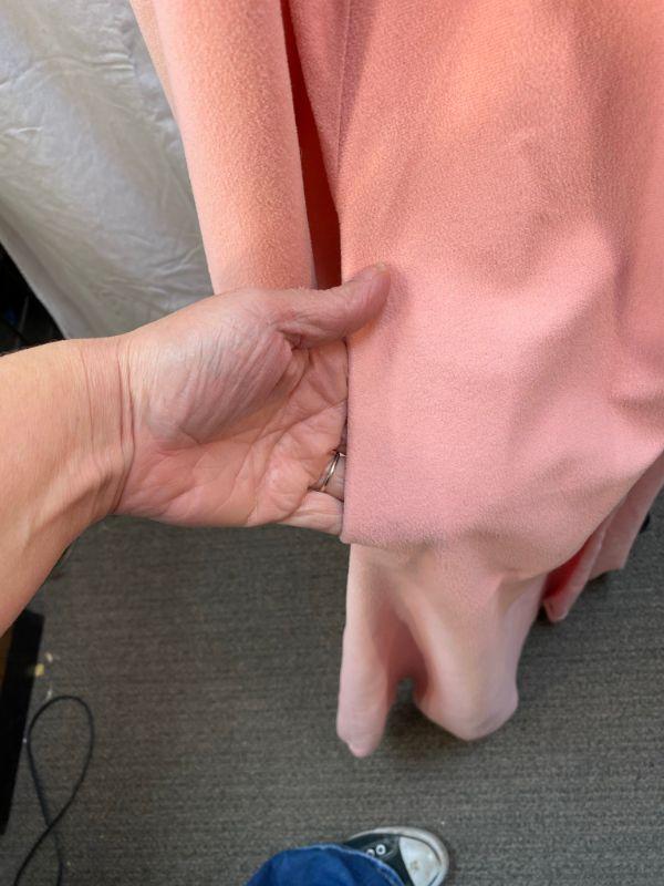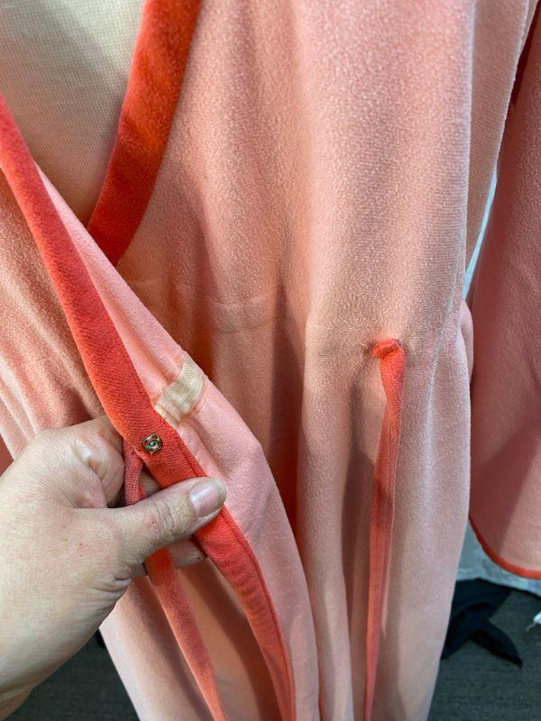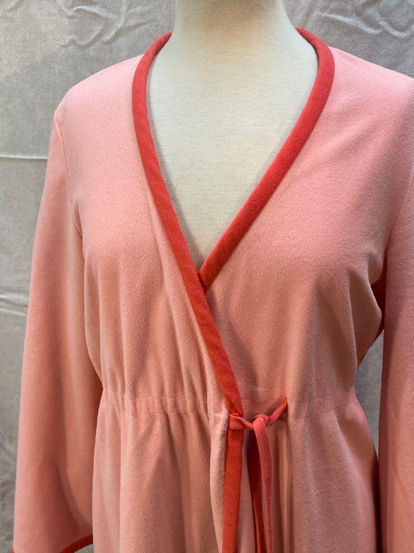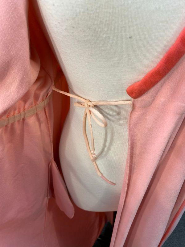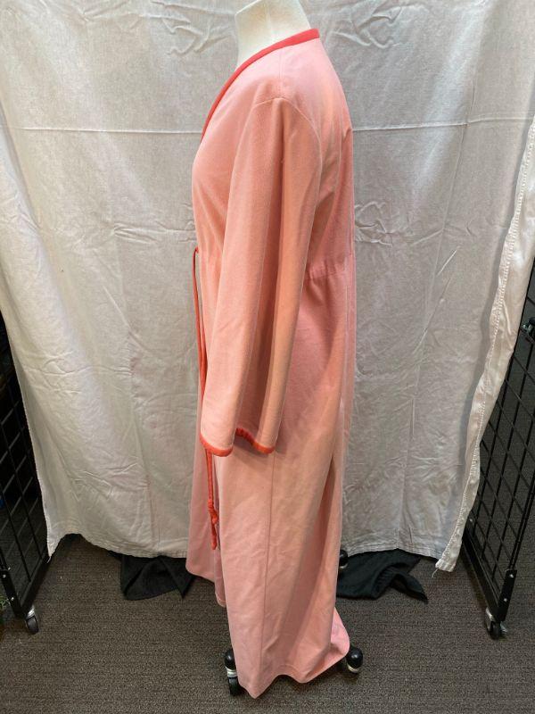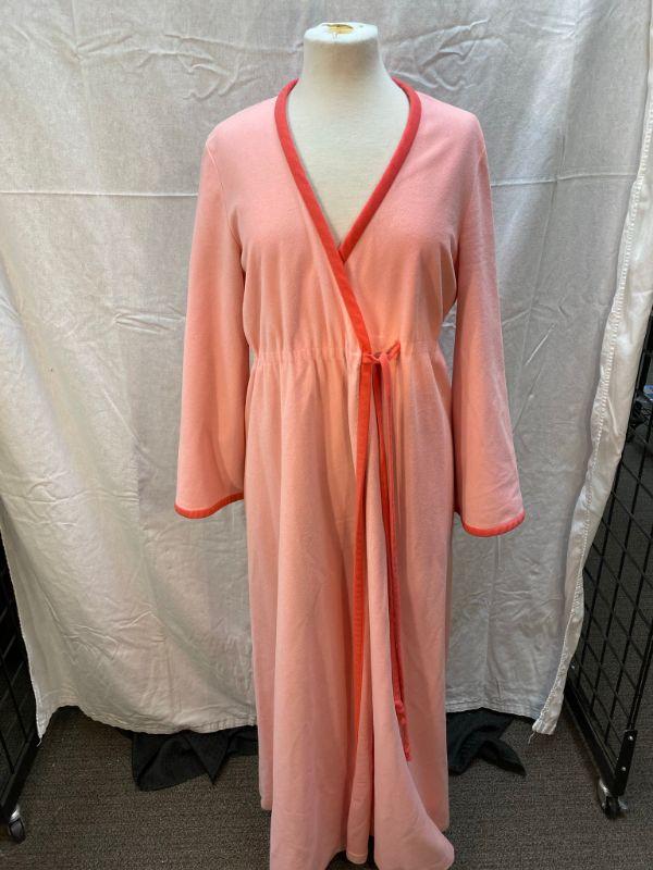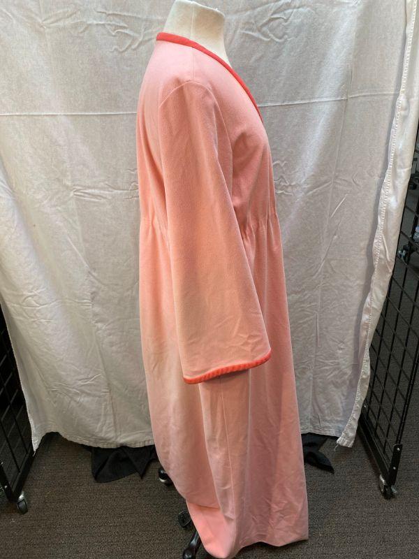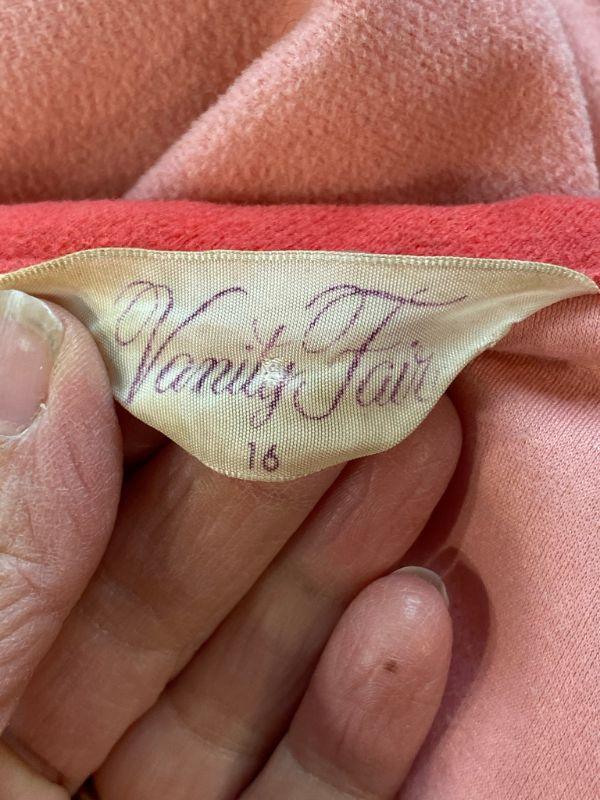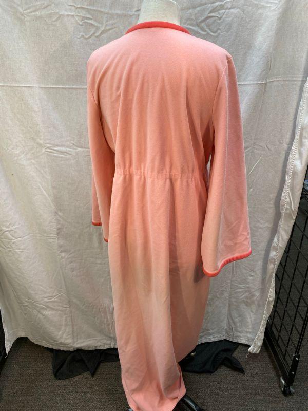 Vintage Vanity Fair robe. Peachy pink color. Lightweight material. Full length with a tie inside at the hip and a tie in the front. No major spots or stains, just a little discolor from age and use. Size 16.