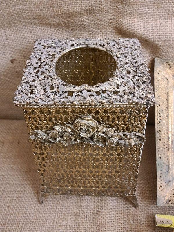 Filigree mirror and 2 tissue boxes. See photos for condition. Gold tone is flaking off.