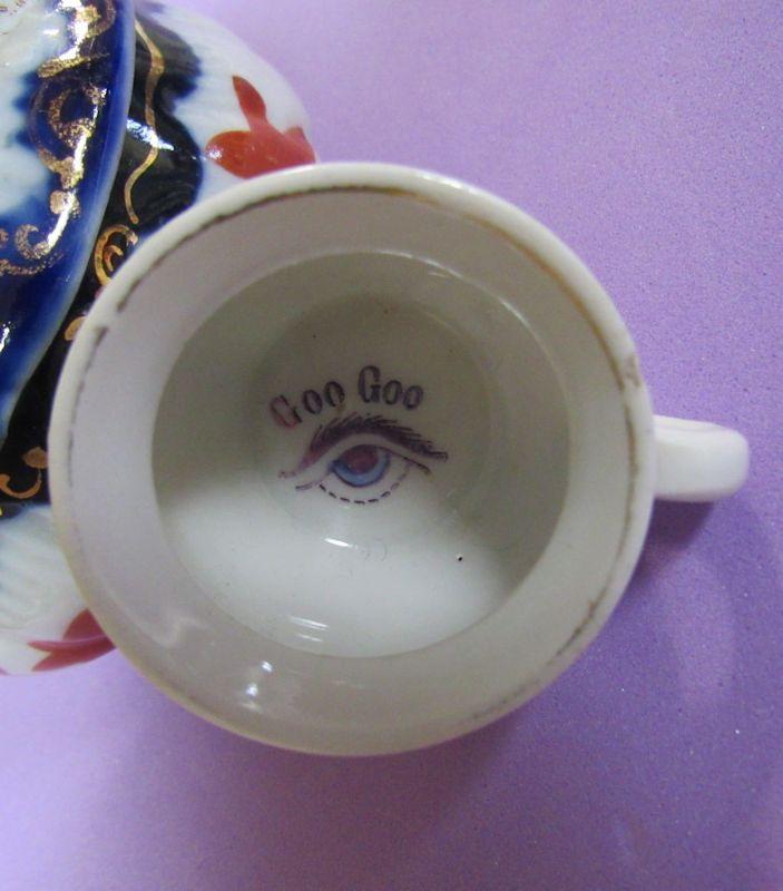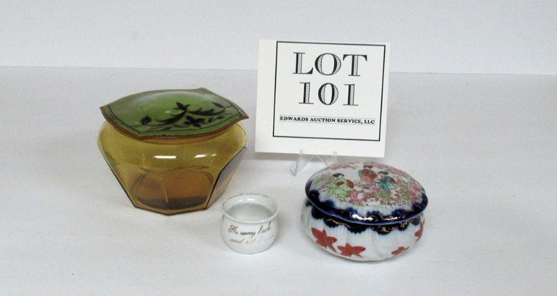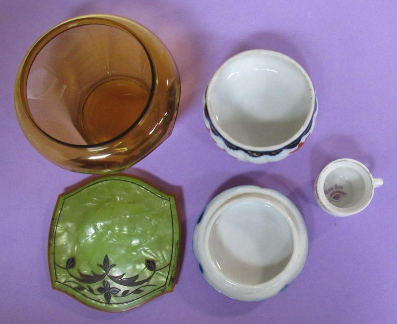 Vintage Vanity Lot, Celluloid Cover Dresser Box, Giesha Girl Trinket Box, Miniature Chamber Pot Goo Goo Eye