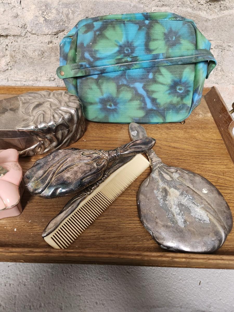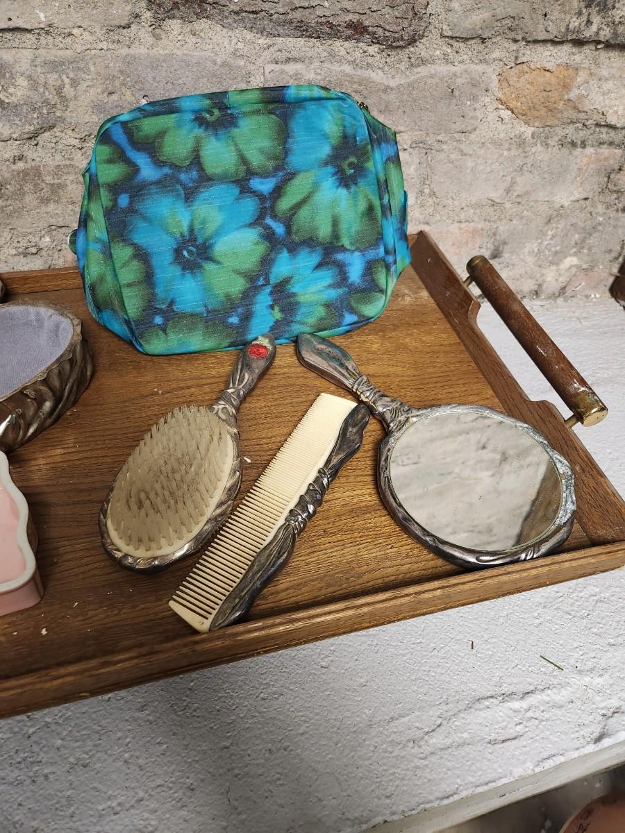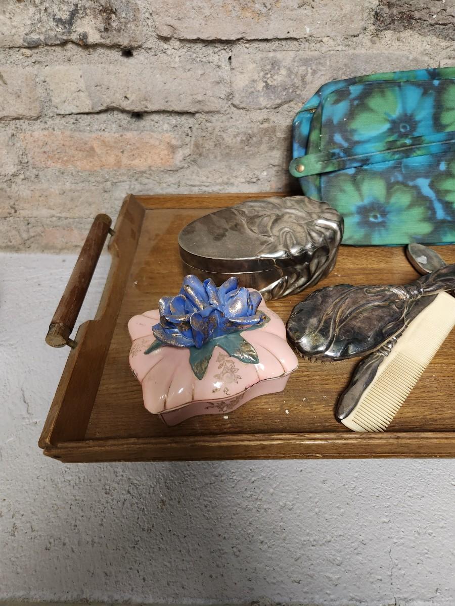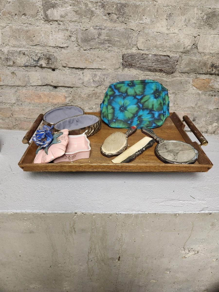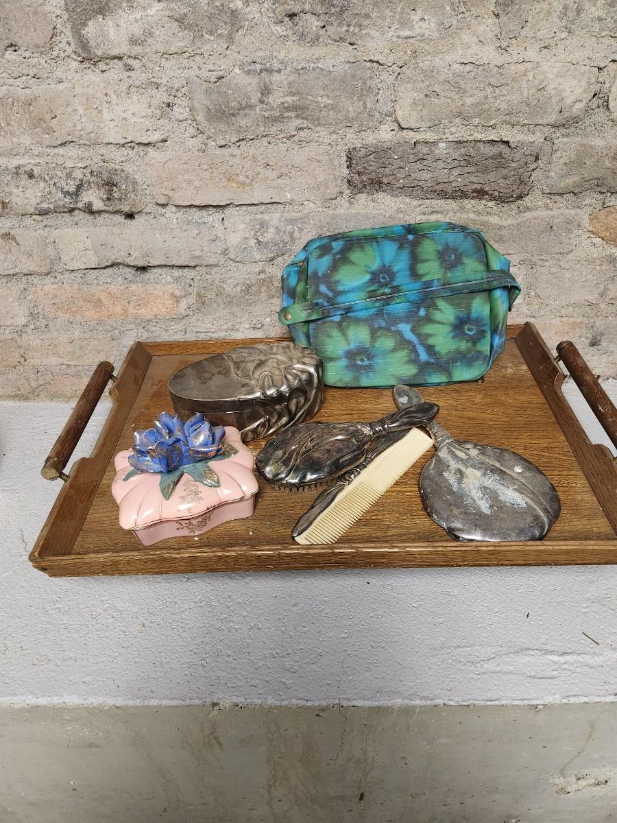Mirror, brush, comb, velvet lined box, pick ceramic box, vintage makeup bag and wood tray
