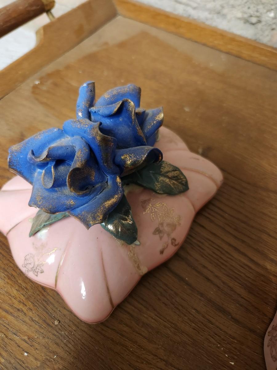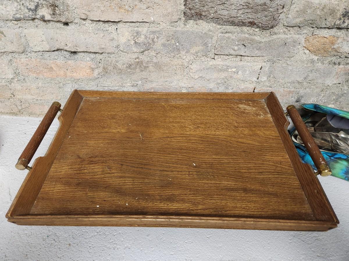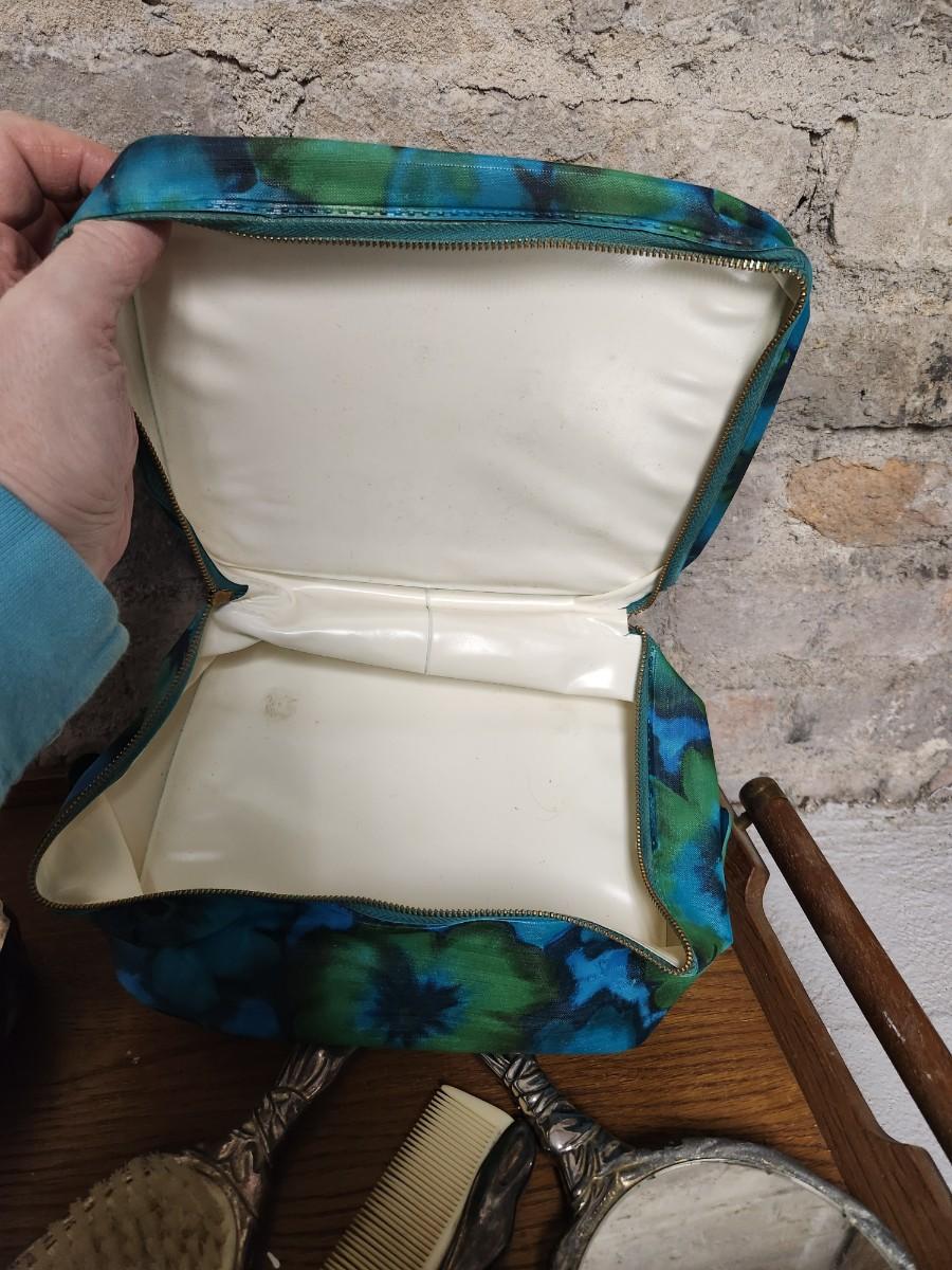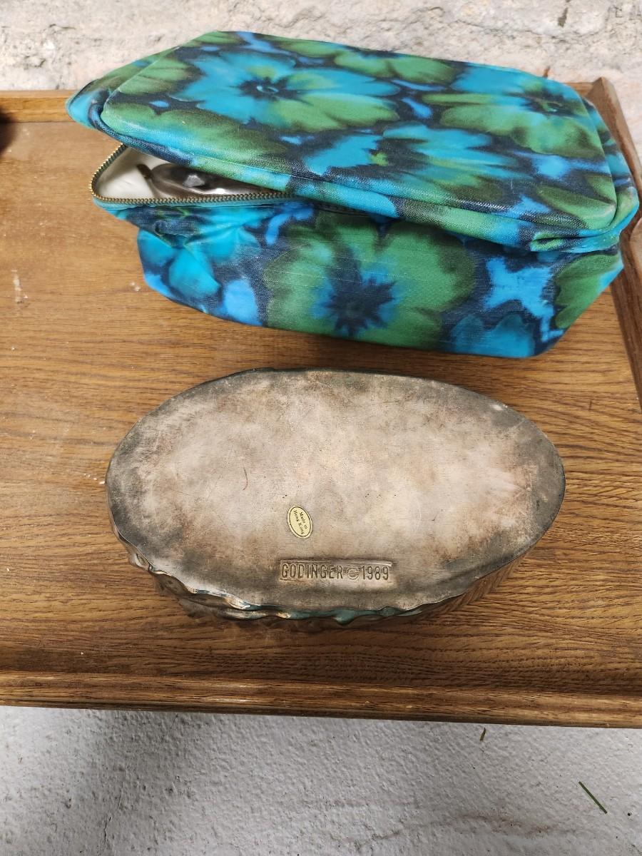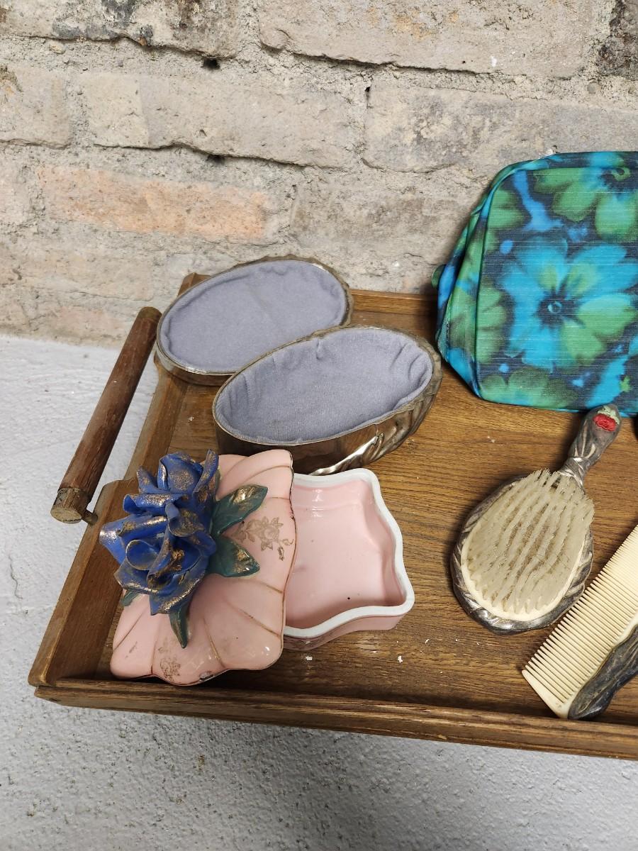Mirror, brush, comb, velvet lined box, pick ceramic box, vintage makeup bag and wood tray
