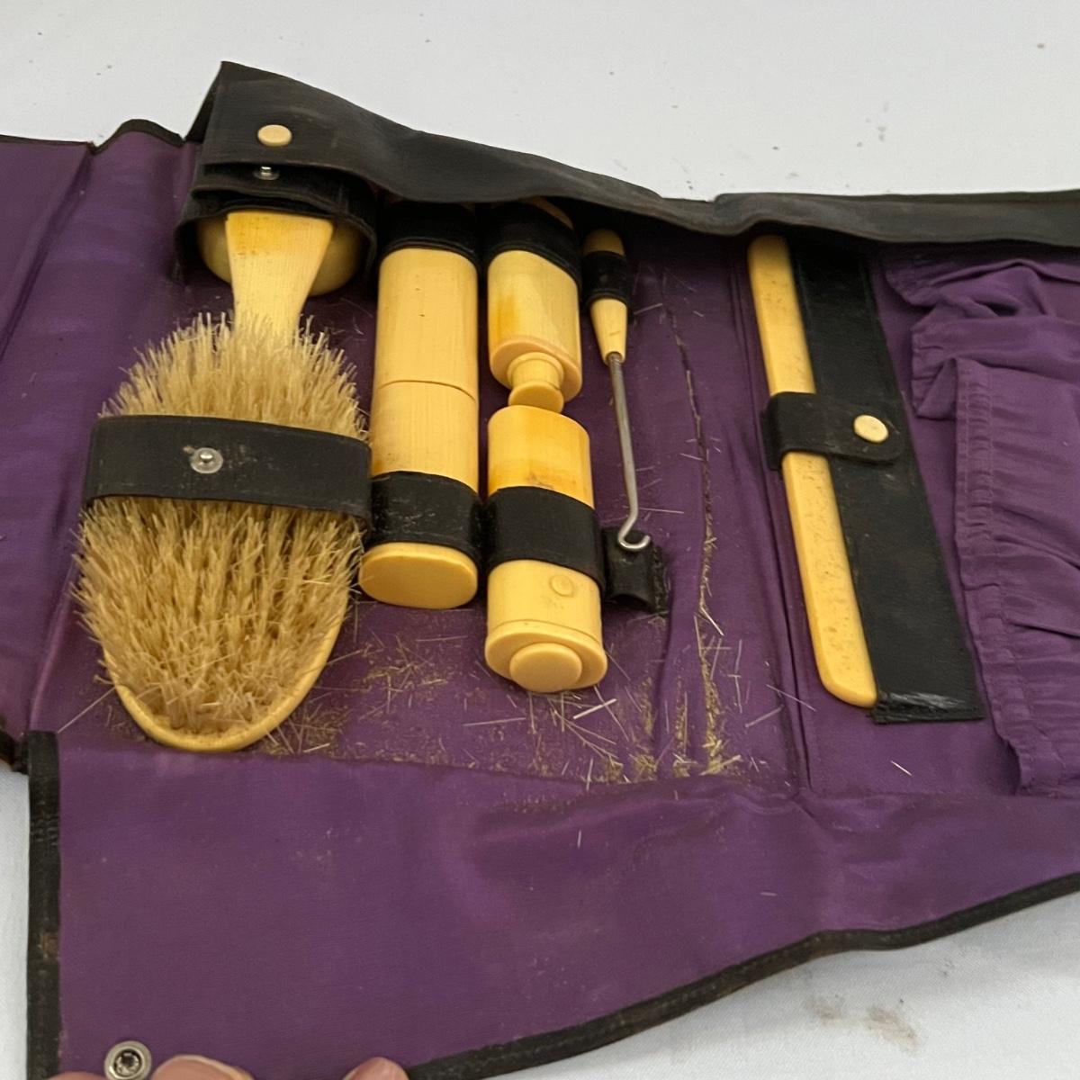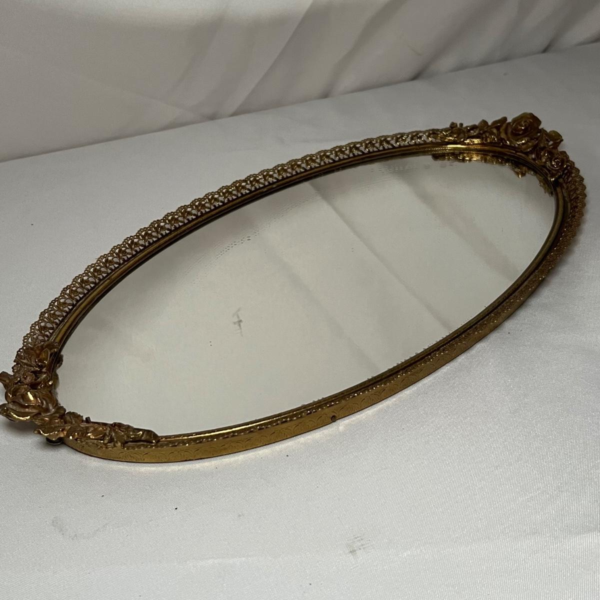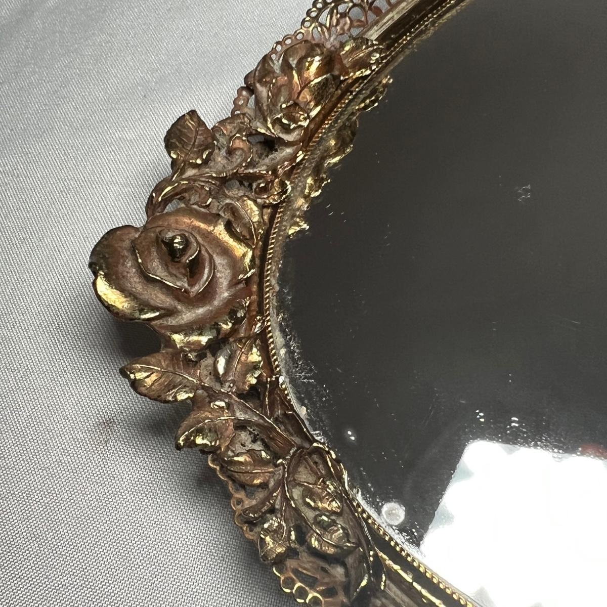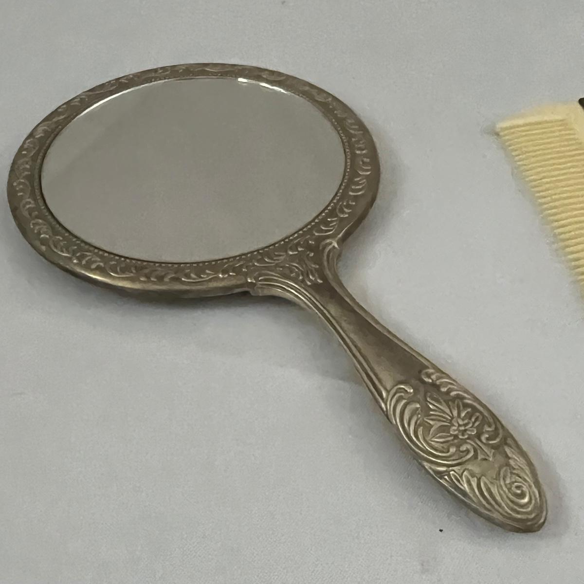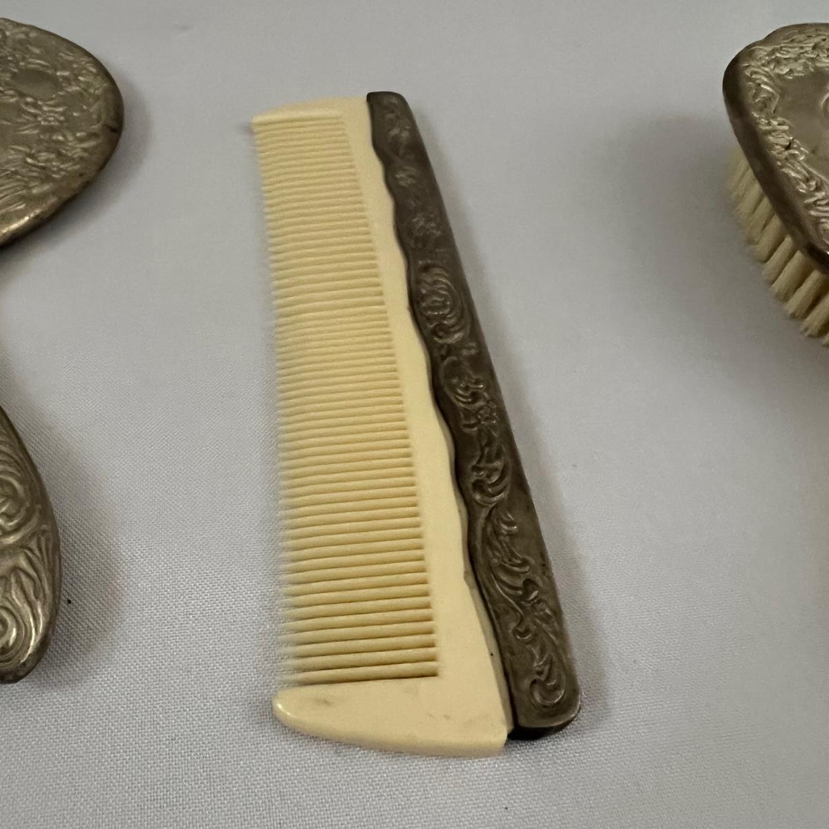 An assortment of vintage vanity items includes a brass colored metal framed mirror with similar mirrored tray. Also includes a matching set of three items: a silver colored metal handheld mirror, brush and comb. The black case houses plastic brushes and other accessories, case is a faux leather.