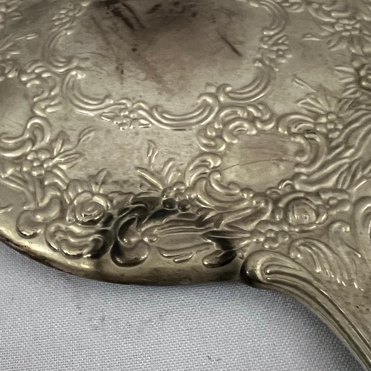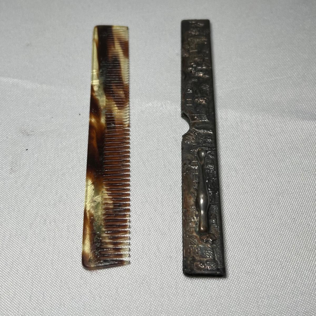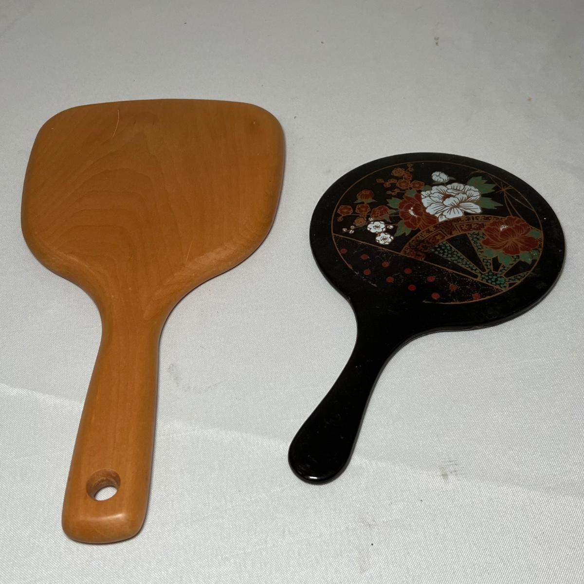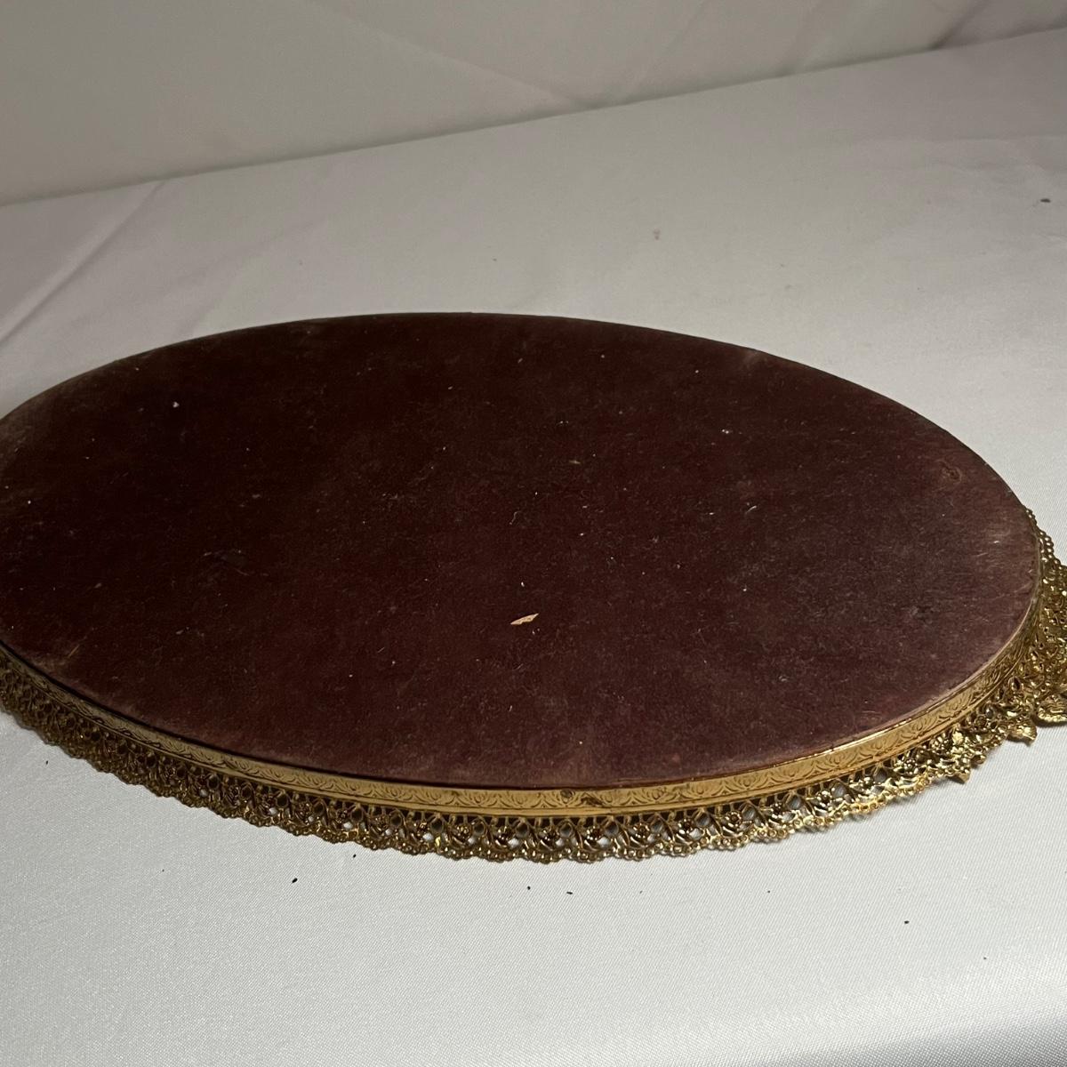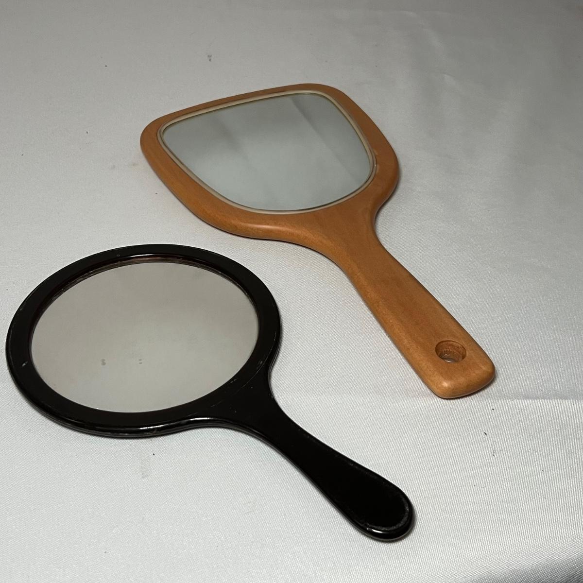 An assortment of vintage vanity items includes a brass colored metal framed mirror with similar mirrored tray. Also includes a matching set of three items: a silver colored metal handheld mirror, brush and comb. The black case houses plastic brushes and other accessories, case is a faux leather.