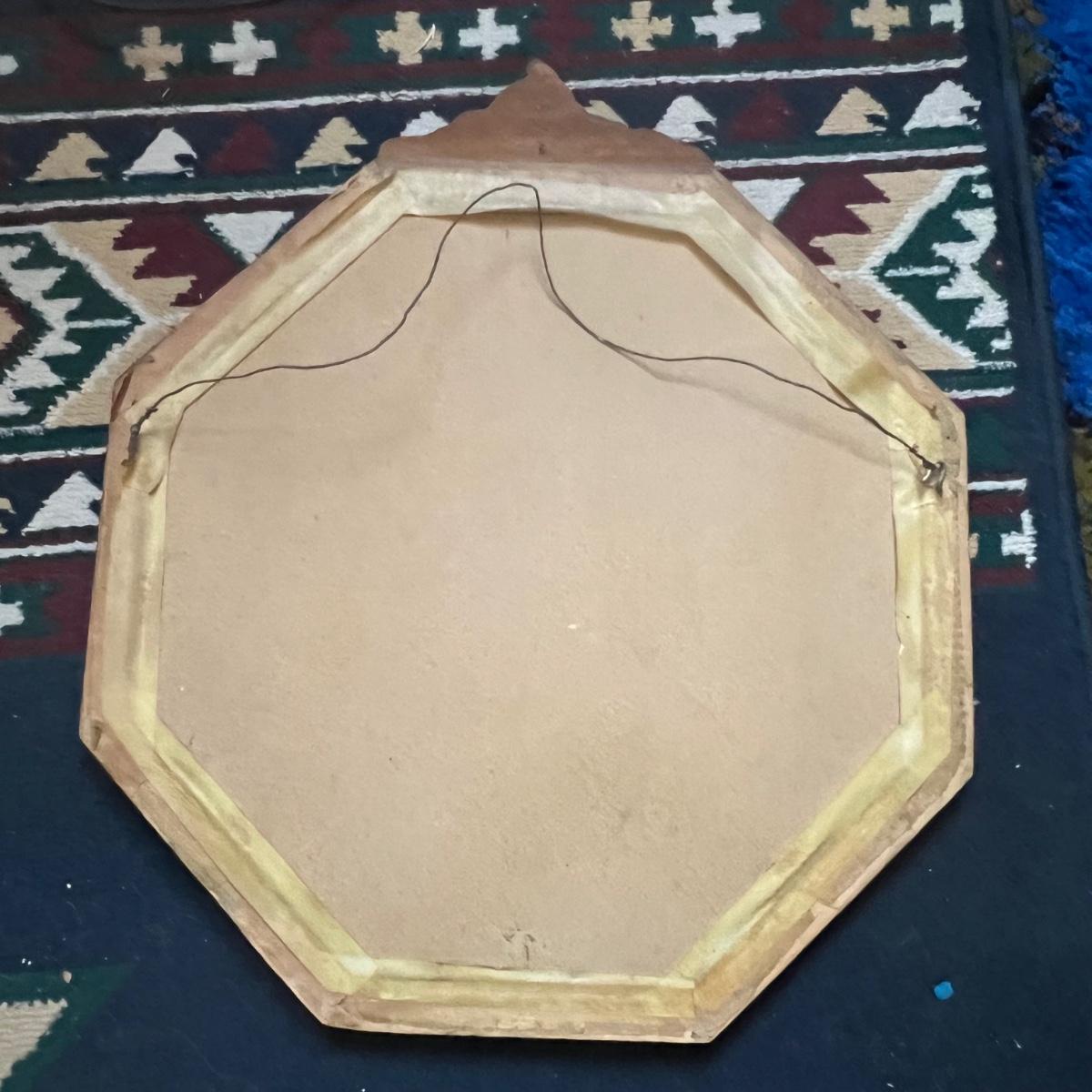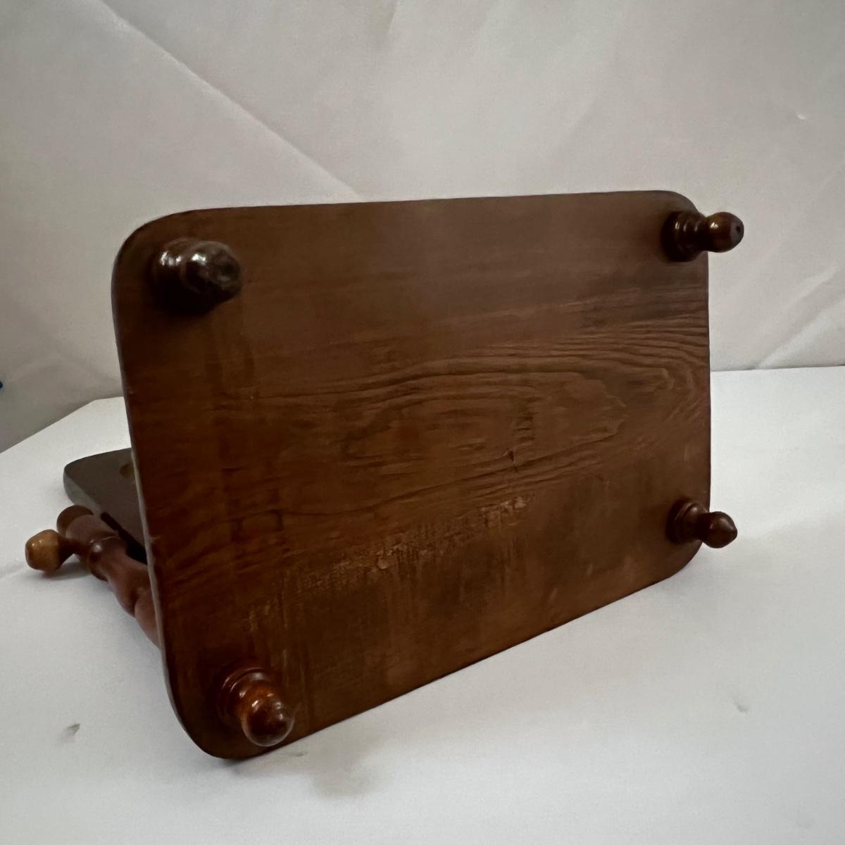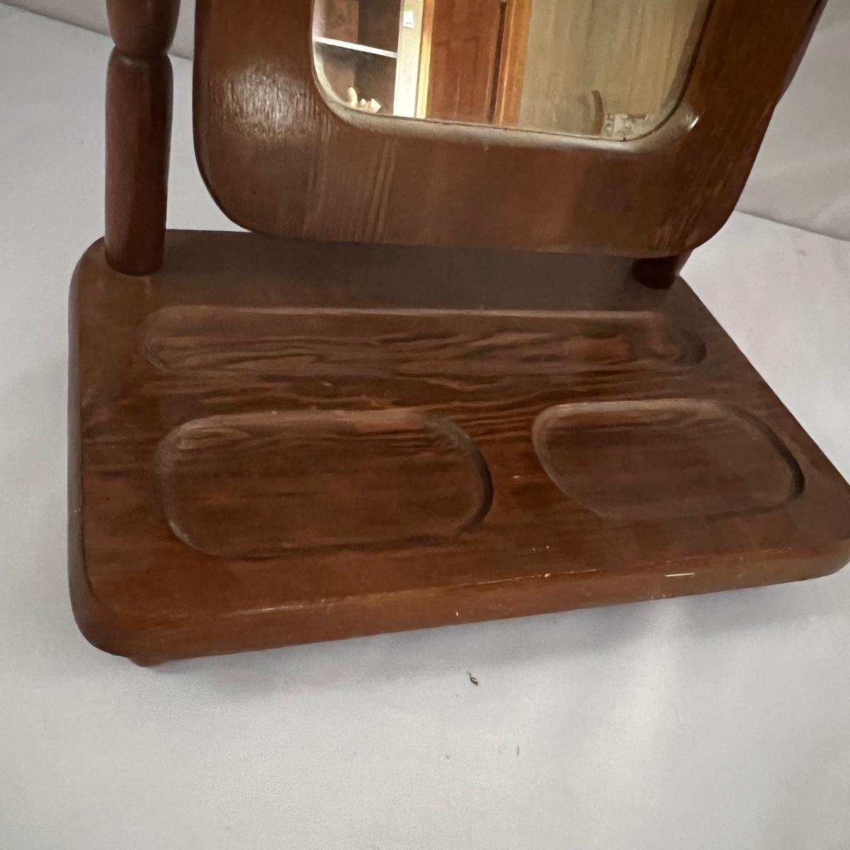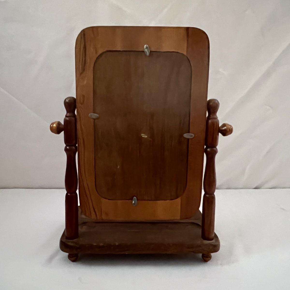Wooden mirror stand measures 10.5” x 7” x 15”.