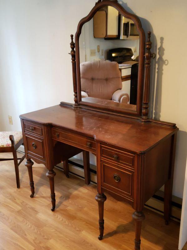 Vintage Vanity with Mirror. Vanity does not have a bench. Hardware appears to be brass. Vanity is on vintage casters. Vanity has some defects consistent with age and use. May need some work. Dimensions: 45"w x 18"d x 64"h. Lot# 0044