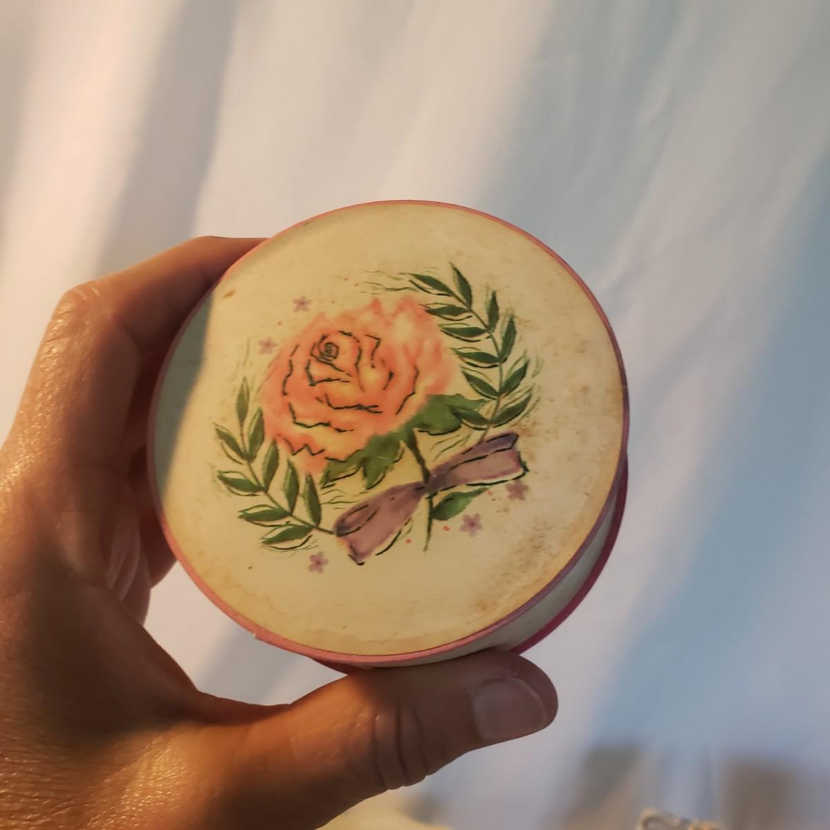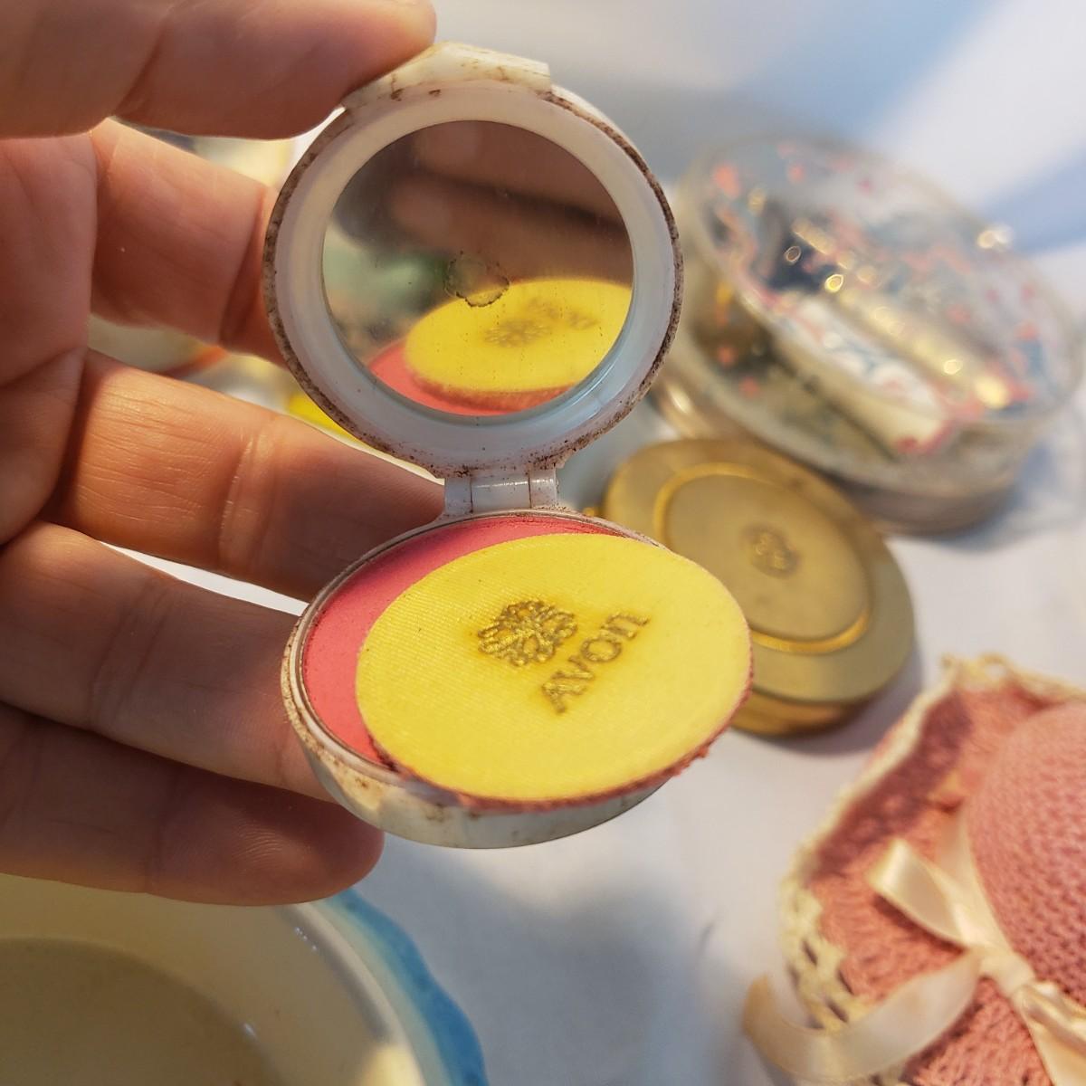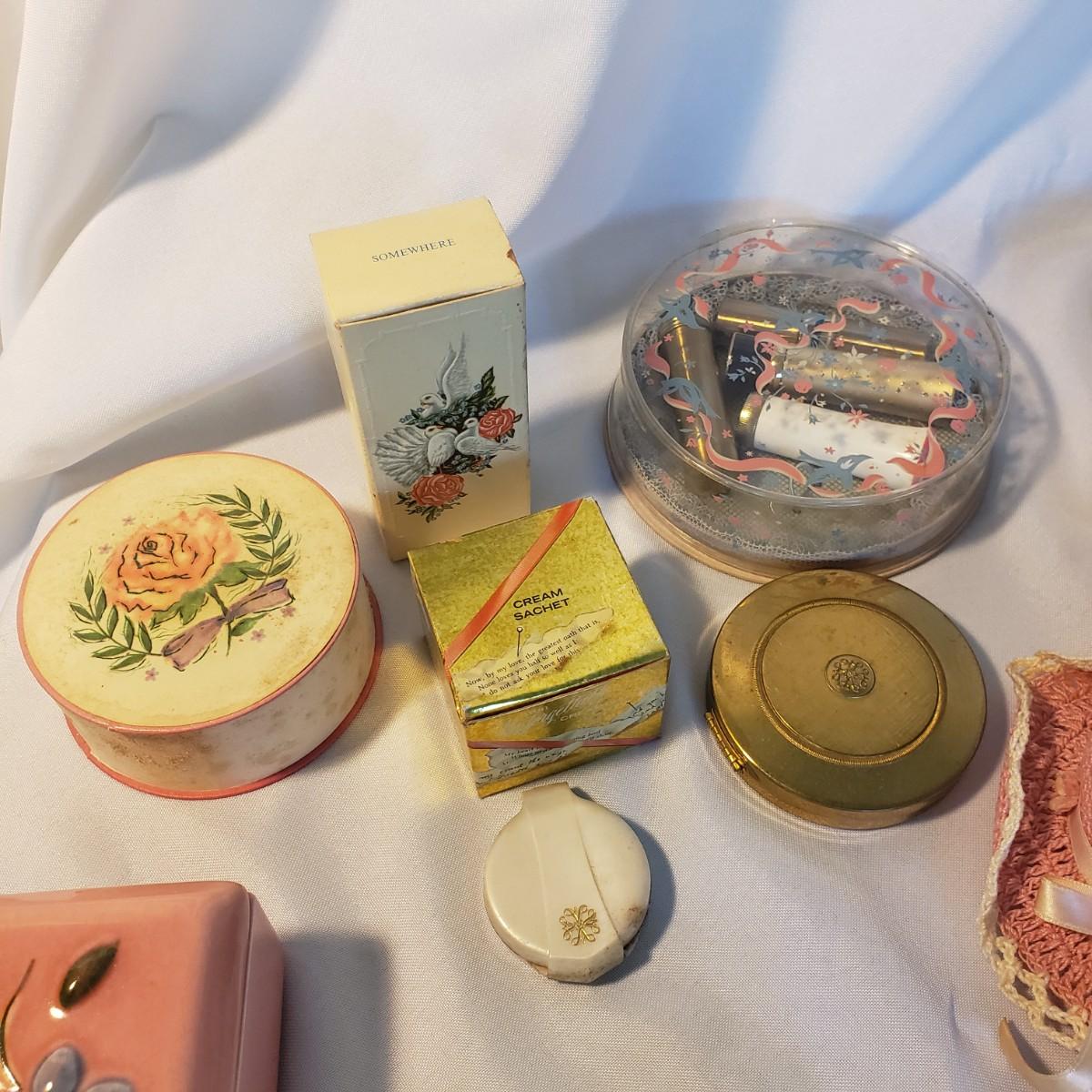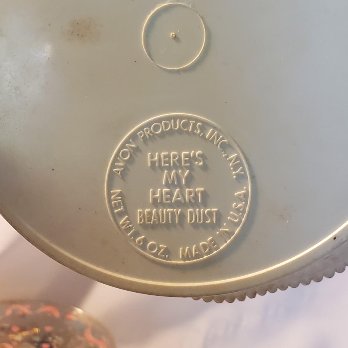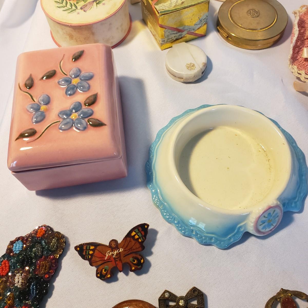 This large lot features some sweet vintage items. There is some vintage Avon with makeup still in them! The large plastic powder ",Here's My Heart" measures 6" x 2"H. The two ceramic dishes, one pink with a floral lid (4" x 3" x 2"H) and a blue collar bowl. The hand mirror, brush, and come have metal handles with a floral print on the backside. The bluebird is chalkware marked USA. The jewelry will take you back in time! The wooden rose pin is 2".