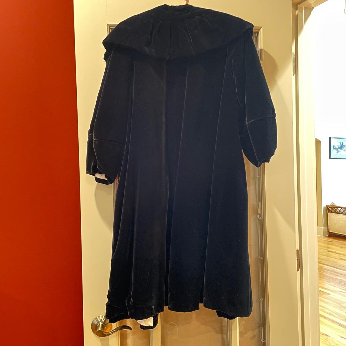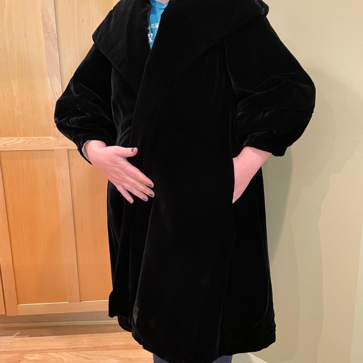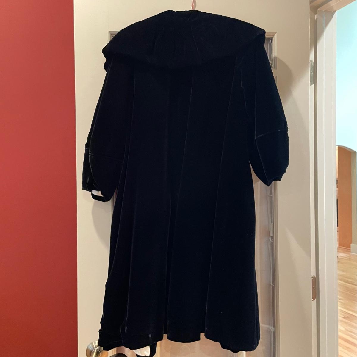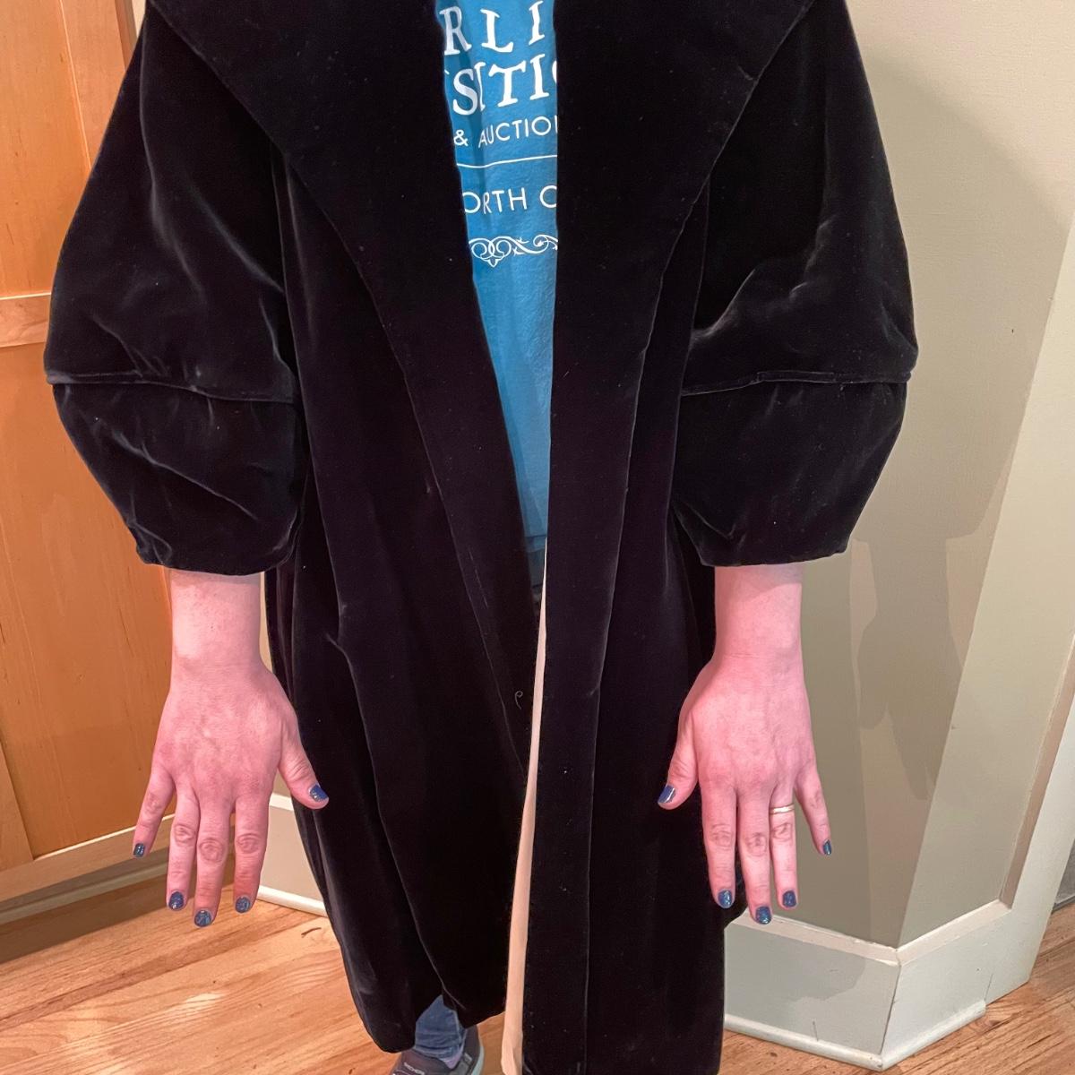Stunning velvet coat by Haggerty’s with 3/4 sleeves and calf length. Coat has shallow pockets on each side and has been stored in a garment bag. Coat appears to fit small to medium. See images. Shipping available.