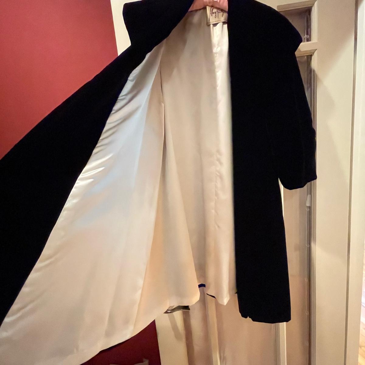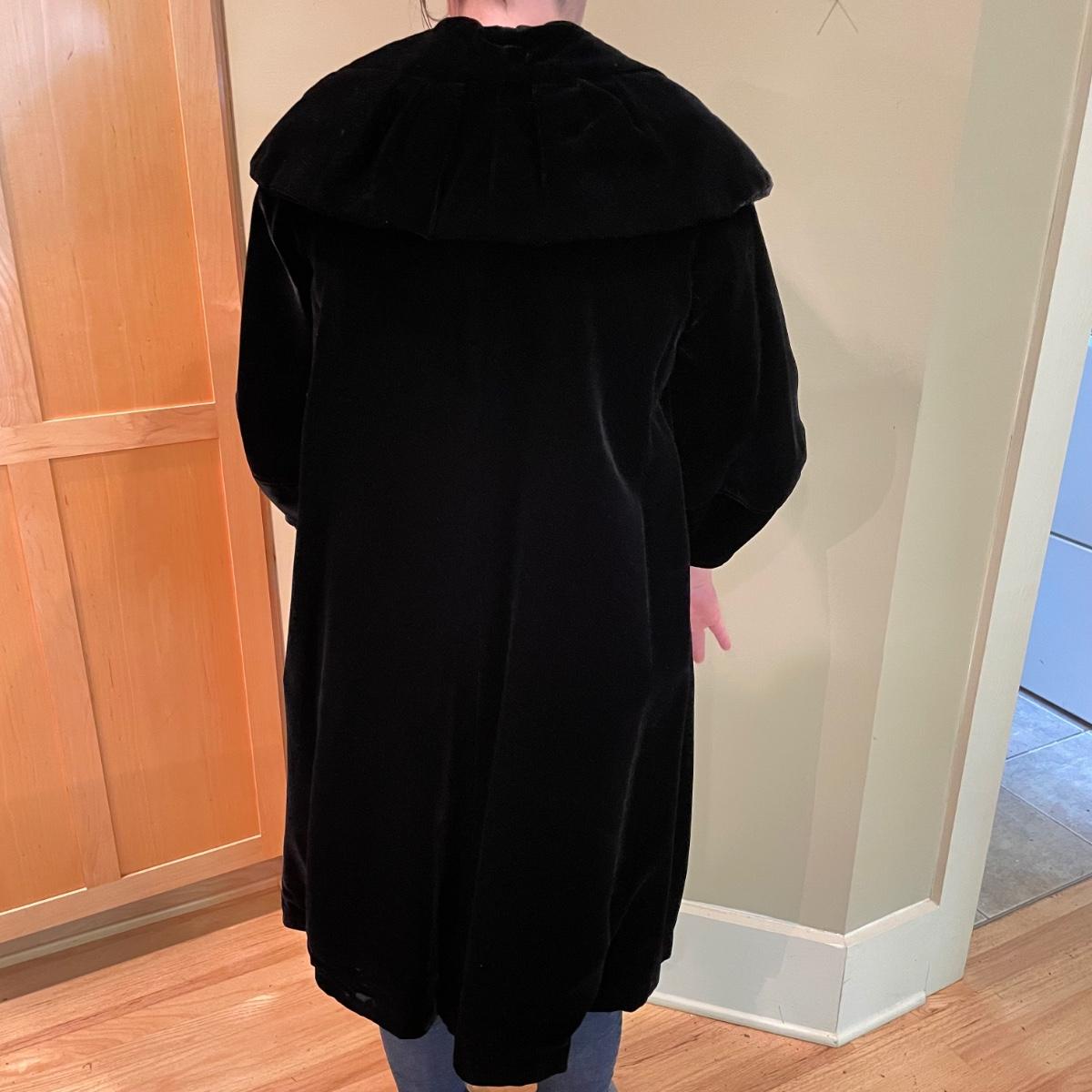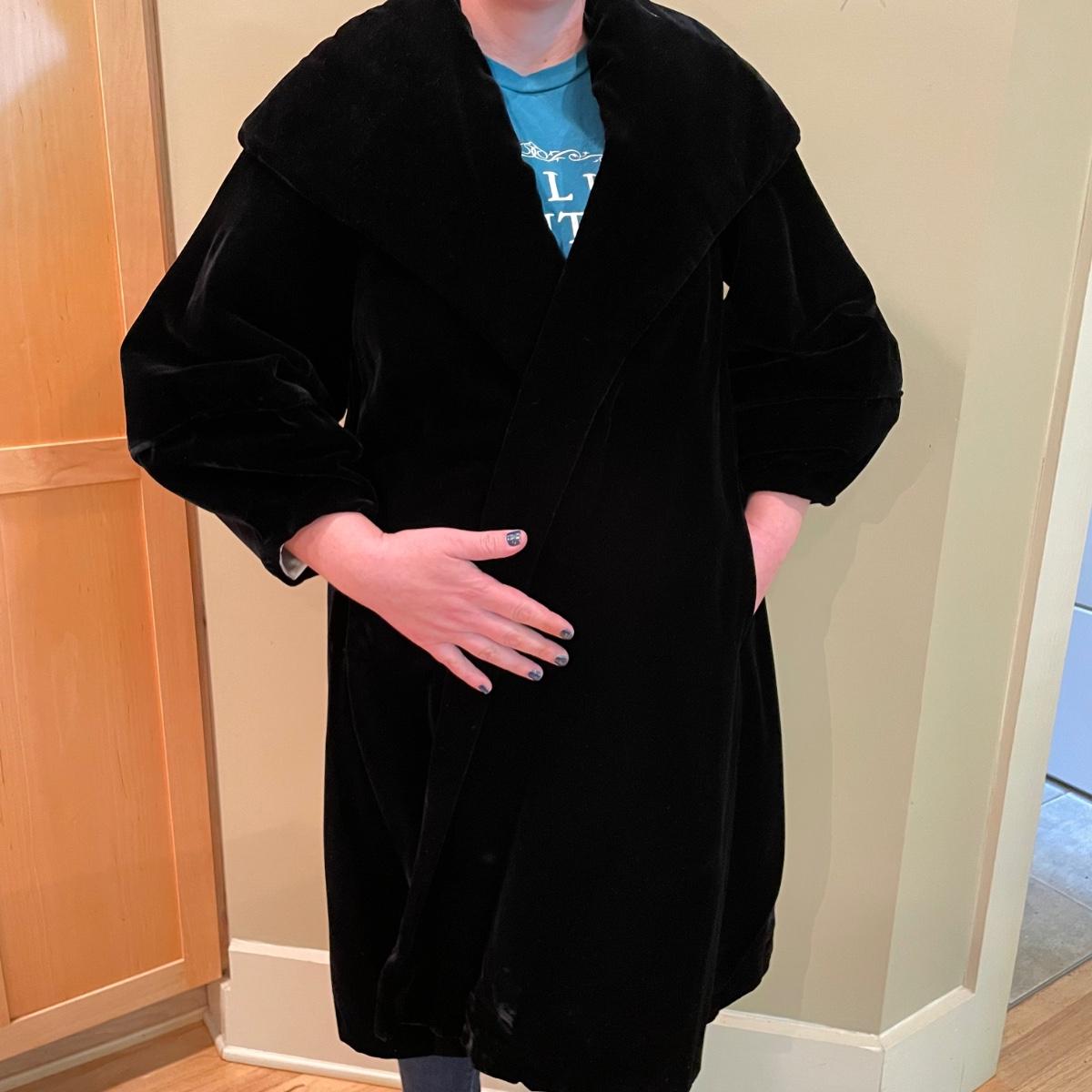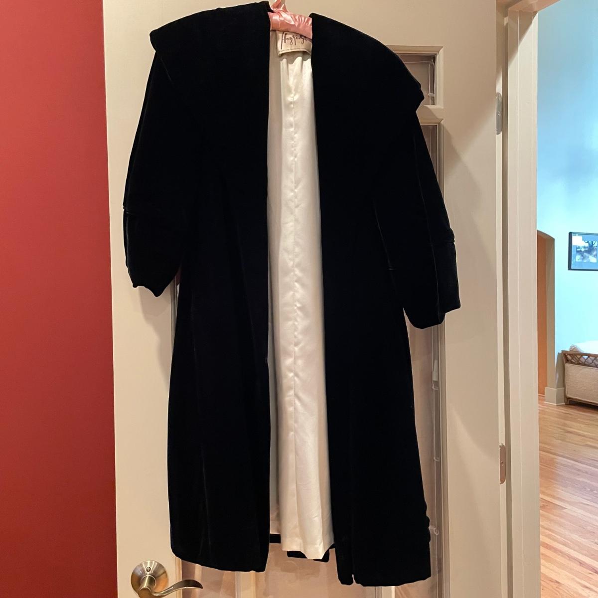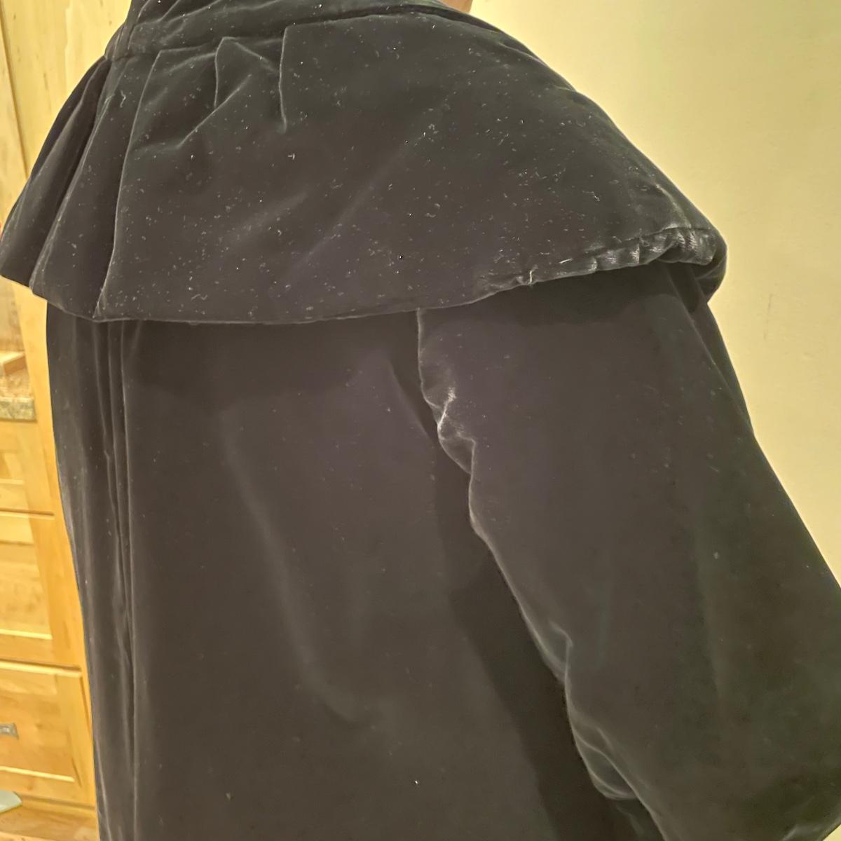 Stunning velvet coat by Haggerty’s with 3/4 sleeves and calf length. Coat has shallow pockets on each side and has been stored in a garment bag. Coat appears to fit small to medium. See images. Shipping available.