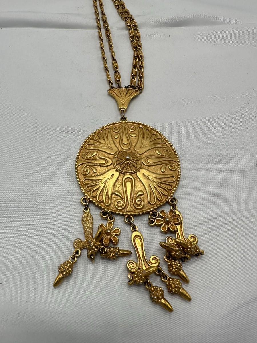 Vintage VENDOME Etruscan Revival White Wash Gold Tone Large Pendant Necklace
