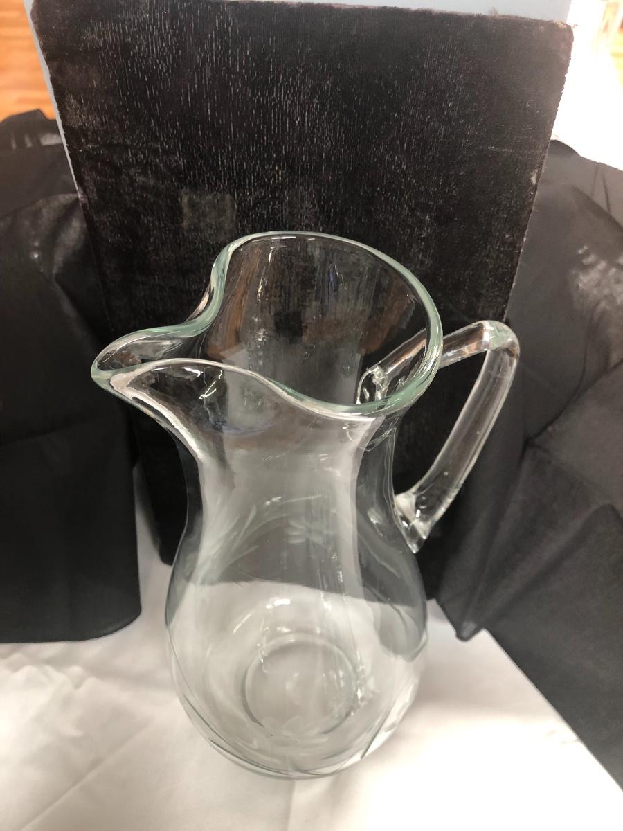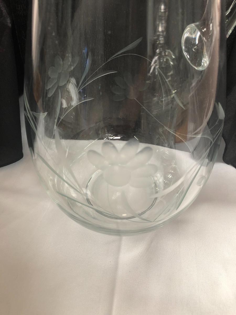 This pitcher is stunning. Cut crystal flowers on base Measures 12” high