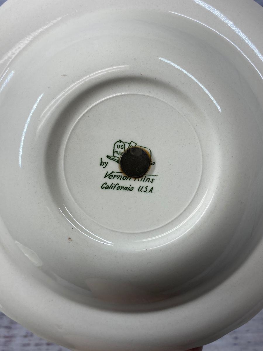 Vintage Vernon Kilns FRD cream pitcher, lidded sugar bowl, and handled candy dish. Cute farmhouse decor with scalloped edges, green plaid and rooster weathervane design. All pieces are in good condition. A bit of discolor/wear to the metal handle of candy dish from age.