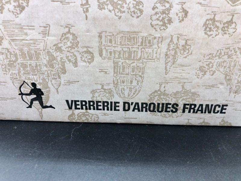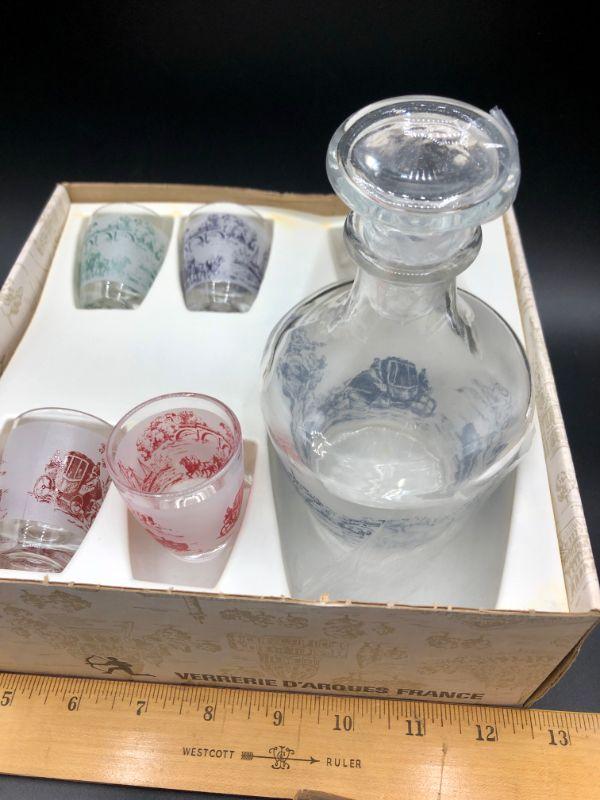 Vintage Verrerie D'Arques France Decanter Set. Unused in original box. Comes with decanter and 4 shot glass size cordial glasses. Transferware style scenery pictures on all pieces. Great Condition.