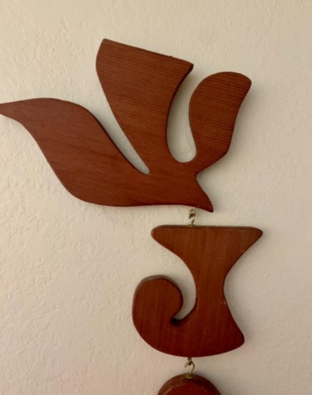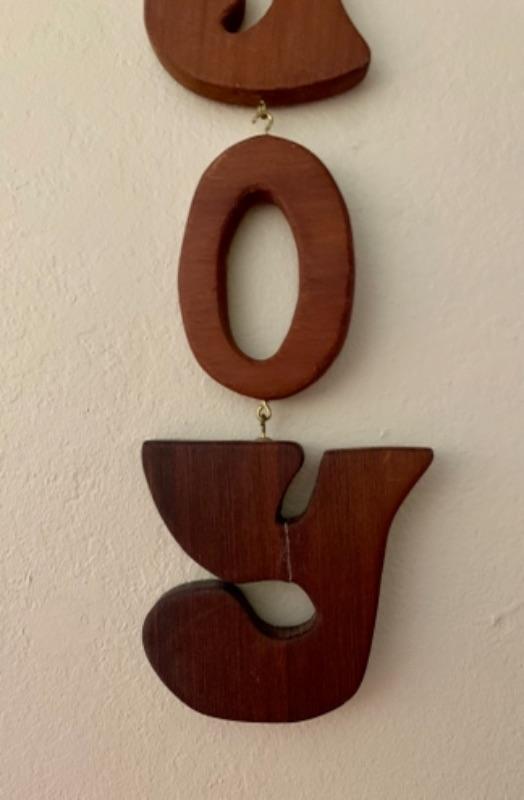 Handmade in 1970s. Handmade letters spell out "JOY" vertically with a dove at the very top. Letters are connected with hooks. The Y has been repaired at some point. Measures 25" when put together. Each letter is between 5-5 1/4" and the dove is 6 1/2"