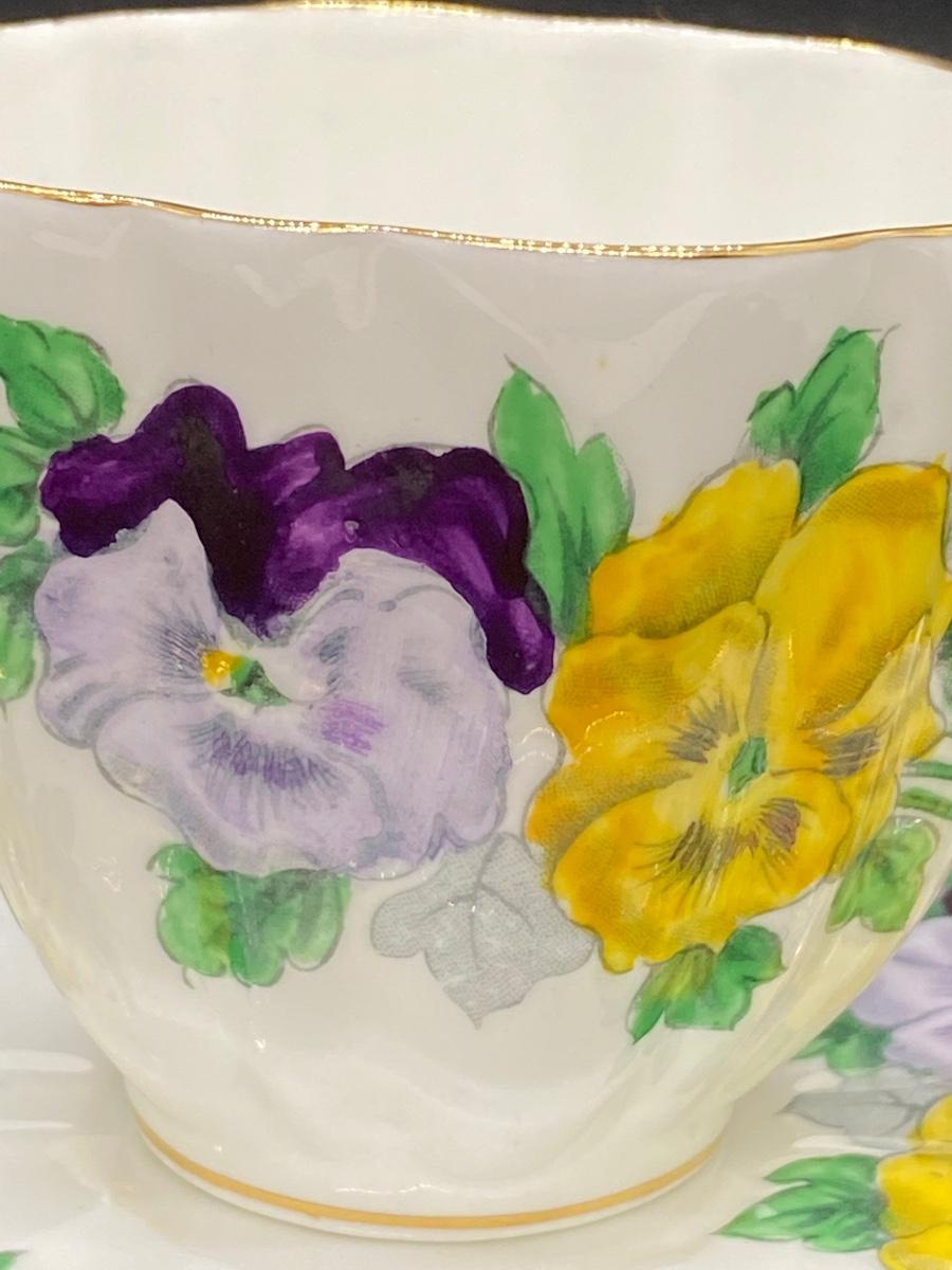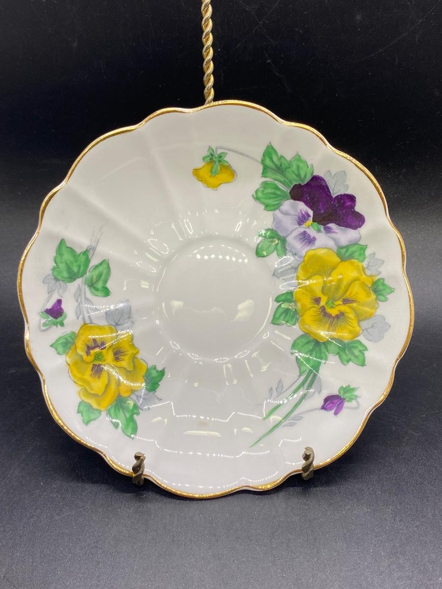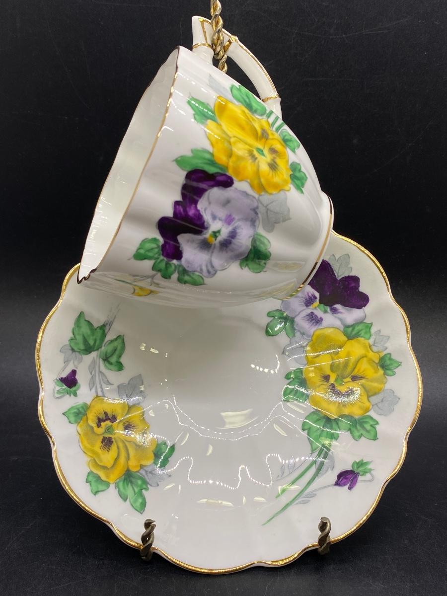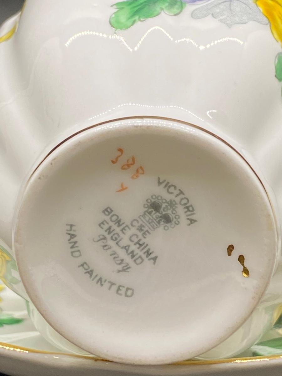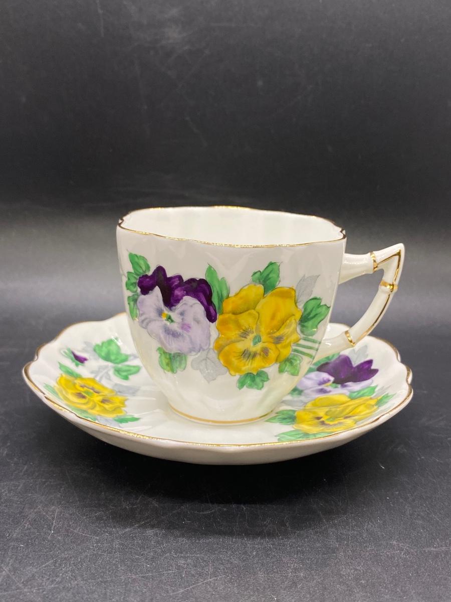 Victoria C&E bone china teacup & saucer. Hand painted yellow and purple pansy design with gold trim edge. Good condition, no chips.