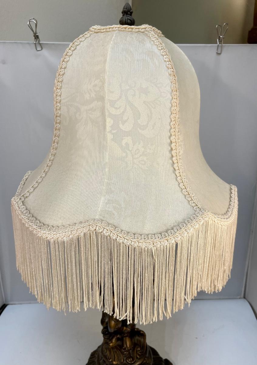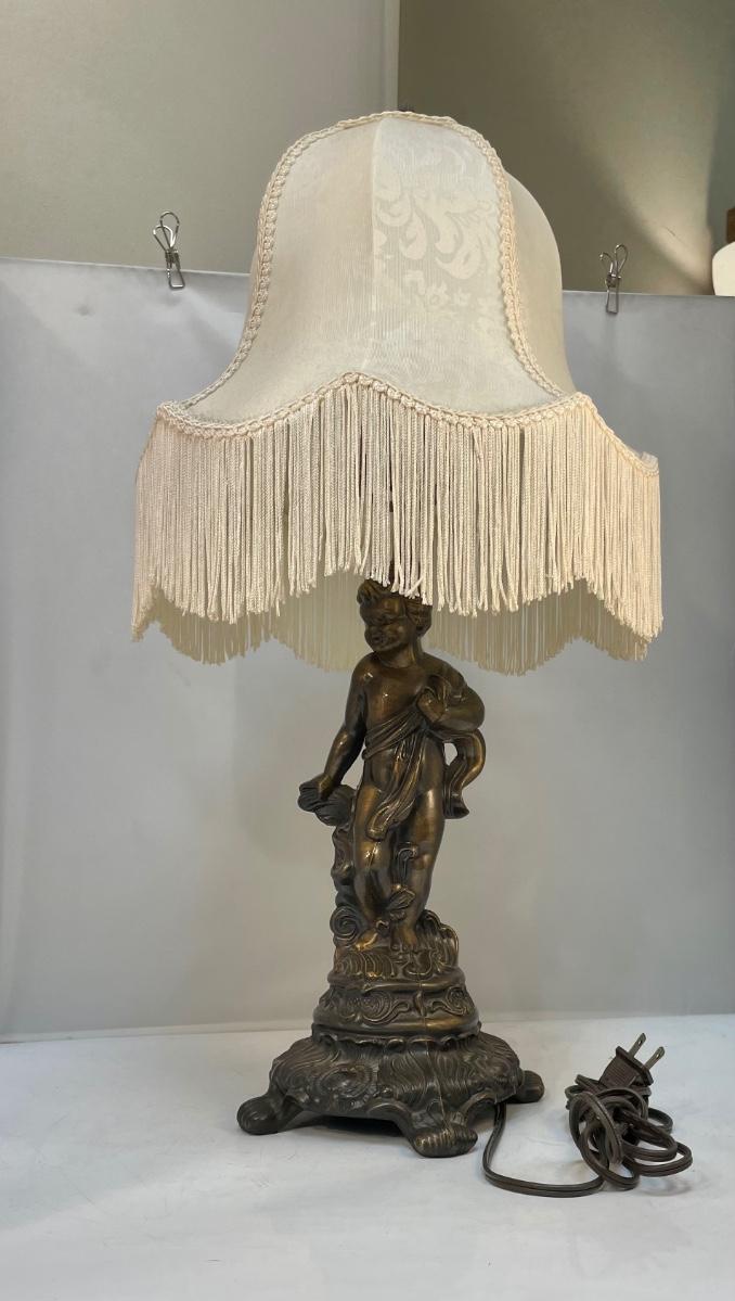 Vintage Victorian Brass Figurine Figural Table Parlor Lamp with Fringed Shade