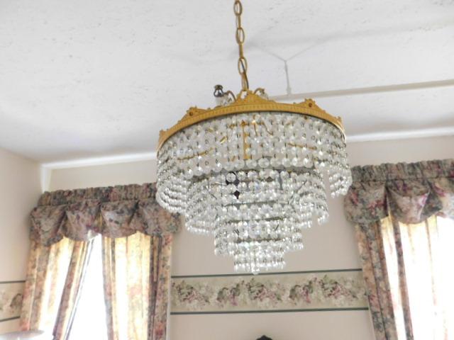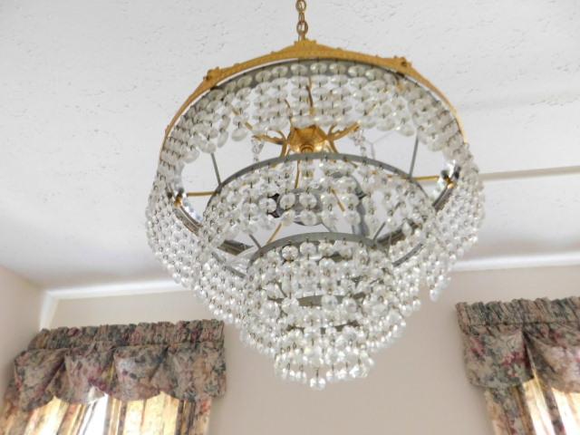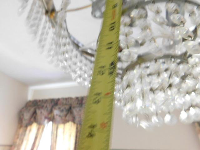 Vintage Victorian Cascading Crystal Prism Chandelier bring tools and ladder to remove from ceiling
