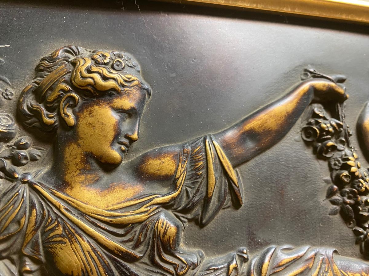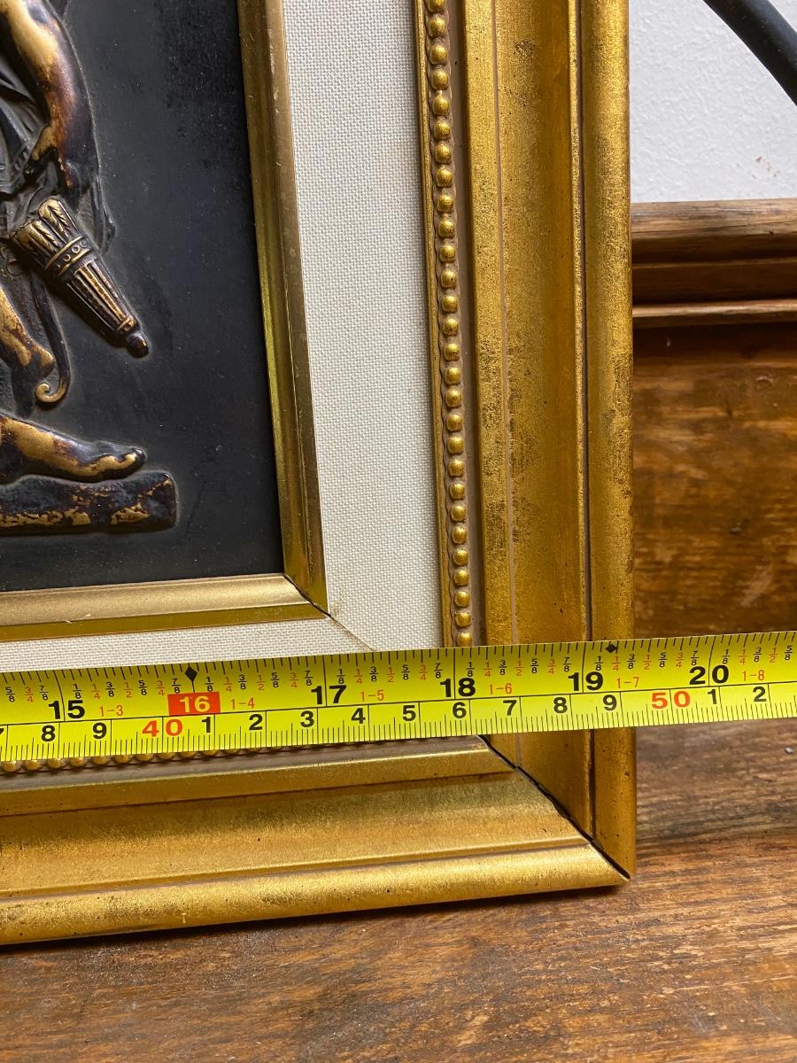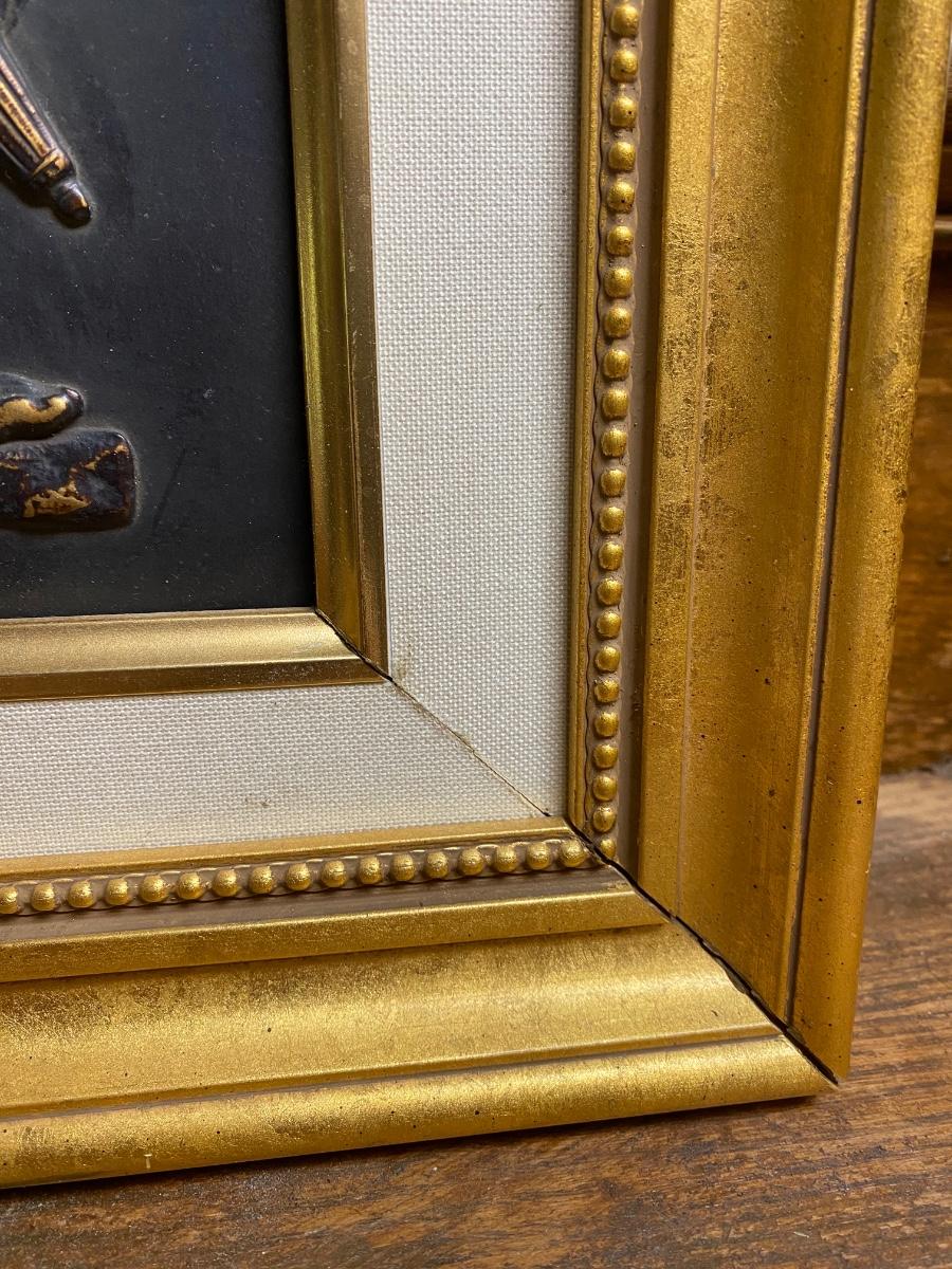 Victorian era pressed metal panel set in a gold painted wood frame.Approx 19Lx14"H