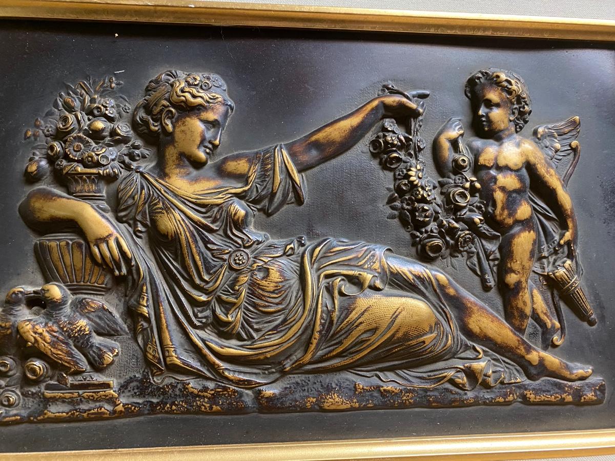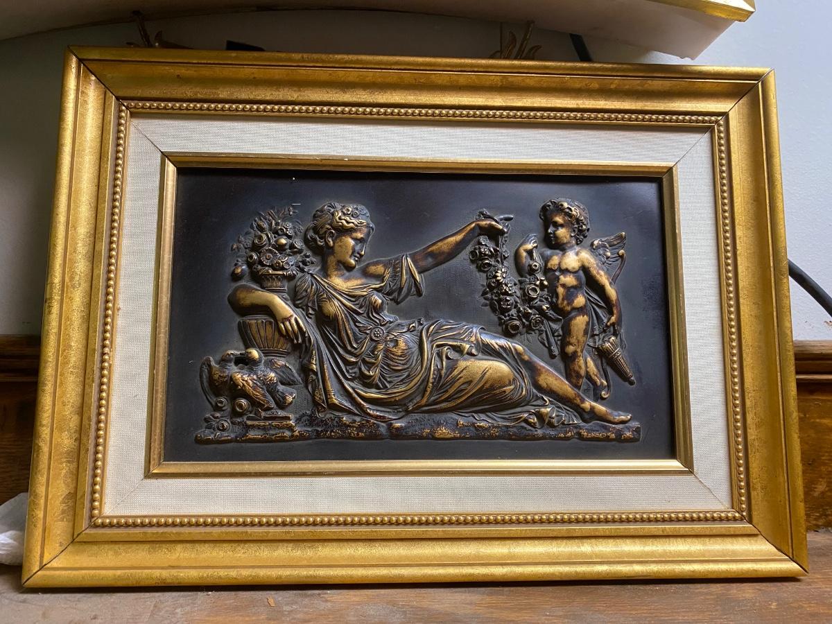 VINTAGE VICTORIAN woman with CHERUB METAL PANEL IN GOLDTONE FRAME