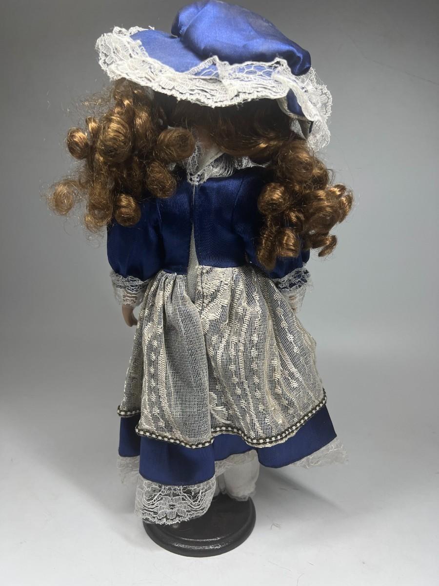 Vintage Victorian Dressed Porcelain Collector Doll with Stand. Good previously displayed condition.