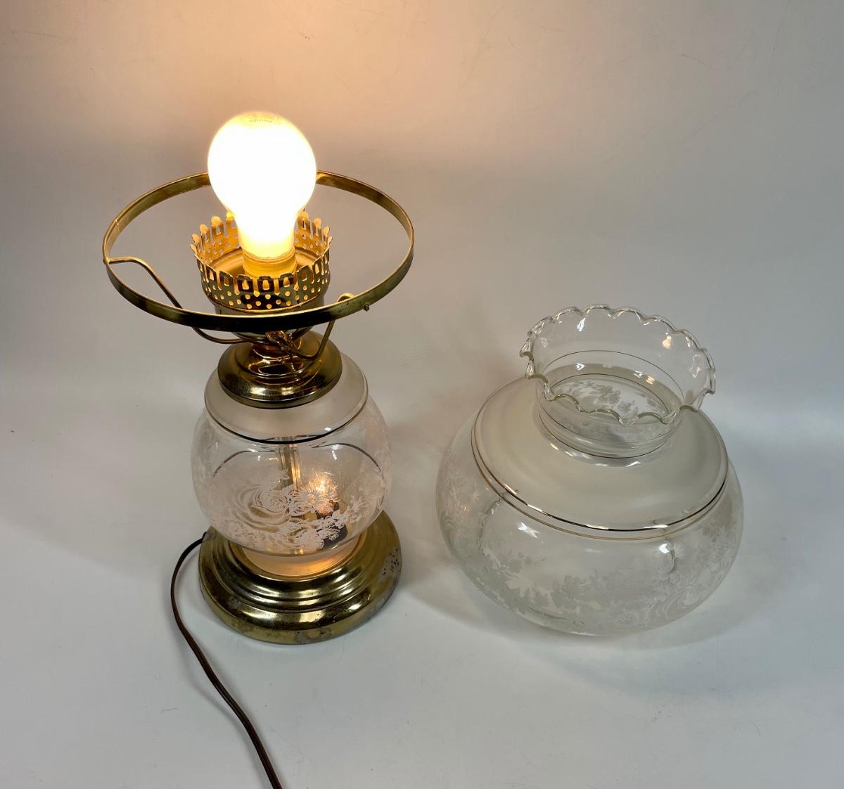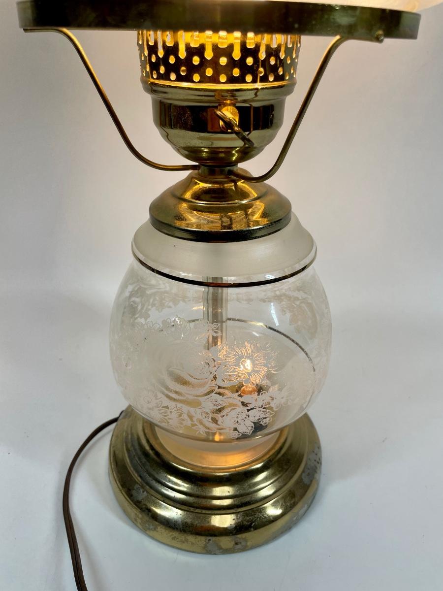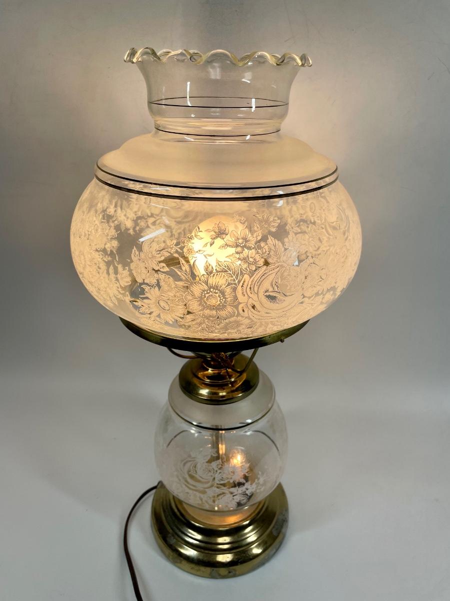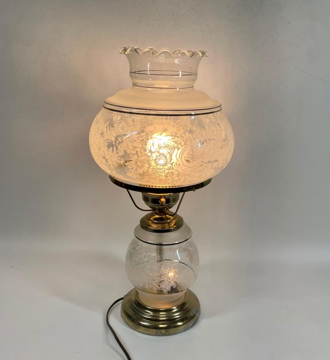 Vintage lamp with frosted and white-painted floral designs. Lamp is approx. 20” tall and 10” across. Does not include an oil lamp style glass insert, see photos. Tested, lights in both section work.