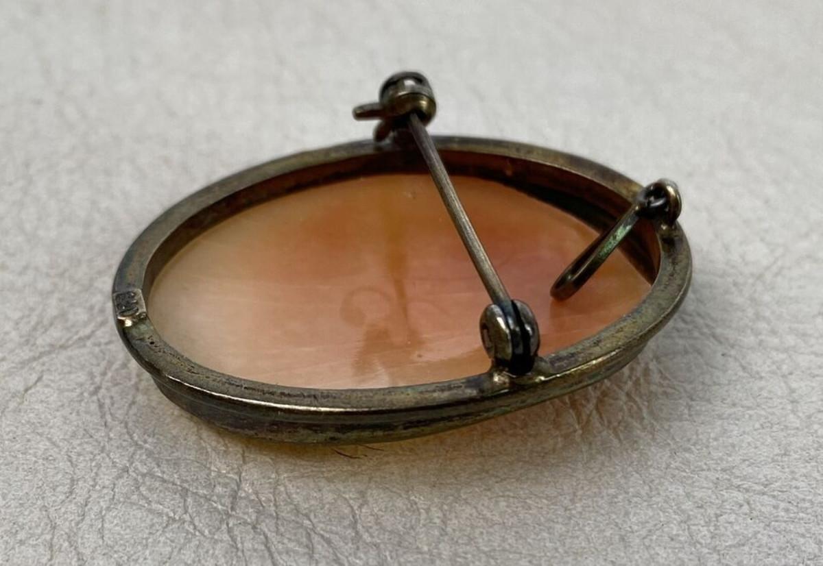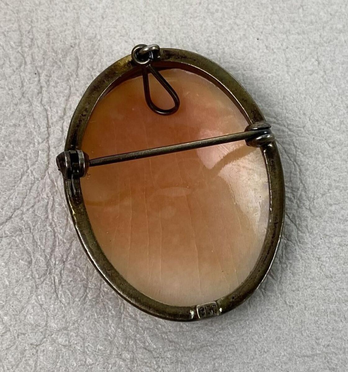Framed in 850 fine silver here is a carved shell cameo in excellent condition...unknown maker? Artist cipher on back of shell...33mm or 1 5/16:...a hoop or a pinback...as shown...Victorian style…