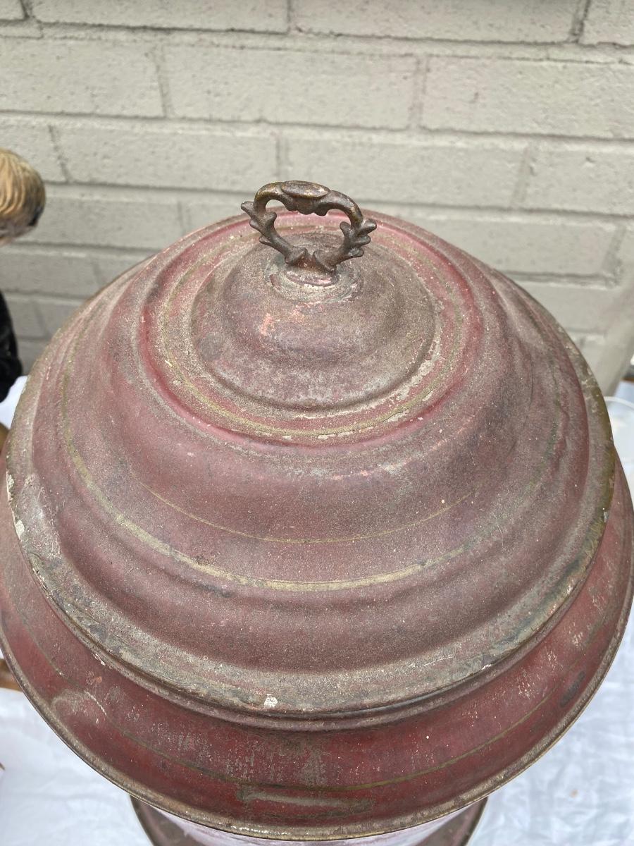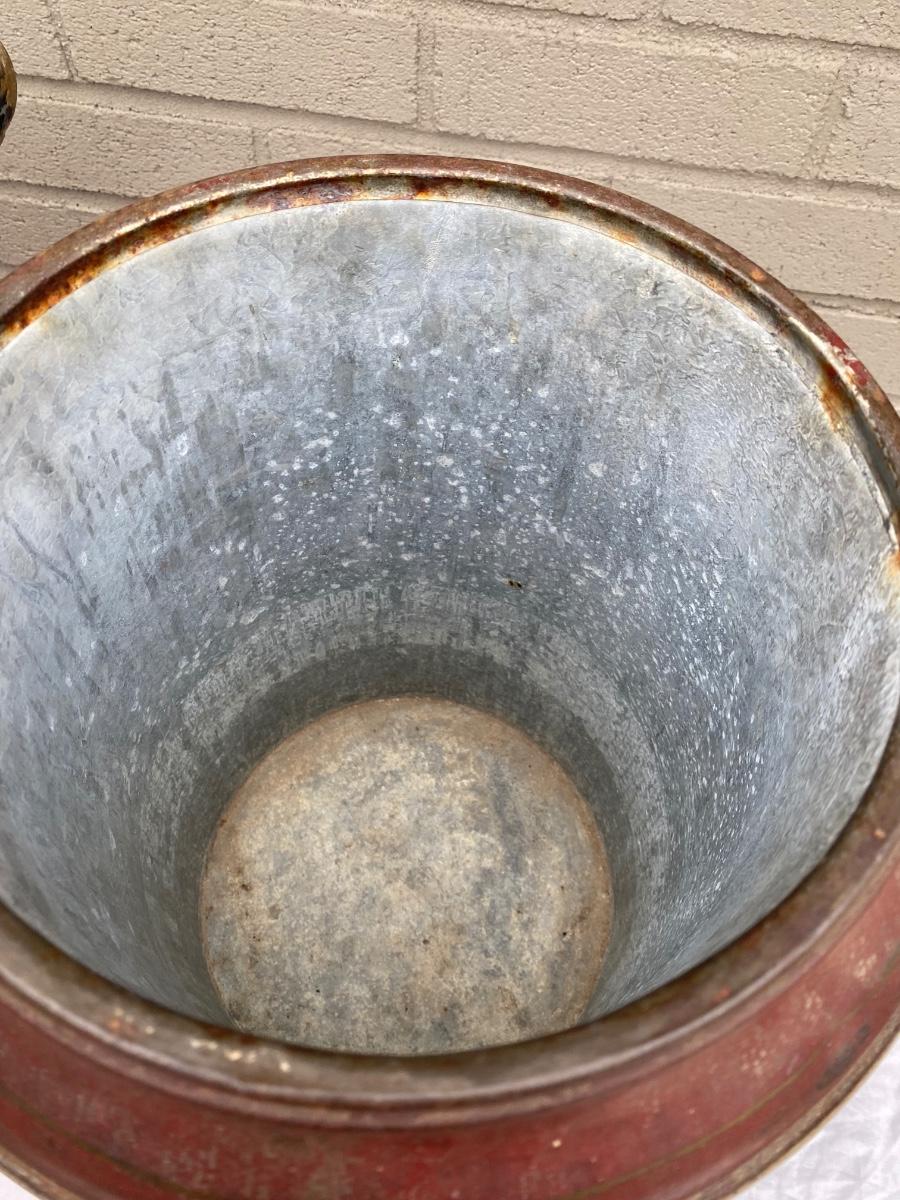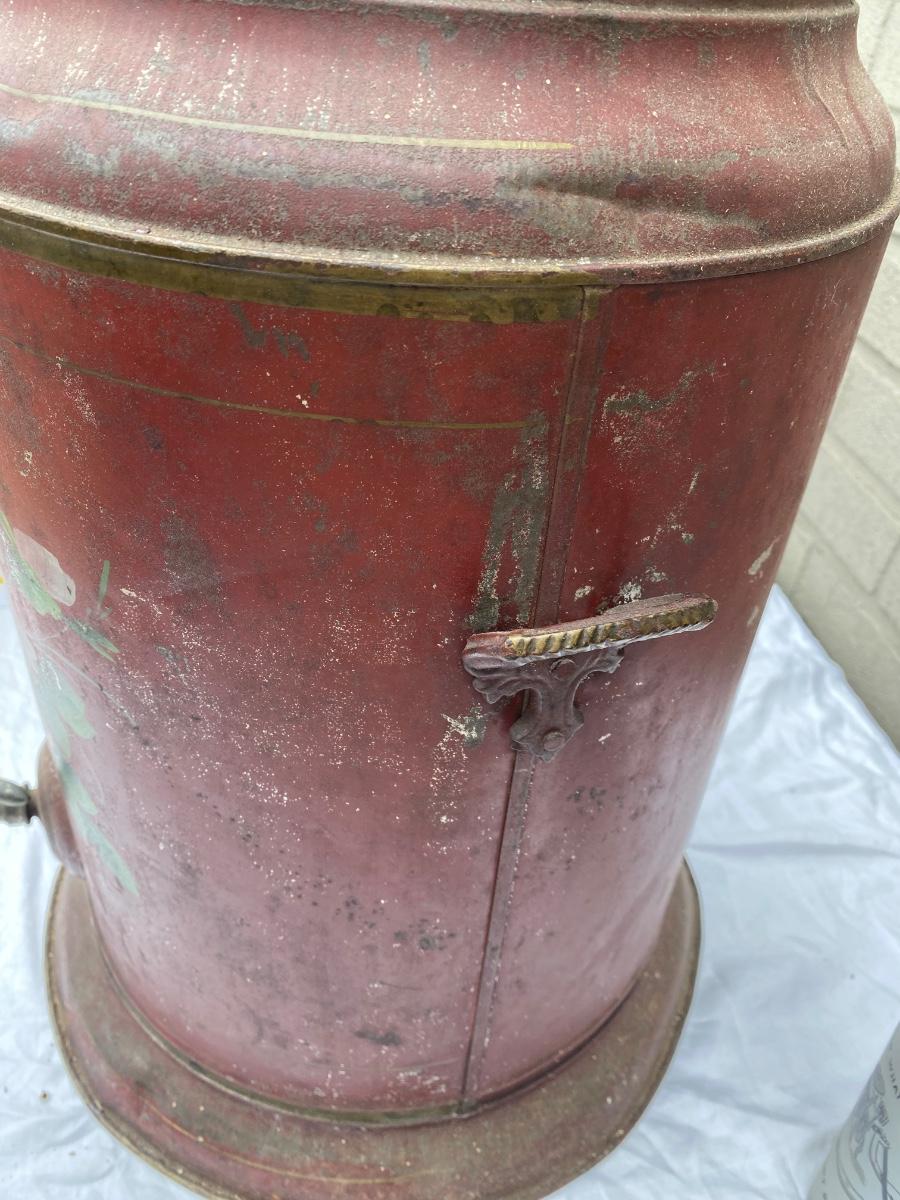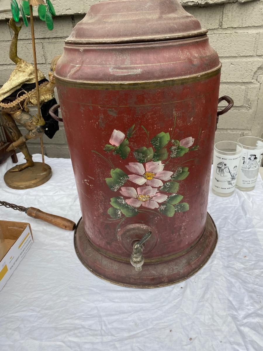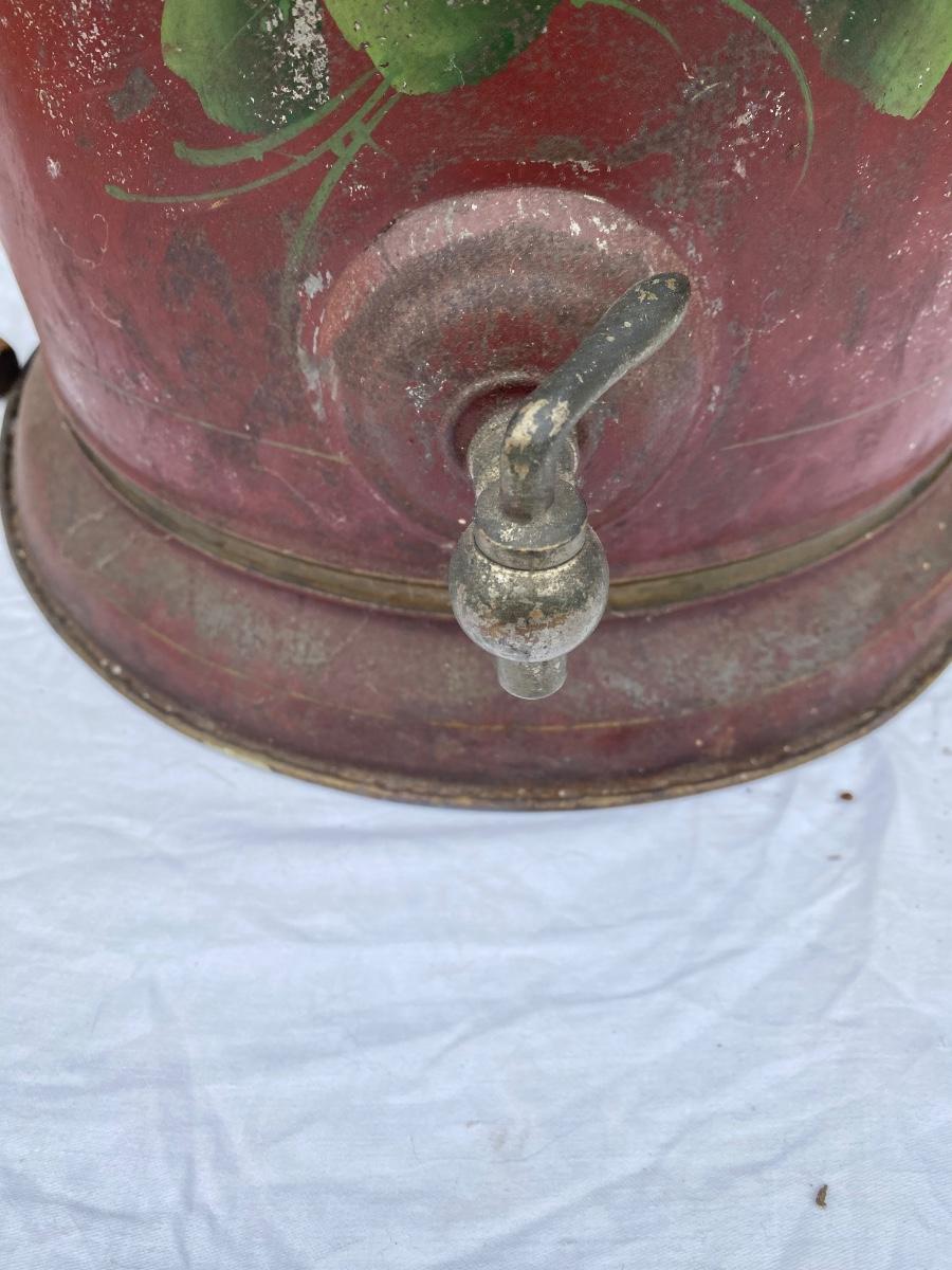 Vintage Victorian Tole Water Dispenser. Handle on each side, spout at the front, finial on the lid,metal inside, painted flwer design o n the front. 21" high
