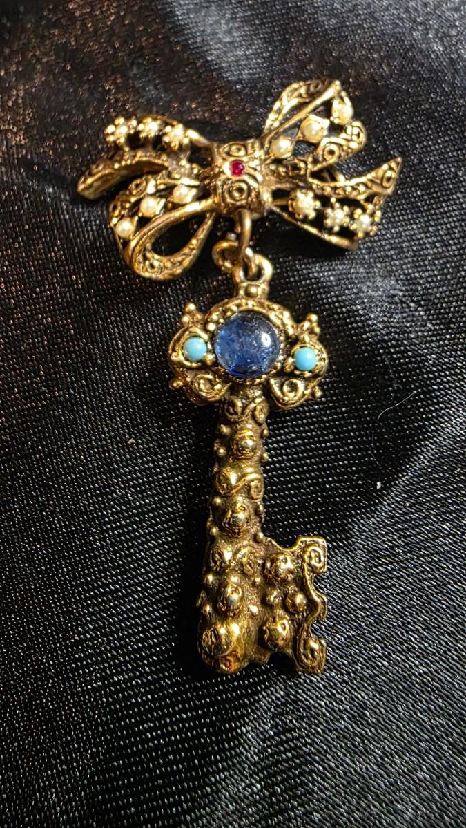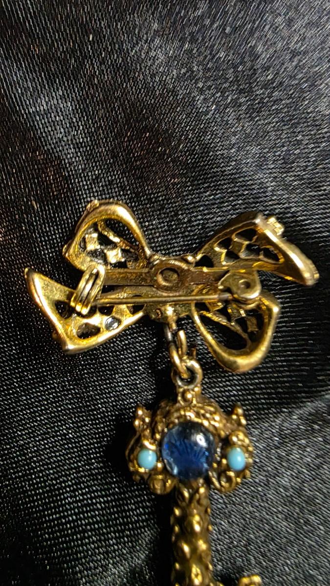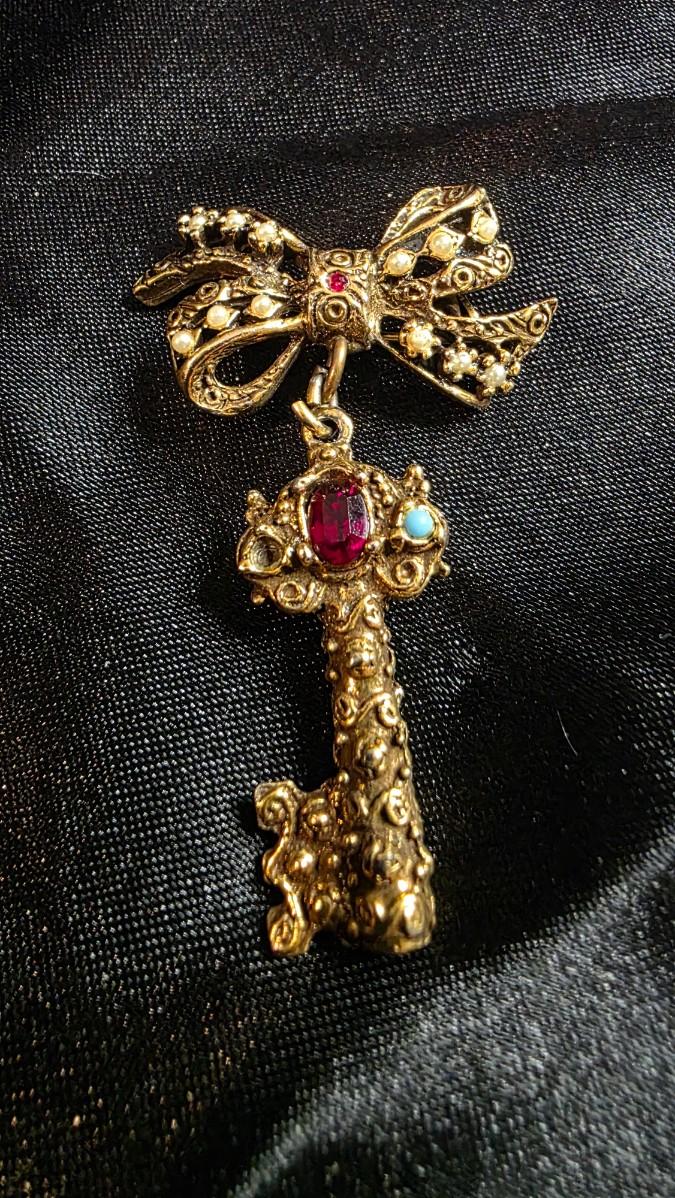 Vintage Victorian-Style Bow & Jeweled Key Dangle Brooch — Ornate Gold-Tone Filigree with Faux Pearls & Gem Accents